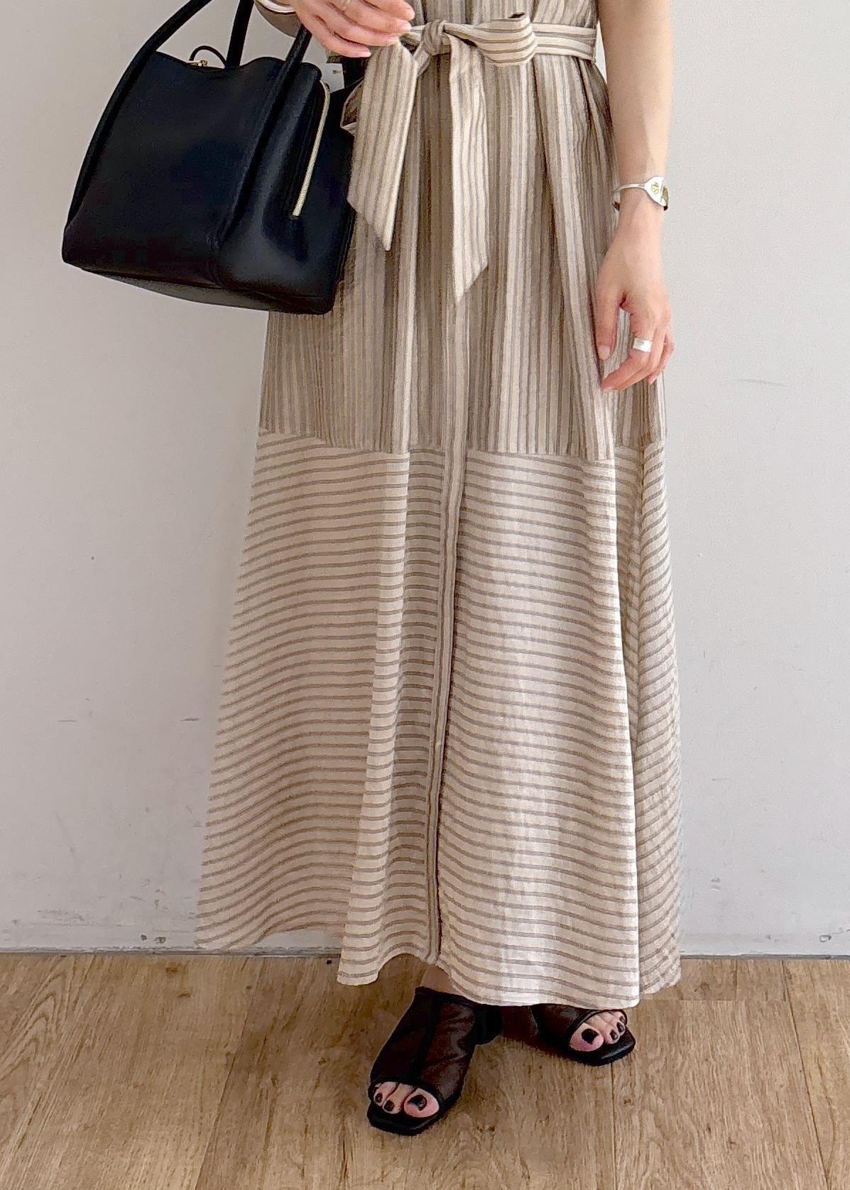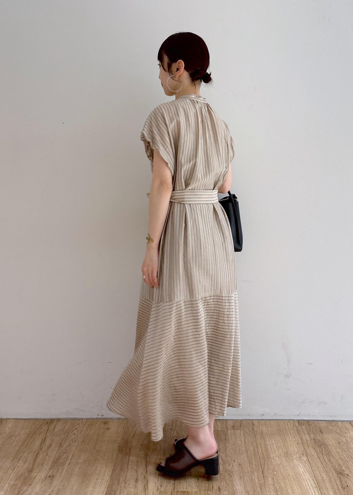 ストライプが爽やかなワンピースです。ワンサイズですが、小柄な方も大きすぎないサイズです。155cmでヒールを履かなくても引きずりません。
