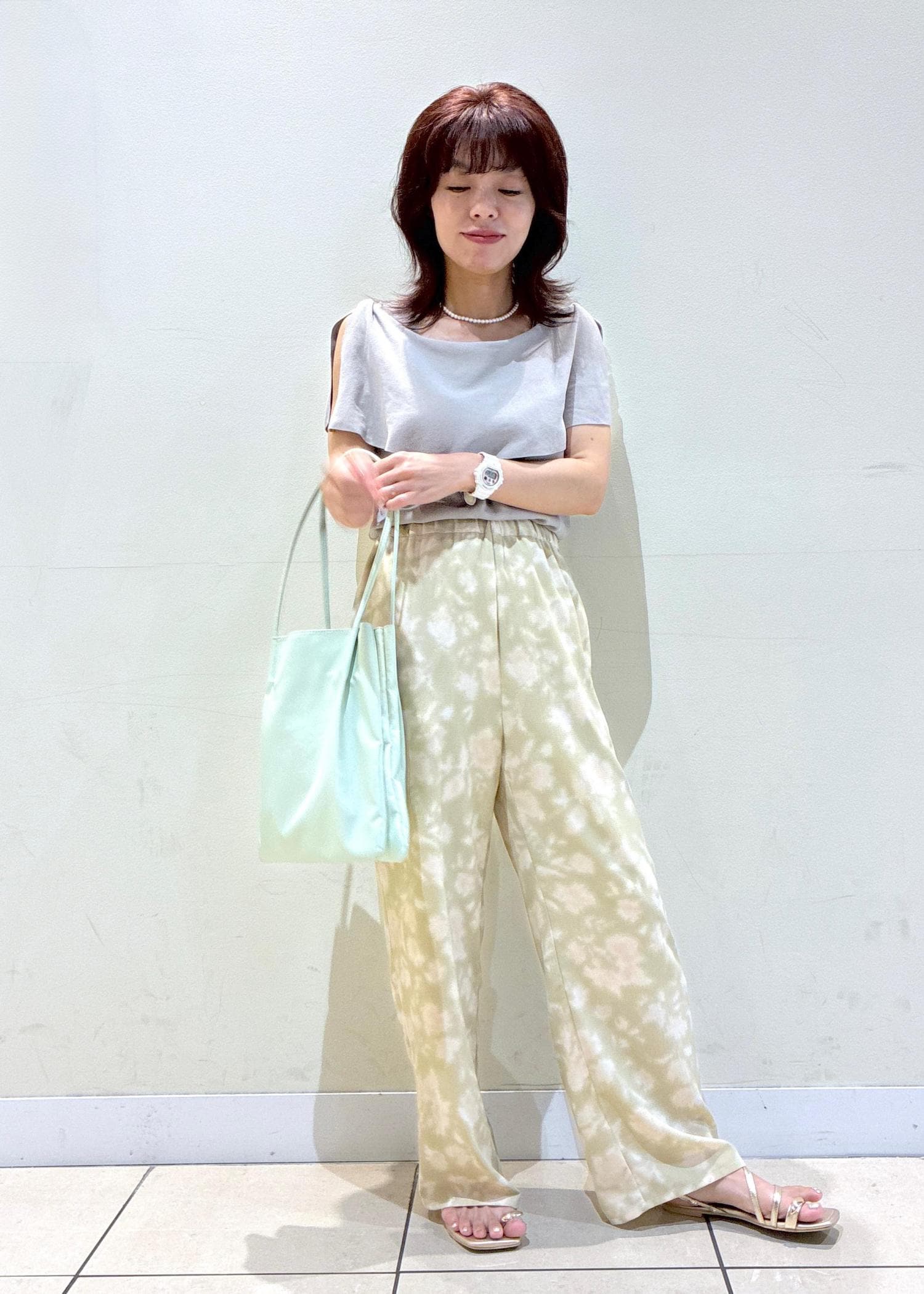 リラックスパンツに着映えニット合わせであくまでも女性らしく カジュアルになりすぎないようにスタイリングしました。色をグレー〜グリーン系の優しいカラーでまとめたのもポイントです。