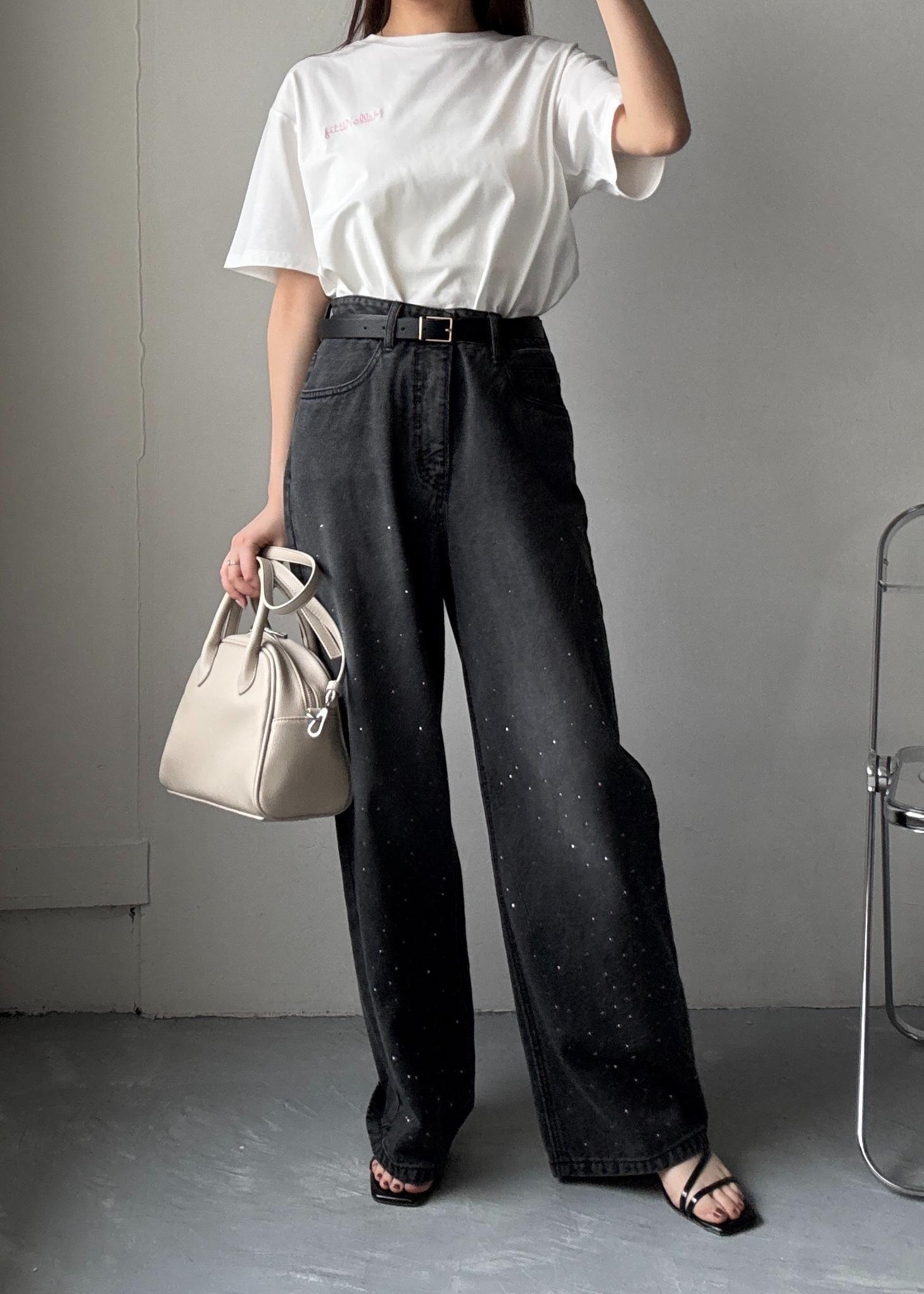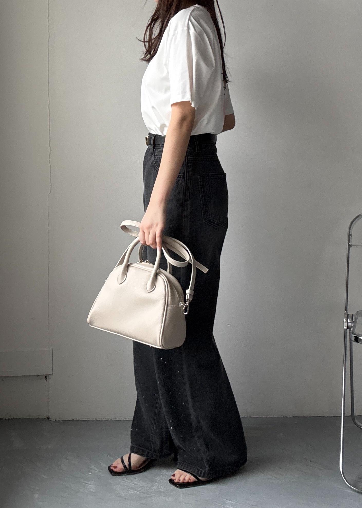 プリントに目が行くように、ボトムスや小物はモノトーンで合わせたのがポイントです。