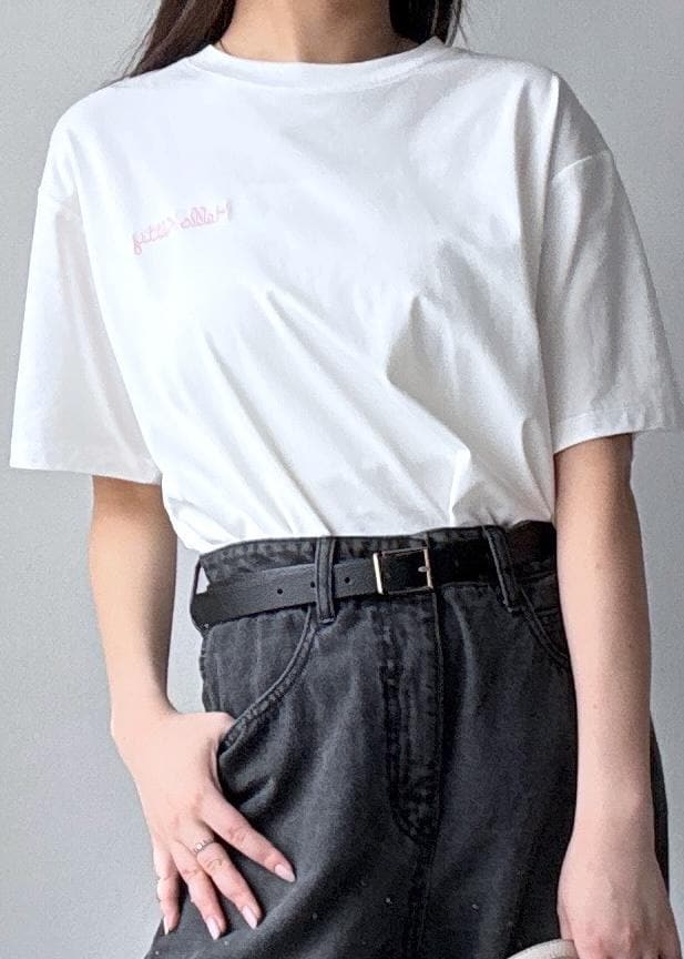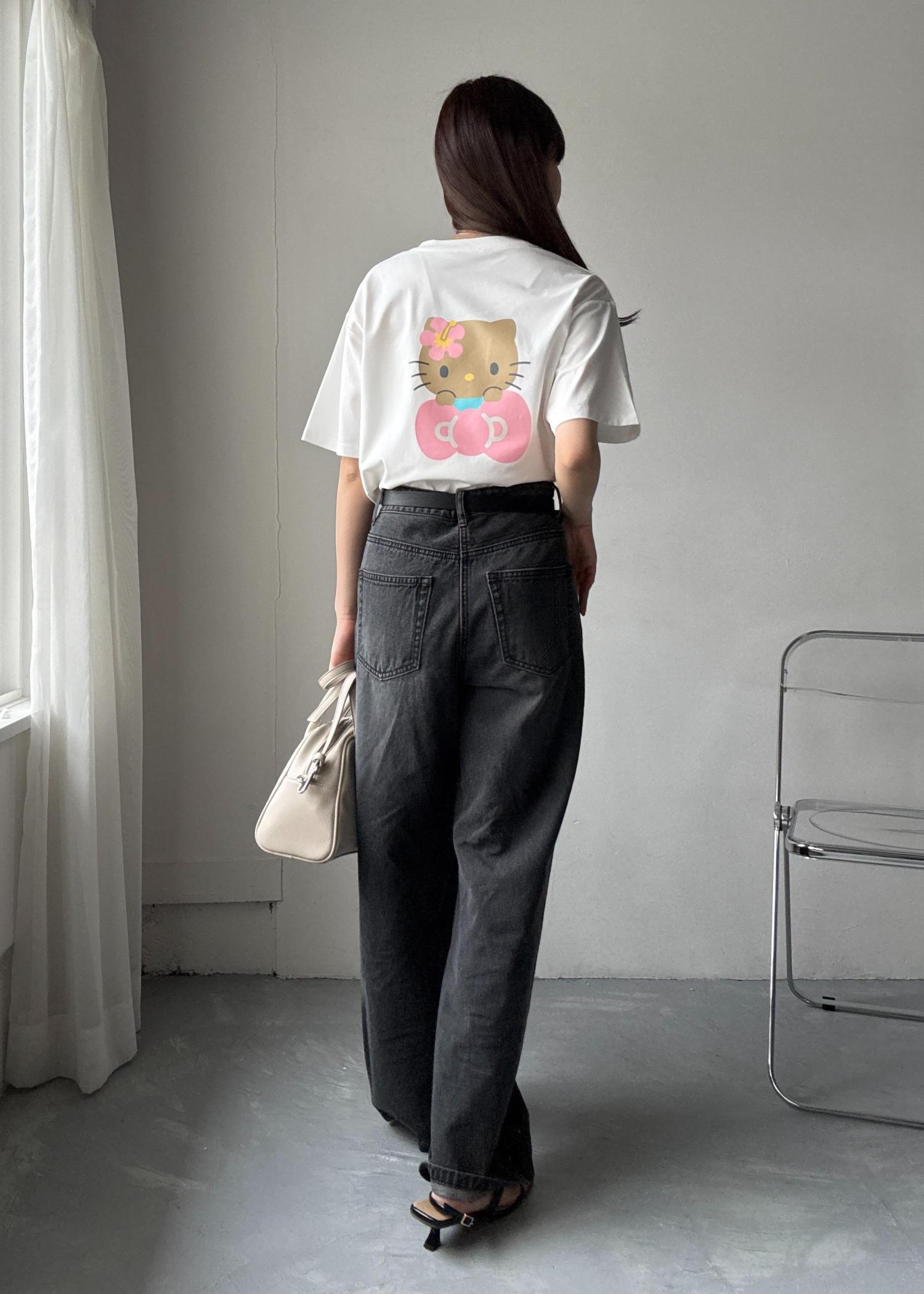 ハローキティのプリントが可愛いTシャツにブラックデニムを合わせた、カジュアルなコーディネートです。