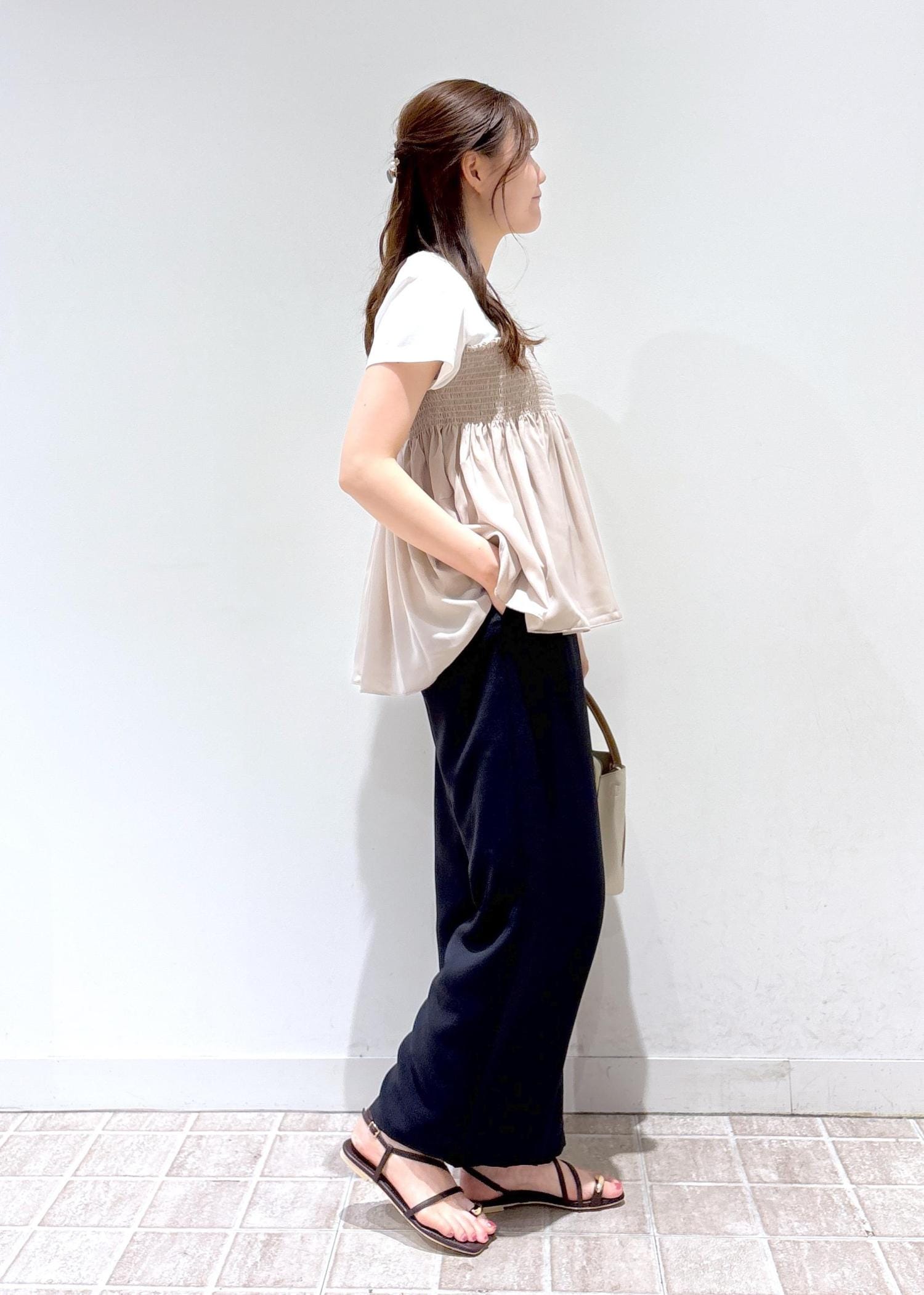 軽くて肌離れの良いボトムで暑い夏におすすめです。ウエストゴムで締め付けなく、お腹周りのラインも拾いません。裾丈はくるぶしにかかるくらいです。