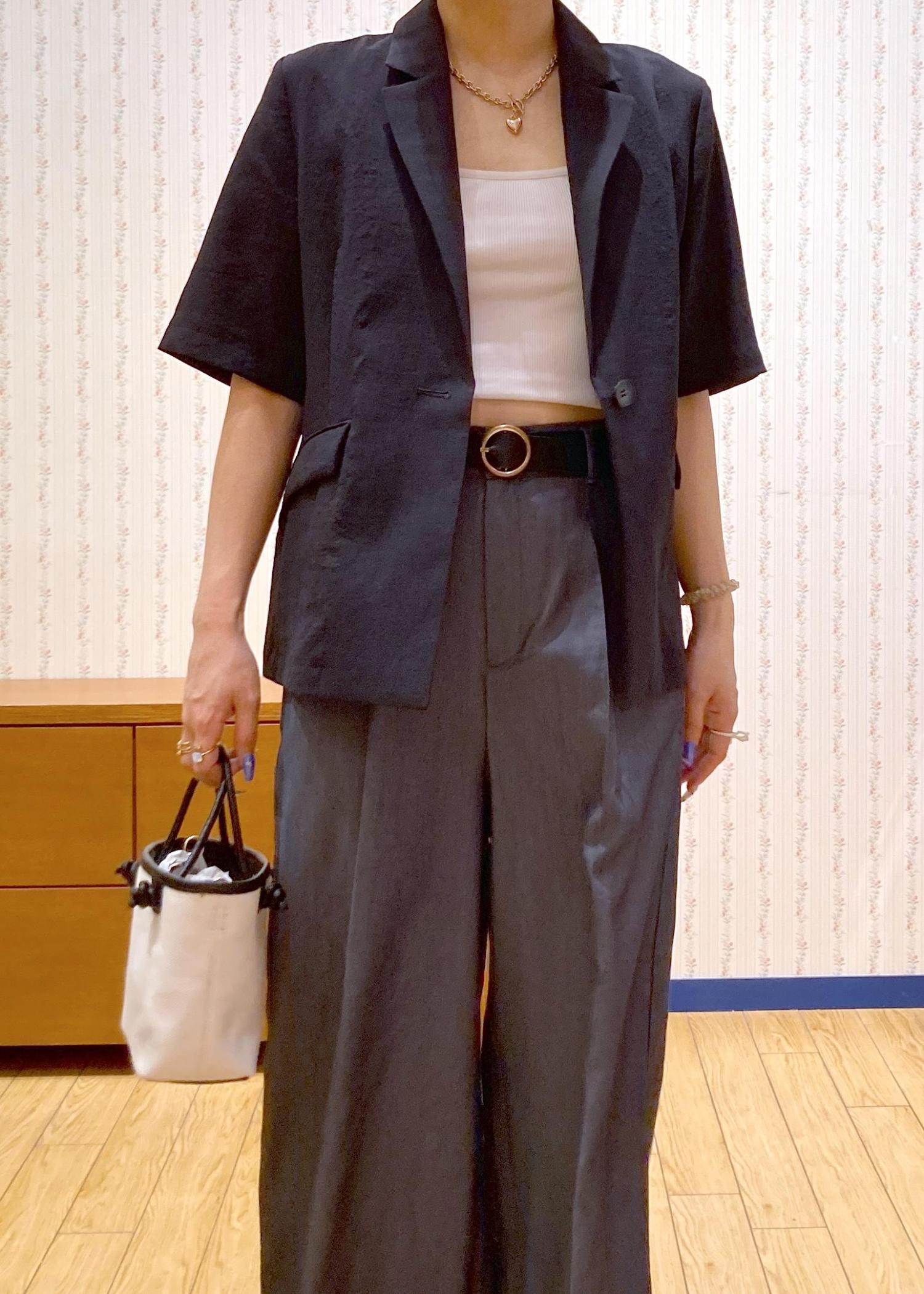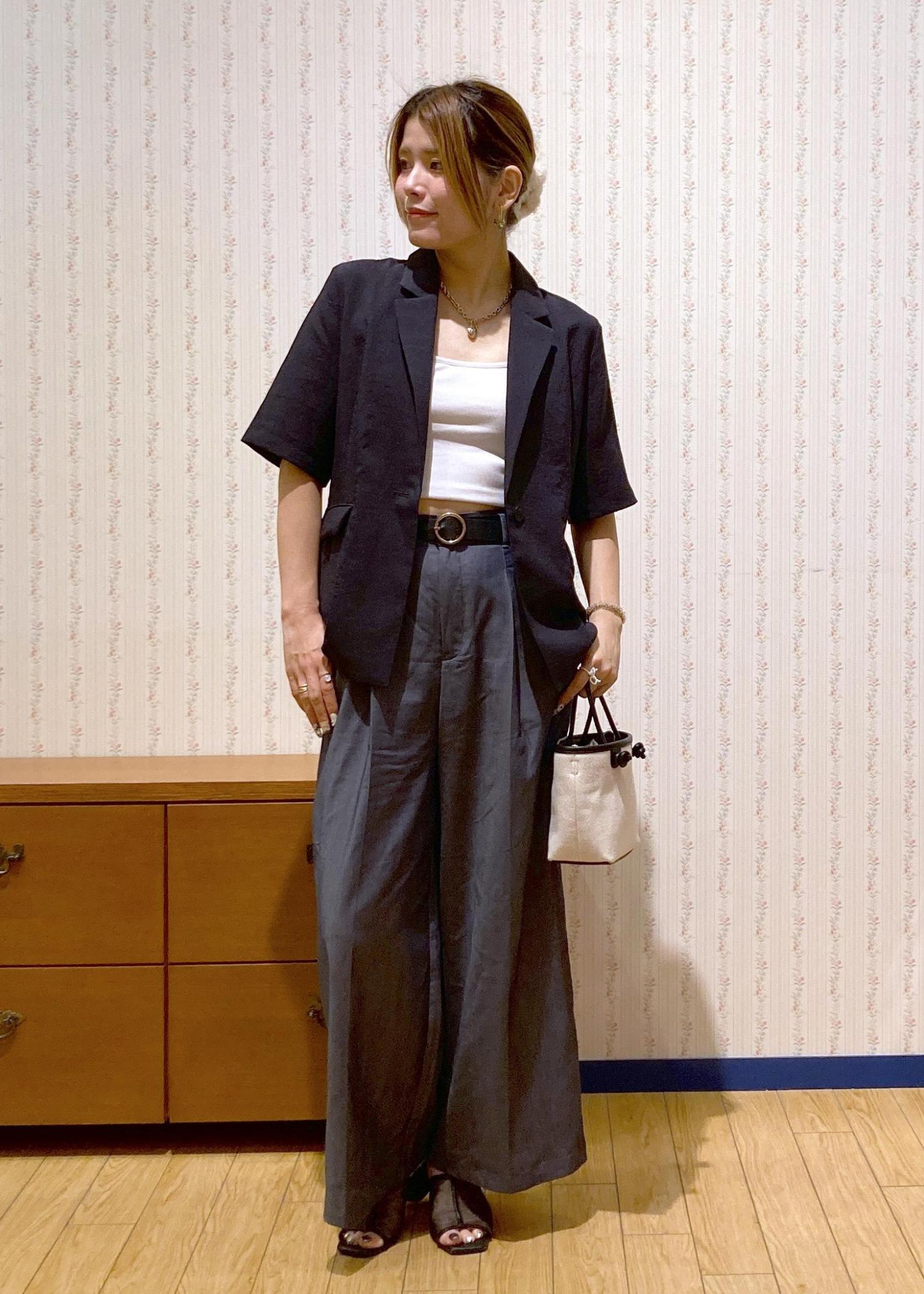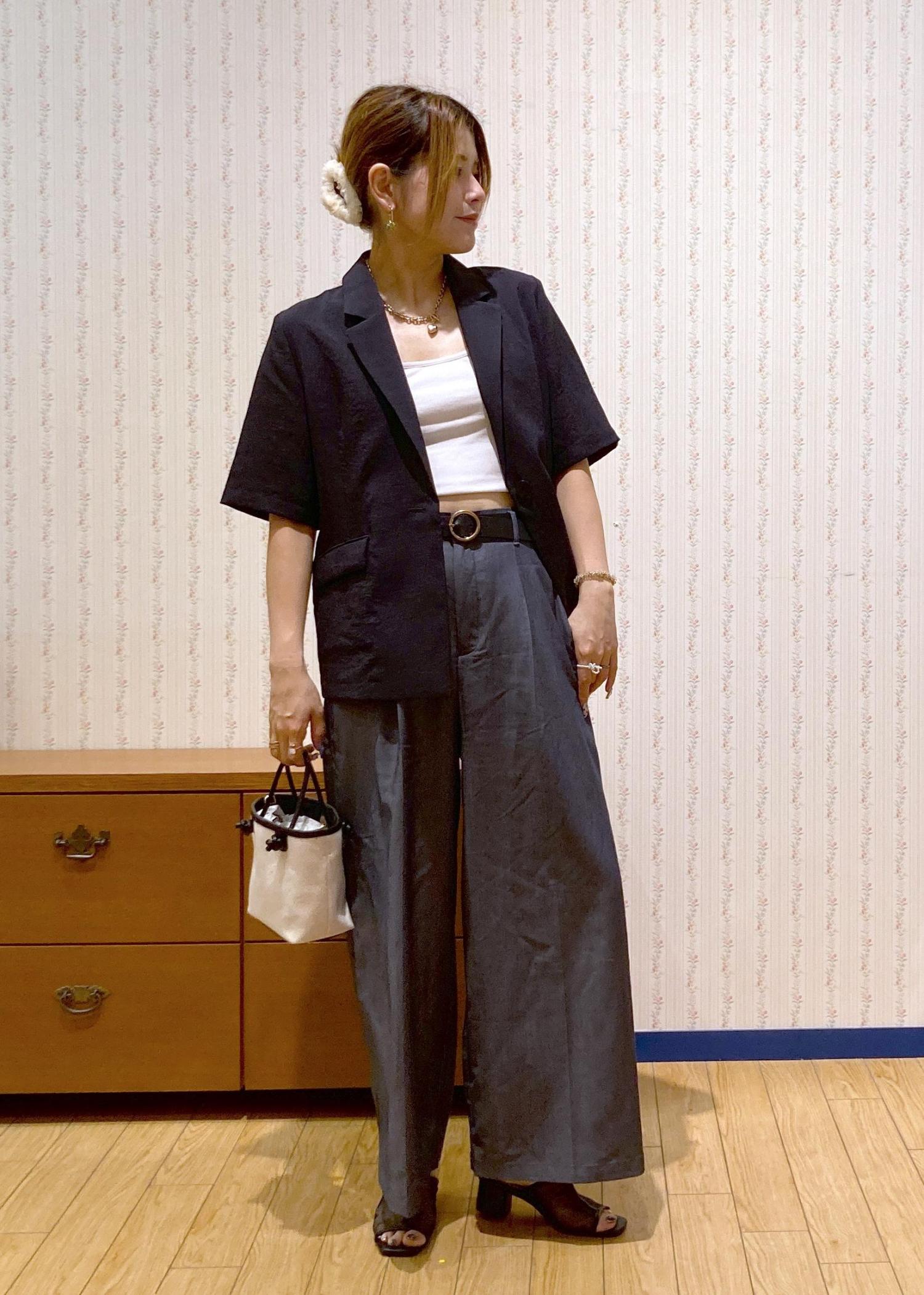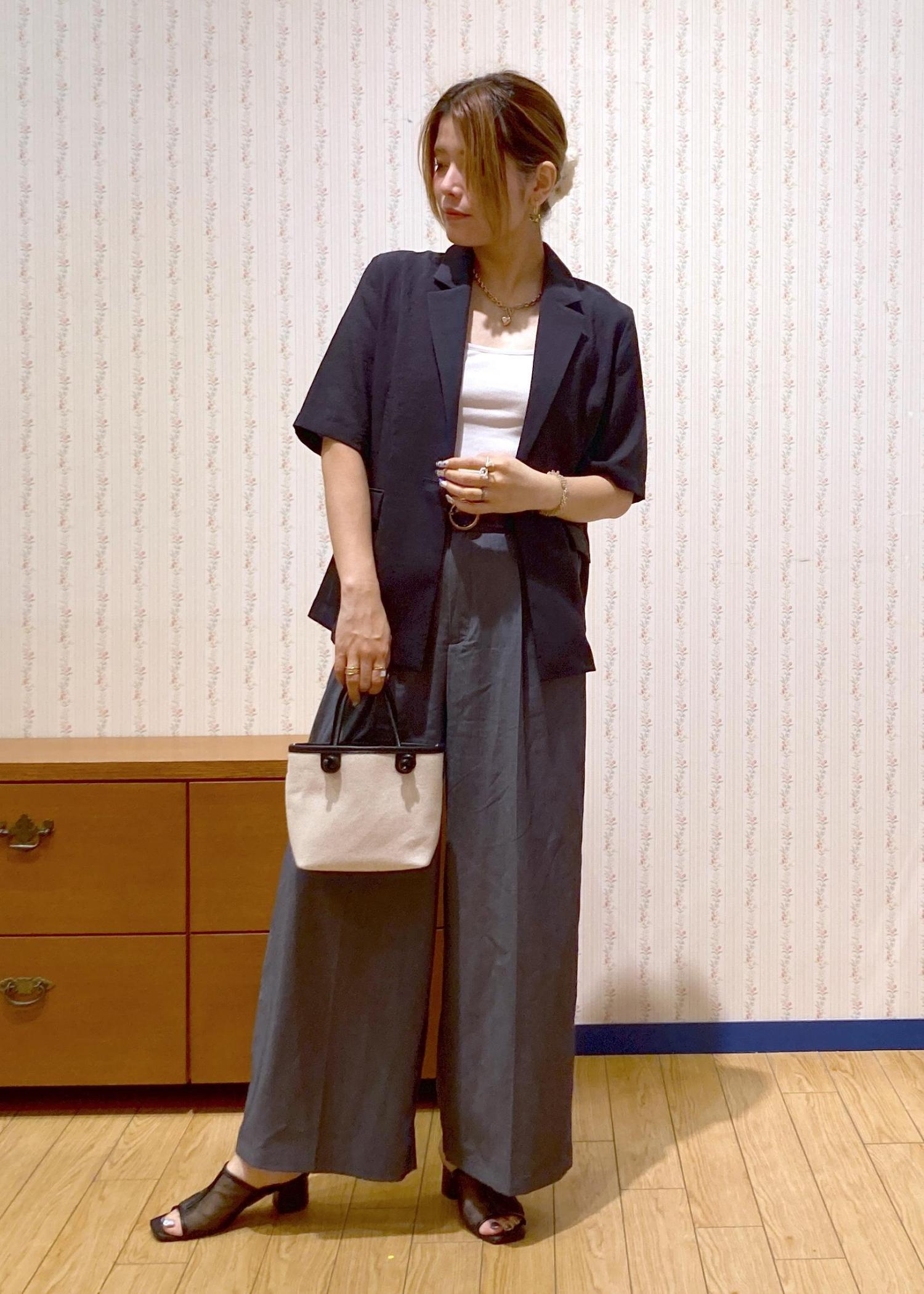 シャツ感覚で羽織れるジャケットに、太めのワイドパンツを合わせた綺麗めカジュアルコーディネートです。