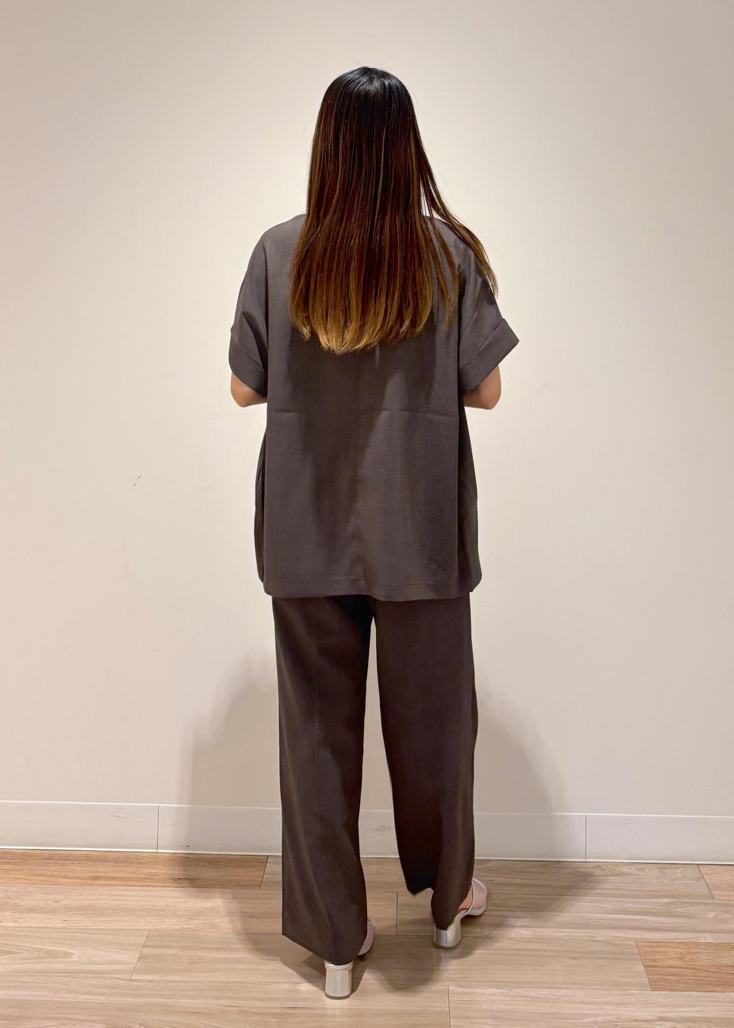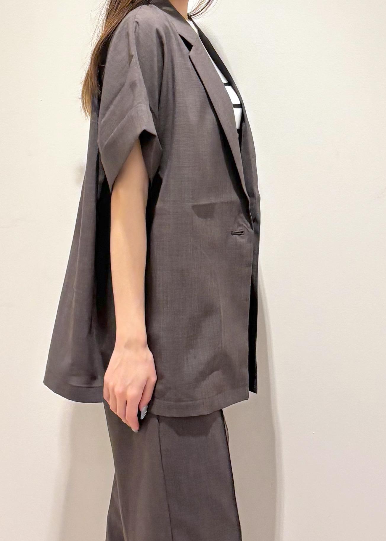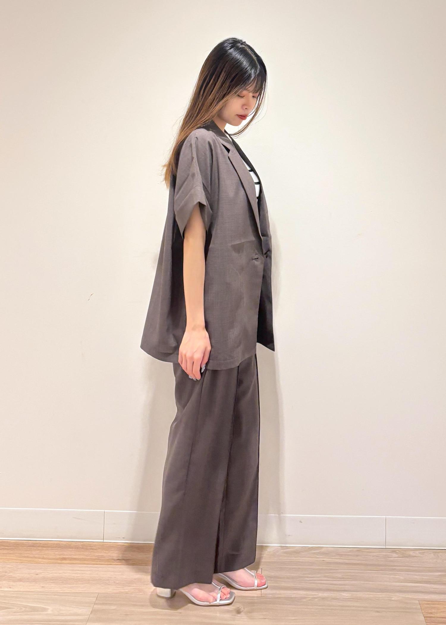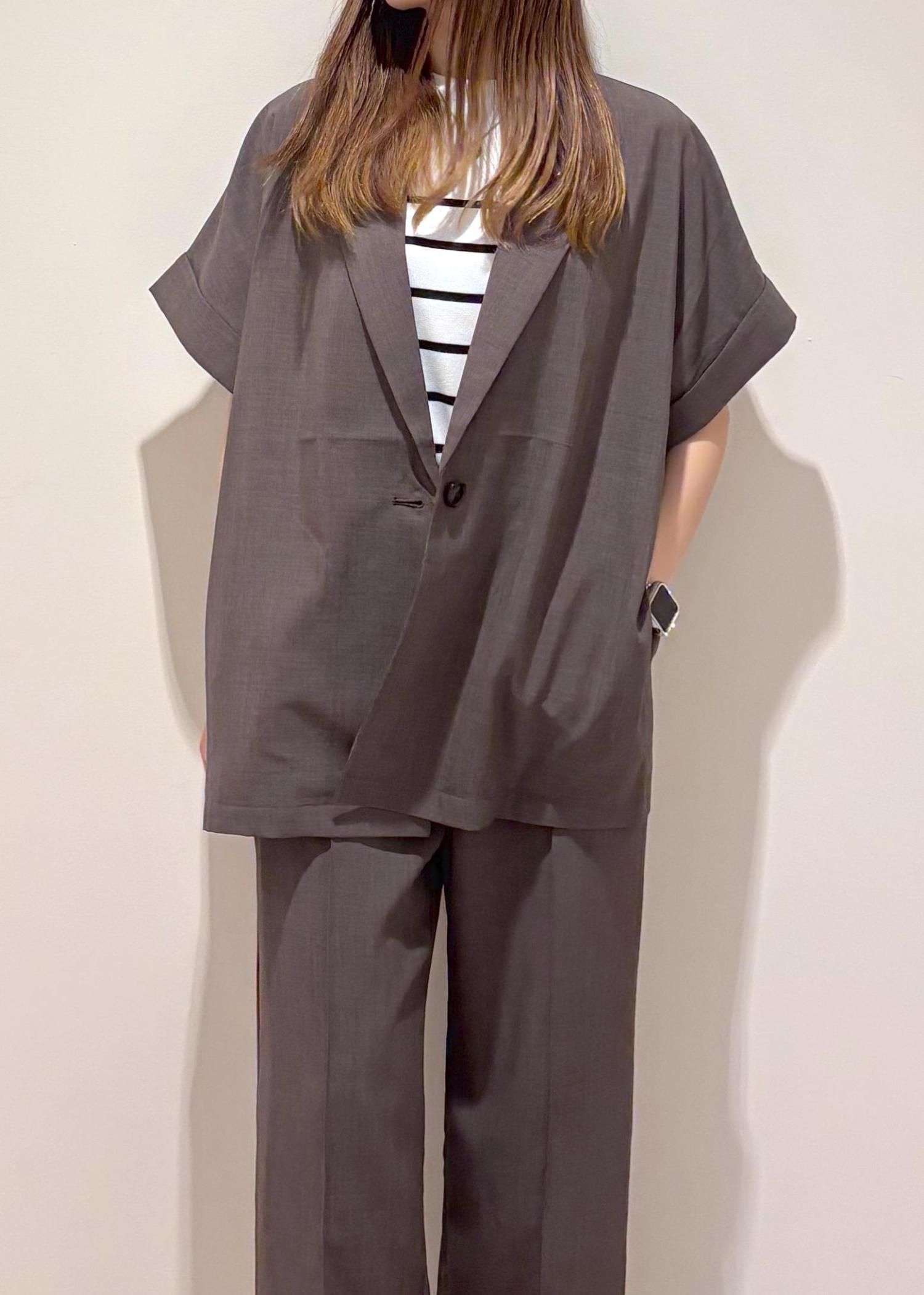 半袖ジャケットはゆったりとしていますが、ストレートワイドと太すぎないシルエットのパンツスタイルなのでダボッとしすぎず、きれいに決まります!