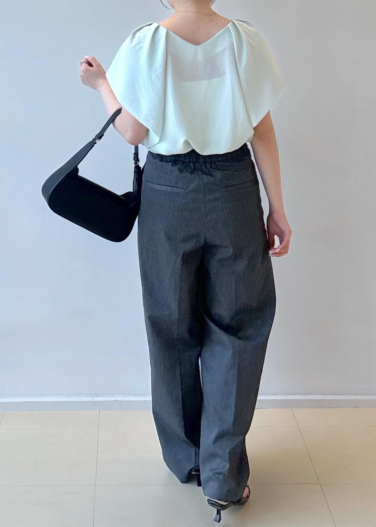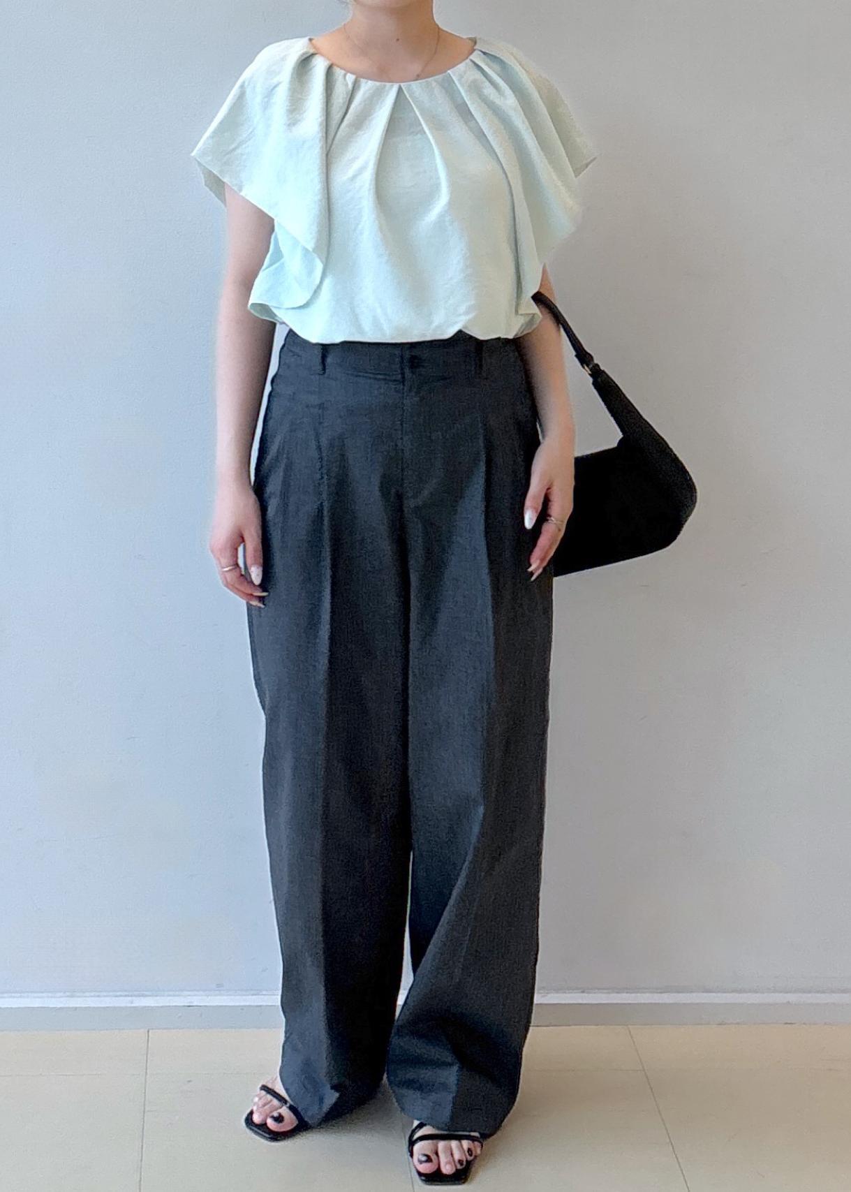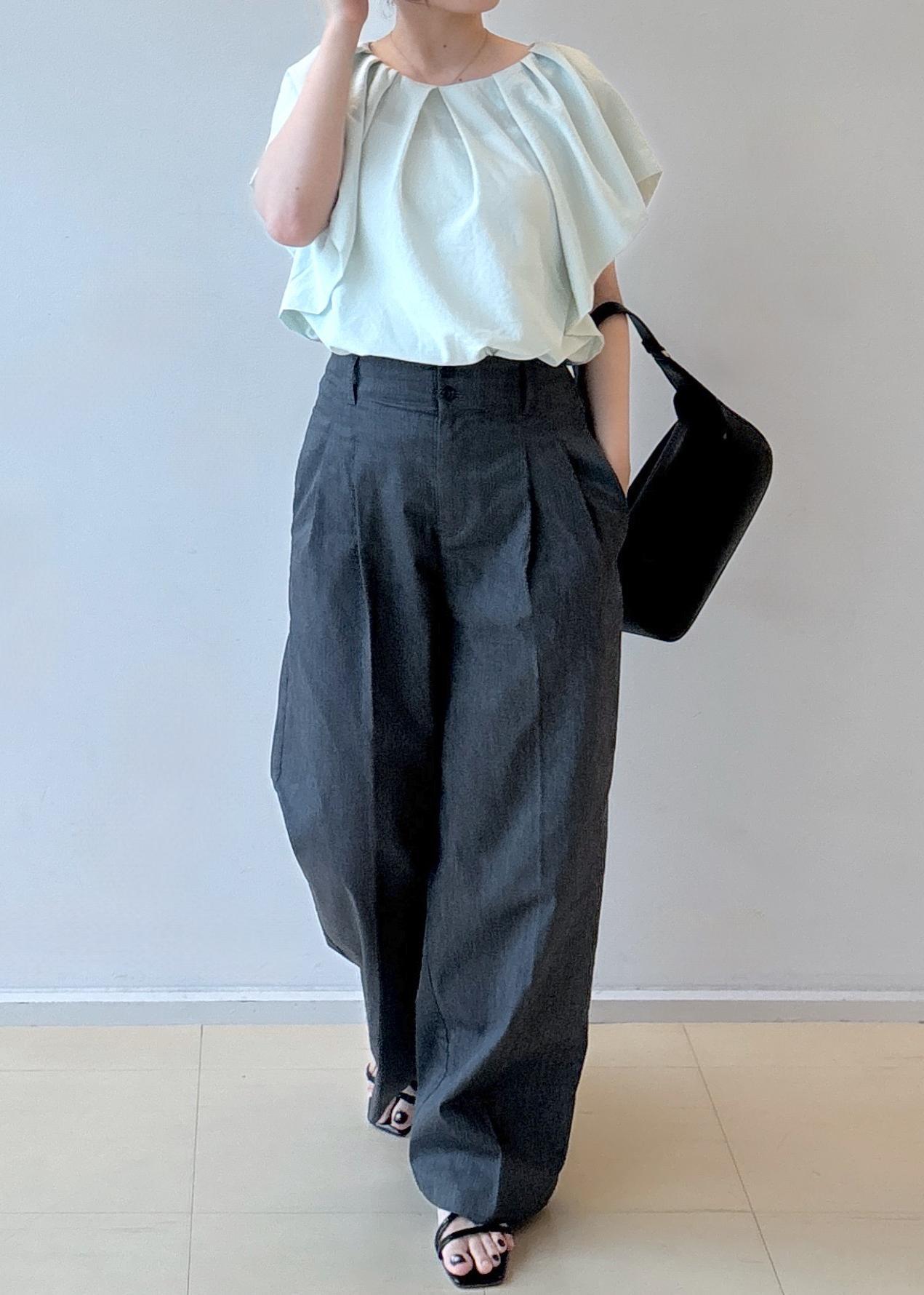 肩まわりにボリュームのあるブラウスと、落ち感のあるワイドパンツを合わせることで、直線的な骨格ストレートのボディラインに自然なメリハリを与えています