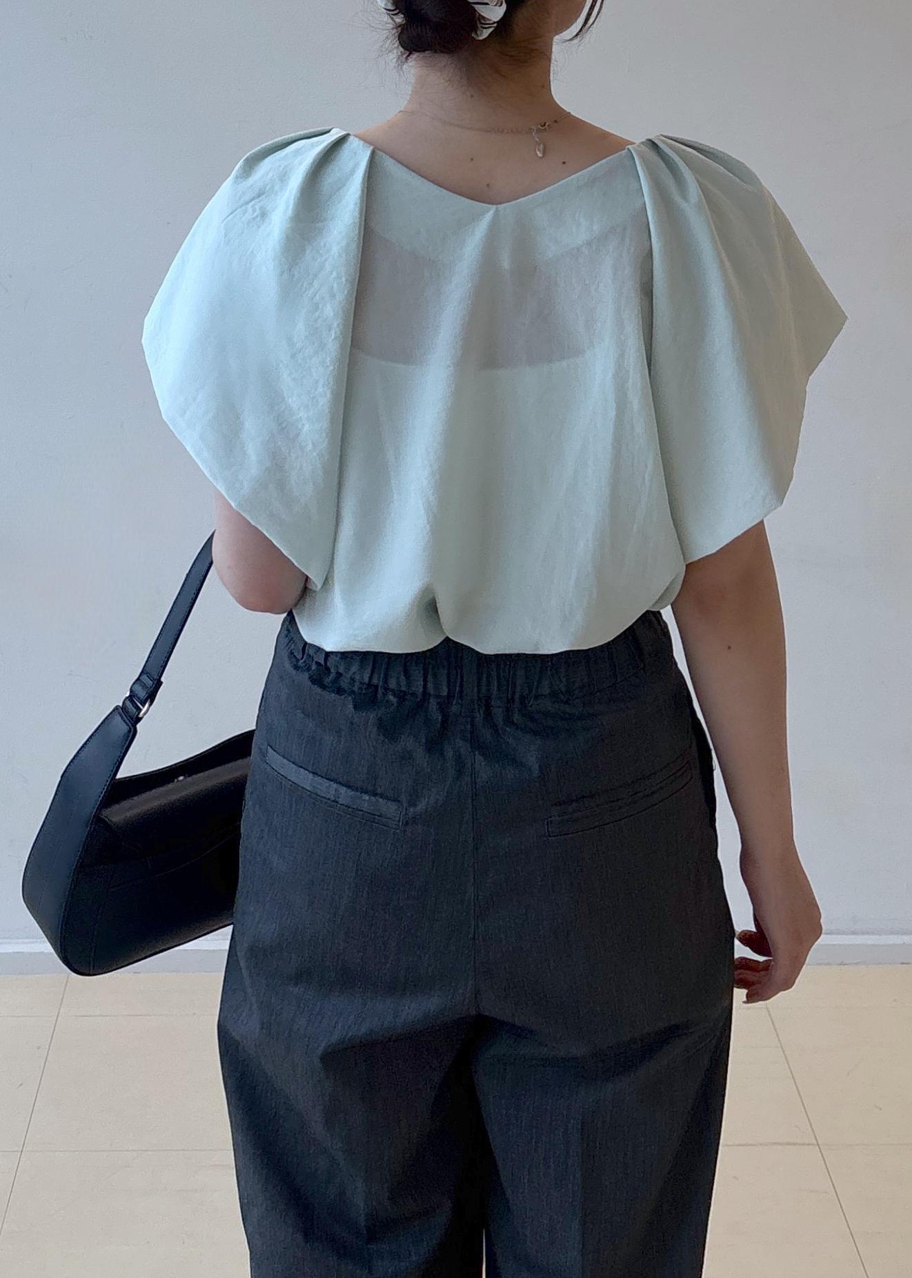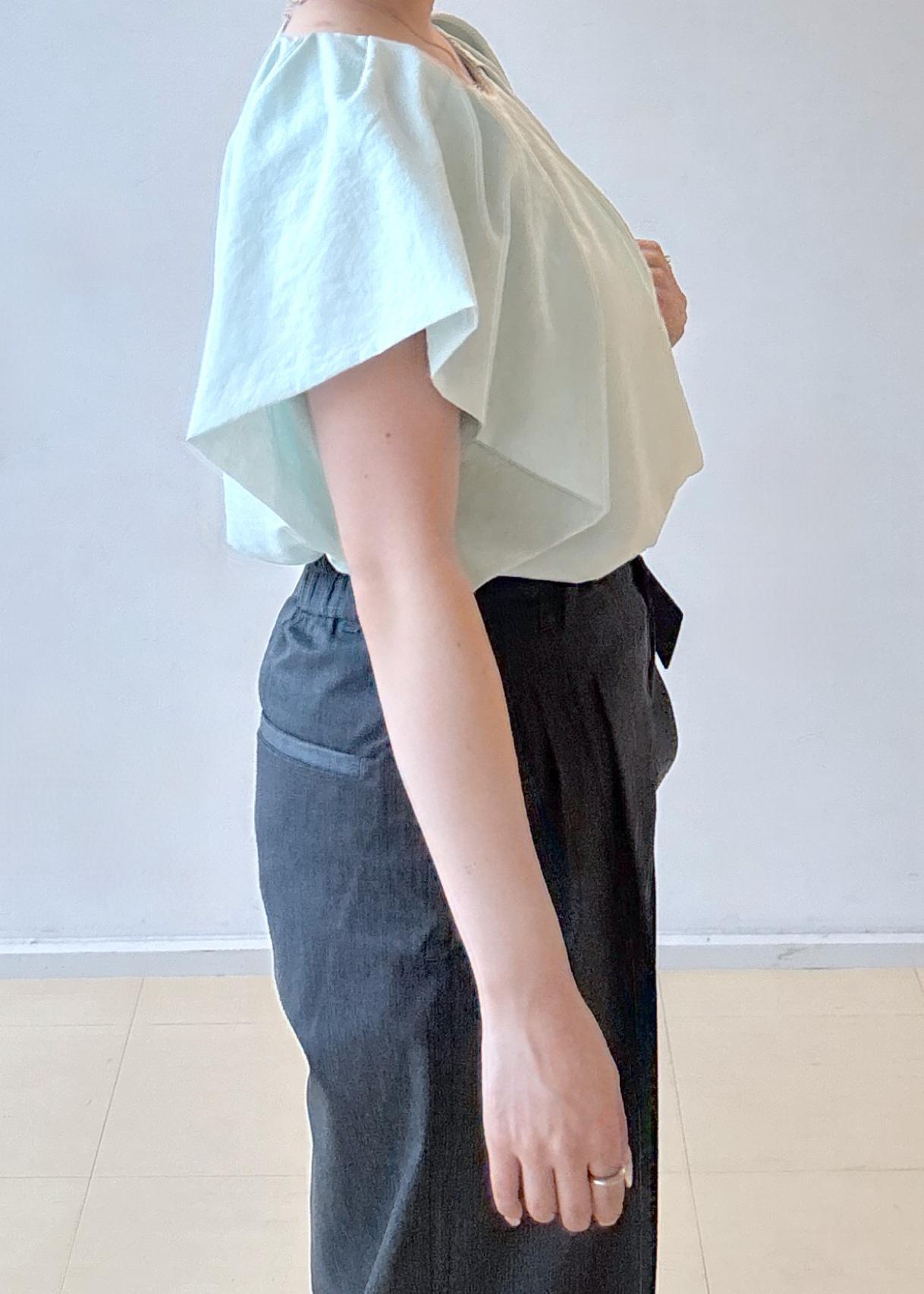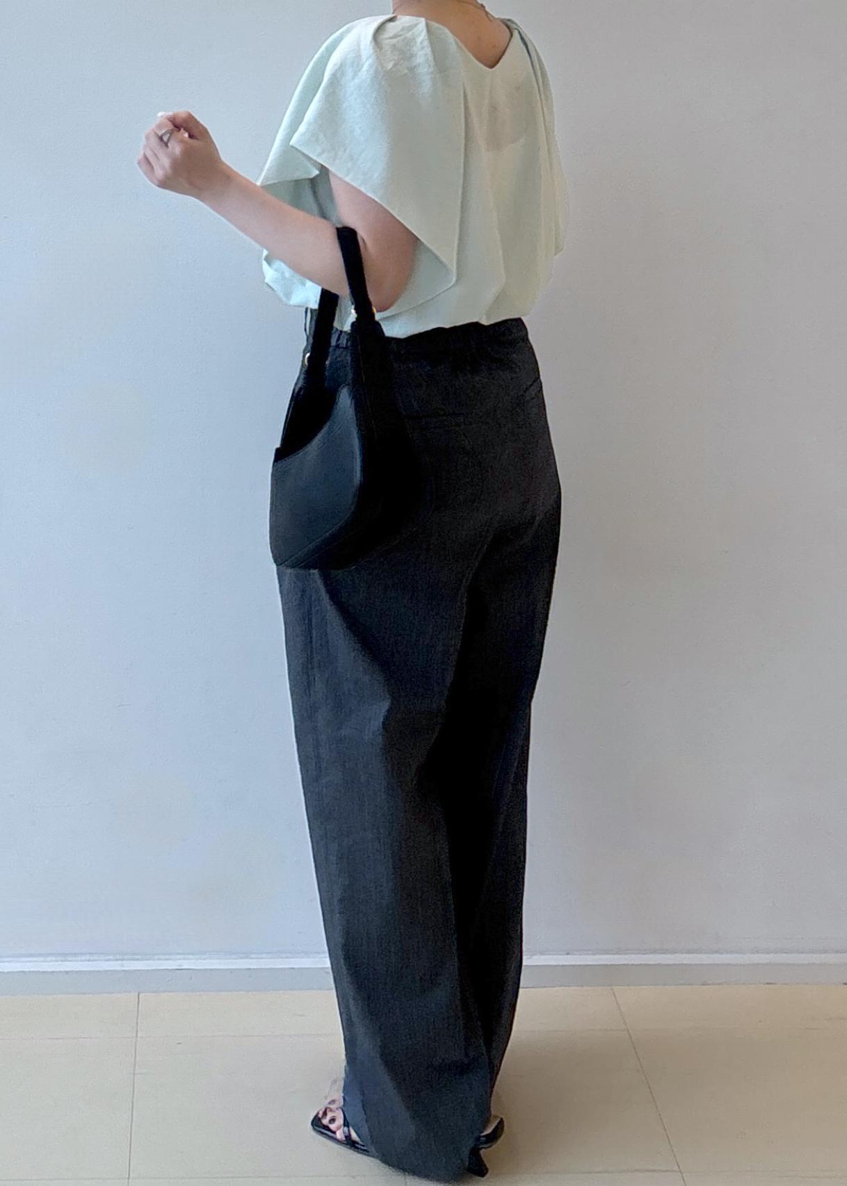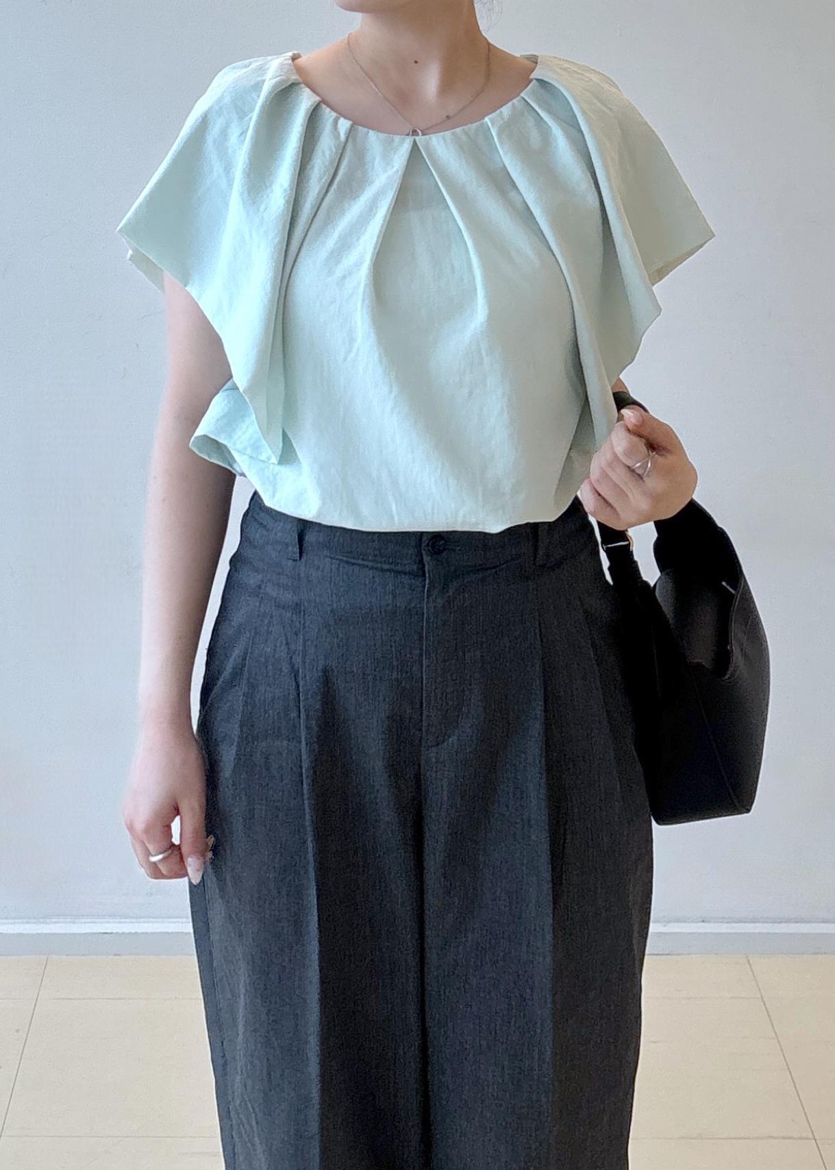 肩まわりにボリュームのあるブラウスと、落ち感のあるワイドパンツを合わせることで、直線的な骨格ストレートのボディラインに自然なメリハリを与えています