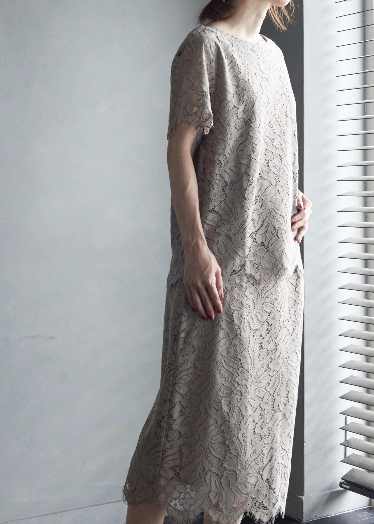 夏らしいリーフデザインが甘すぎない、 総レースのセットアップ。 普段カジュアルなスタイルが多いですが、 このレースは爽やかな印象なので選びやすいです。