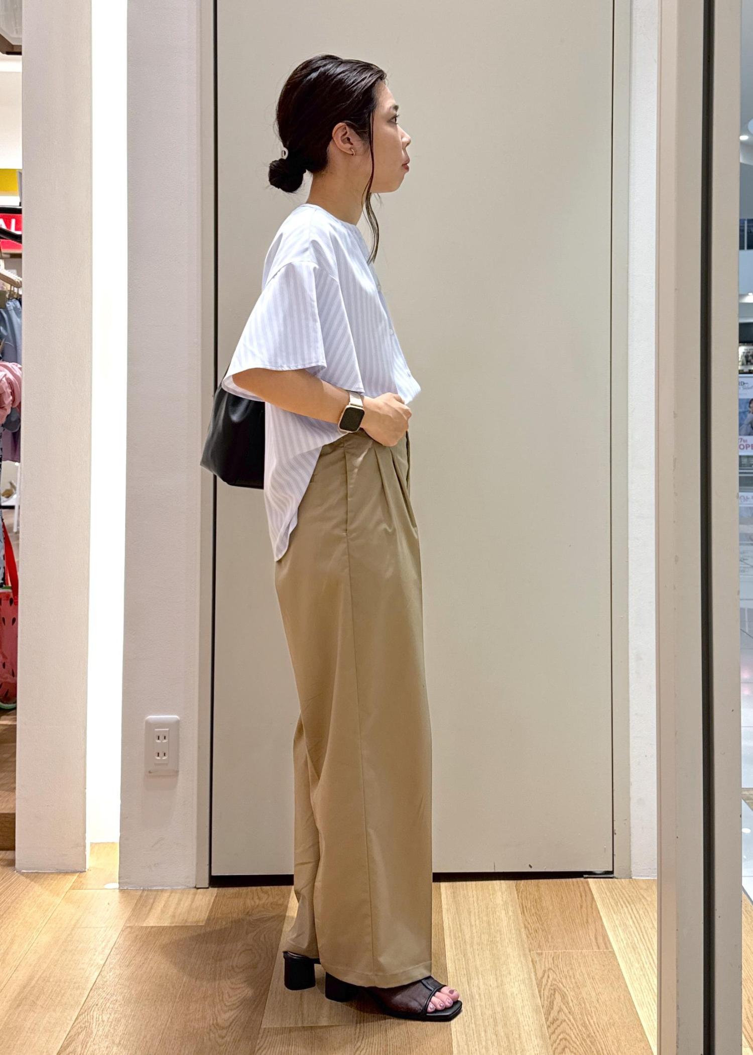 丈は155㎝で床に付く程度の長さがあるので、ヒール合わせや、裾を折り返して履くとスッキリ見えます。 -