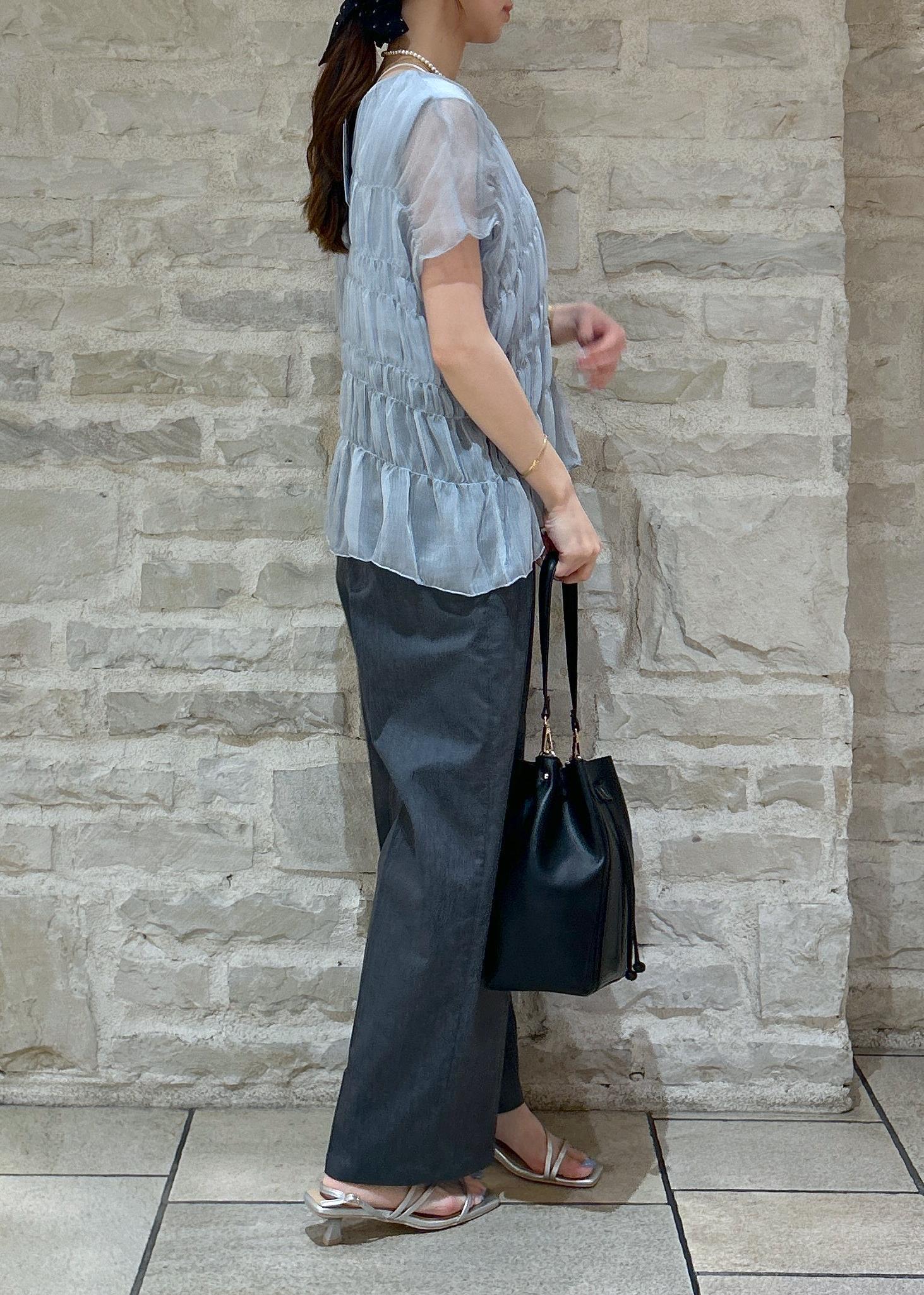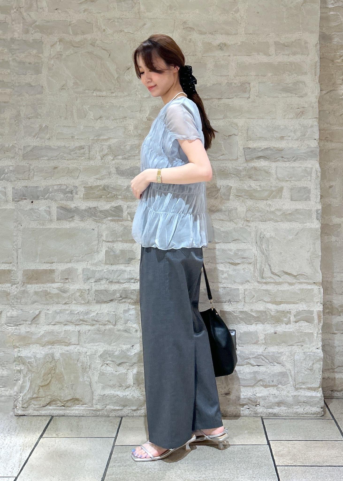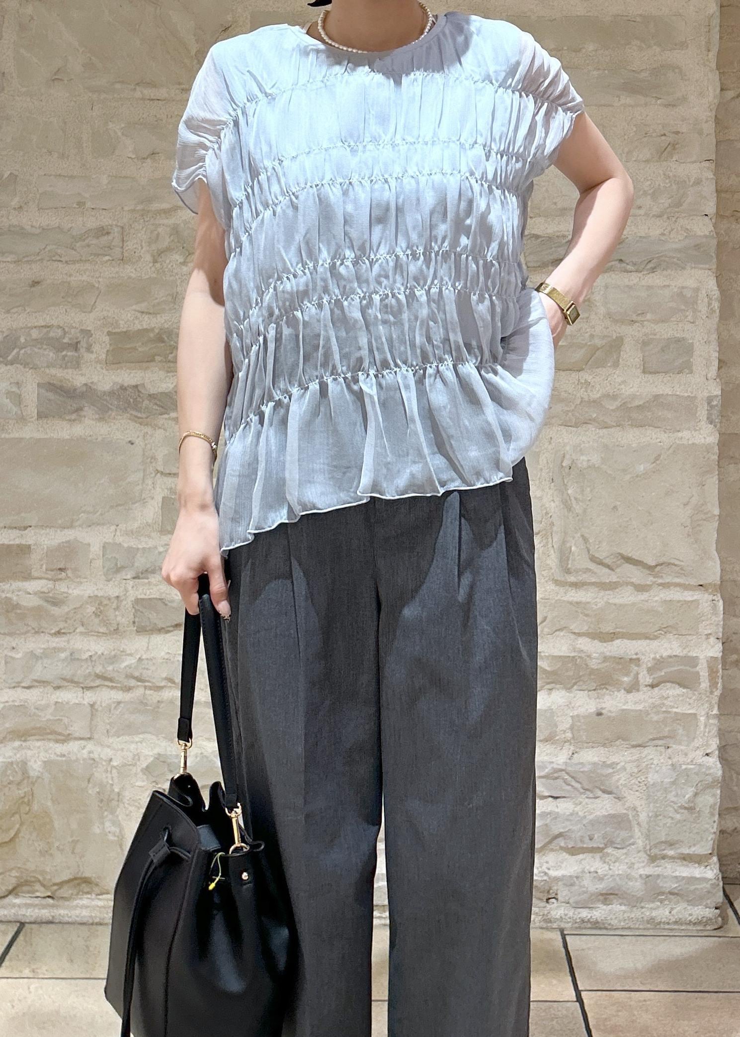 ブルーのシャーリングトップスにグレーのパンツで大人綺麗めな夏スタイリングにしました。