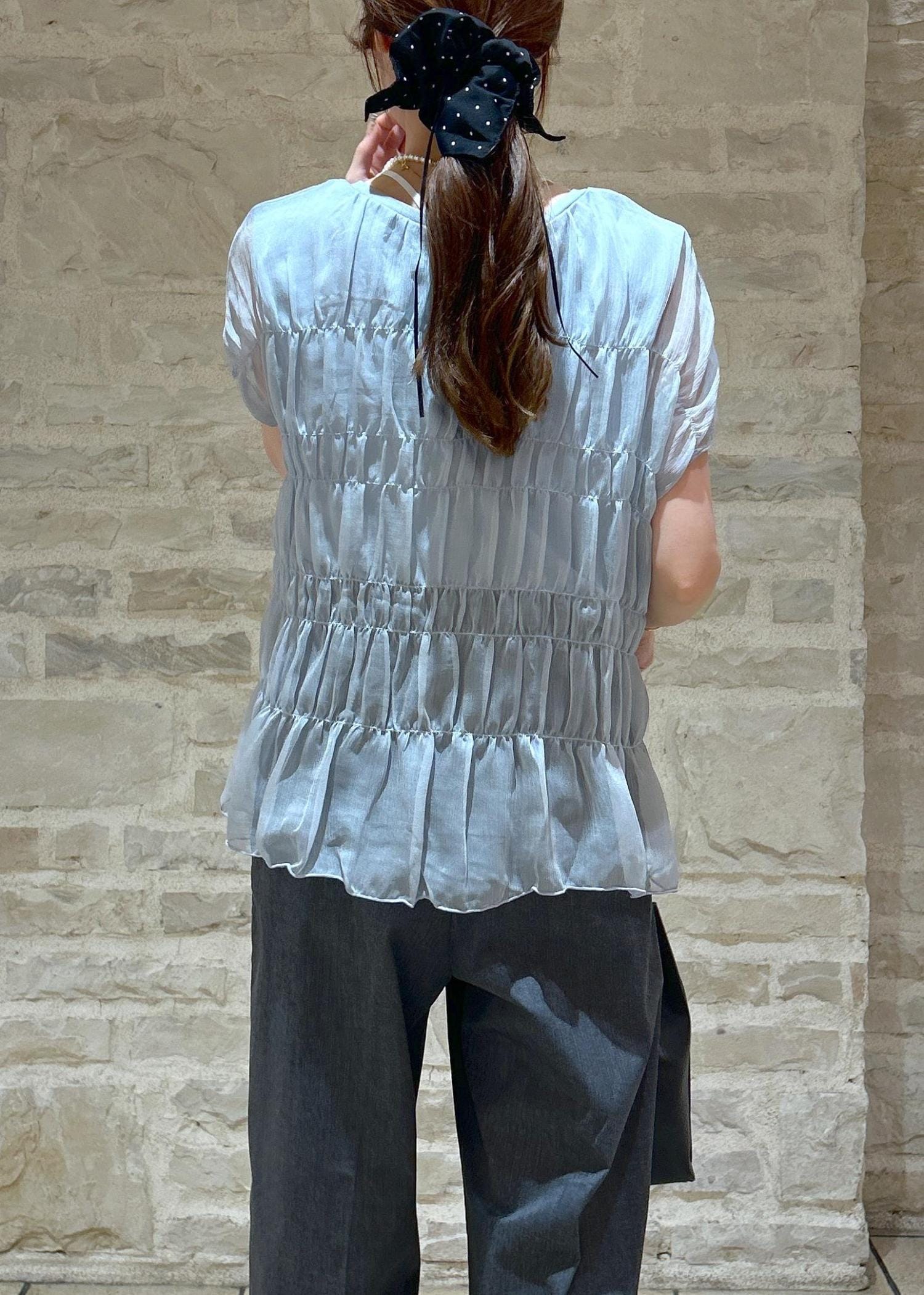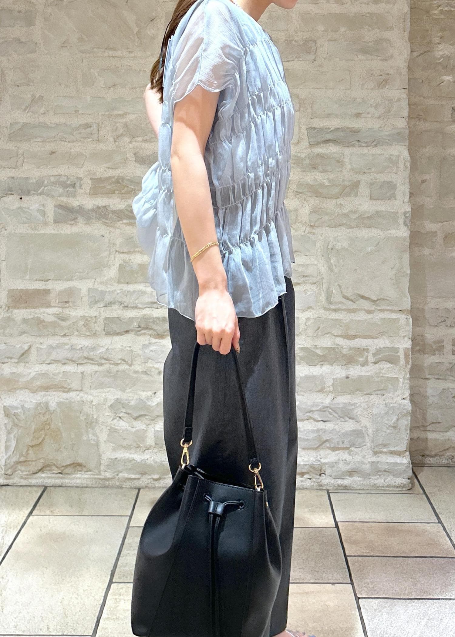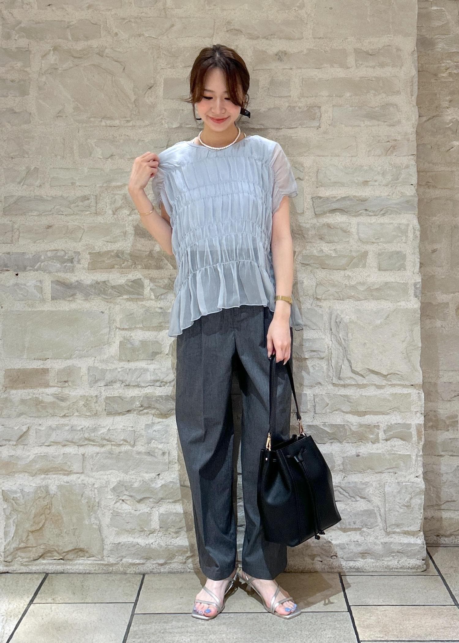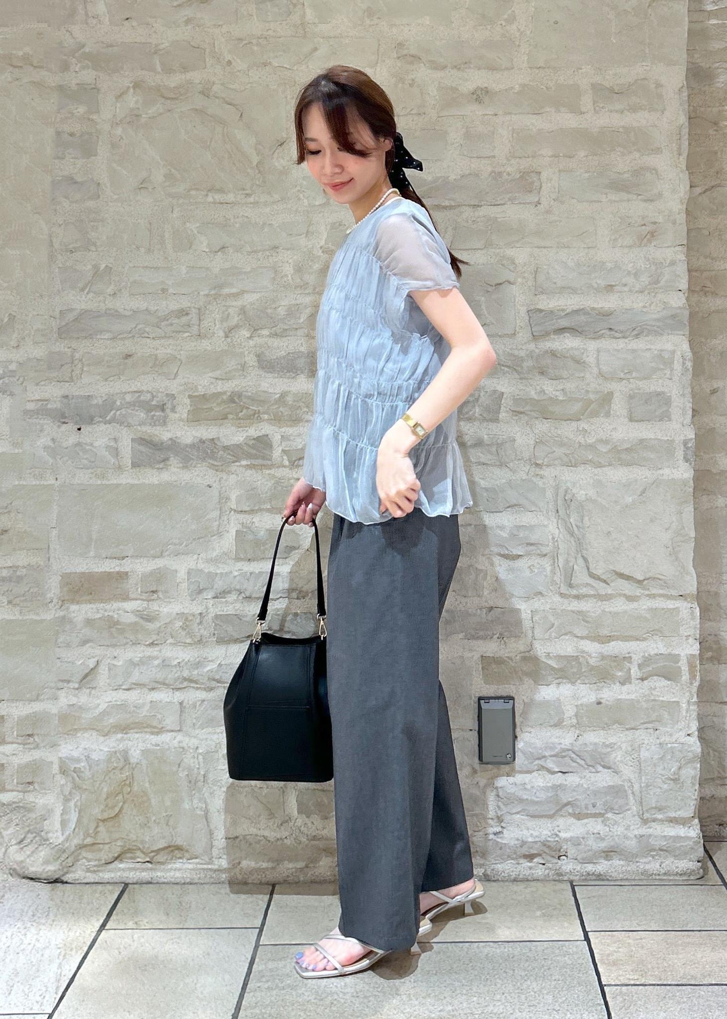 ブルーのシャーリングトップスにグレーのパンツで大人綺麗めな夏スタイリングにしました。