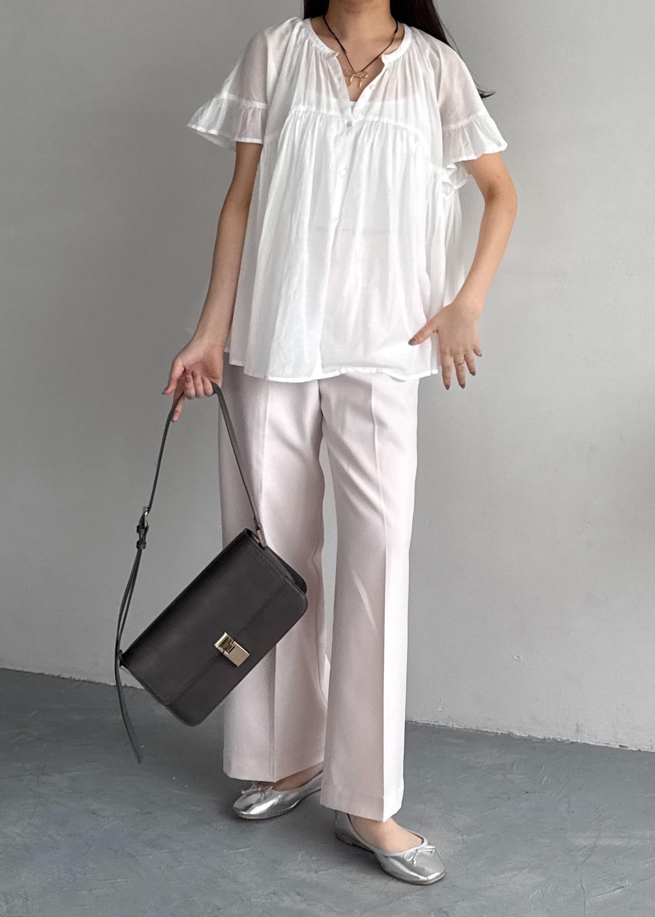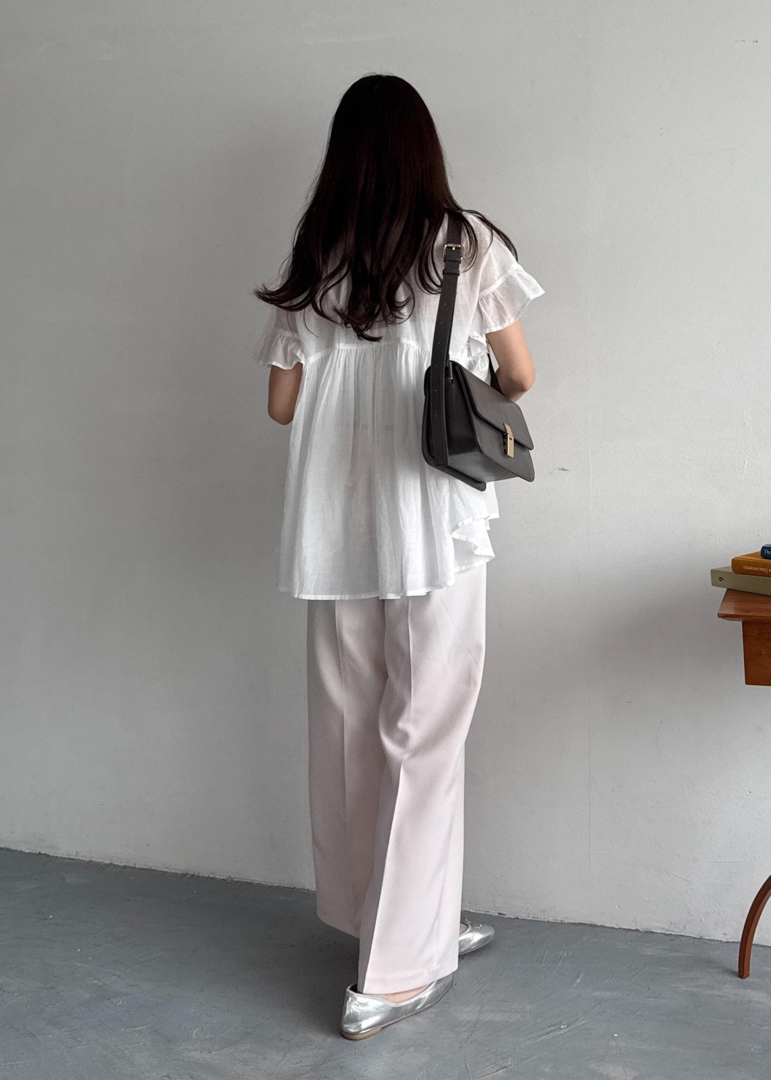 華やかに広がる裾が特徴的なブラウスにピンクのパンツを合わせた可愛らしさ全開のコーディネートです。