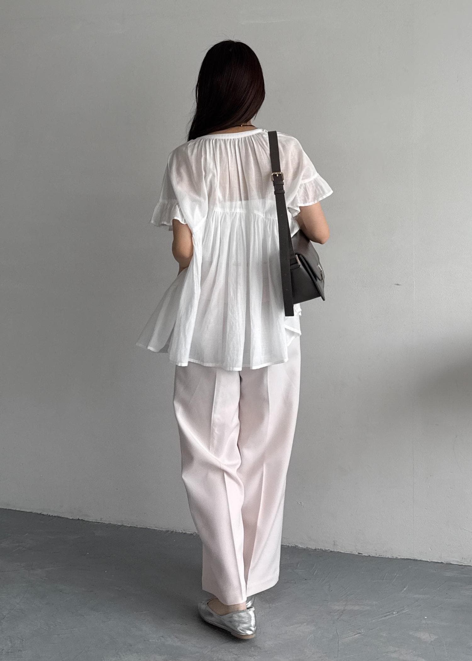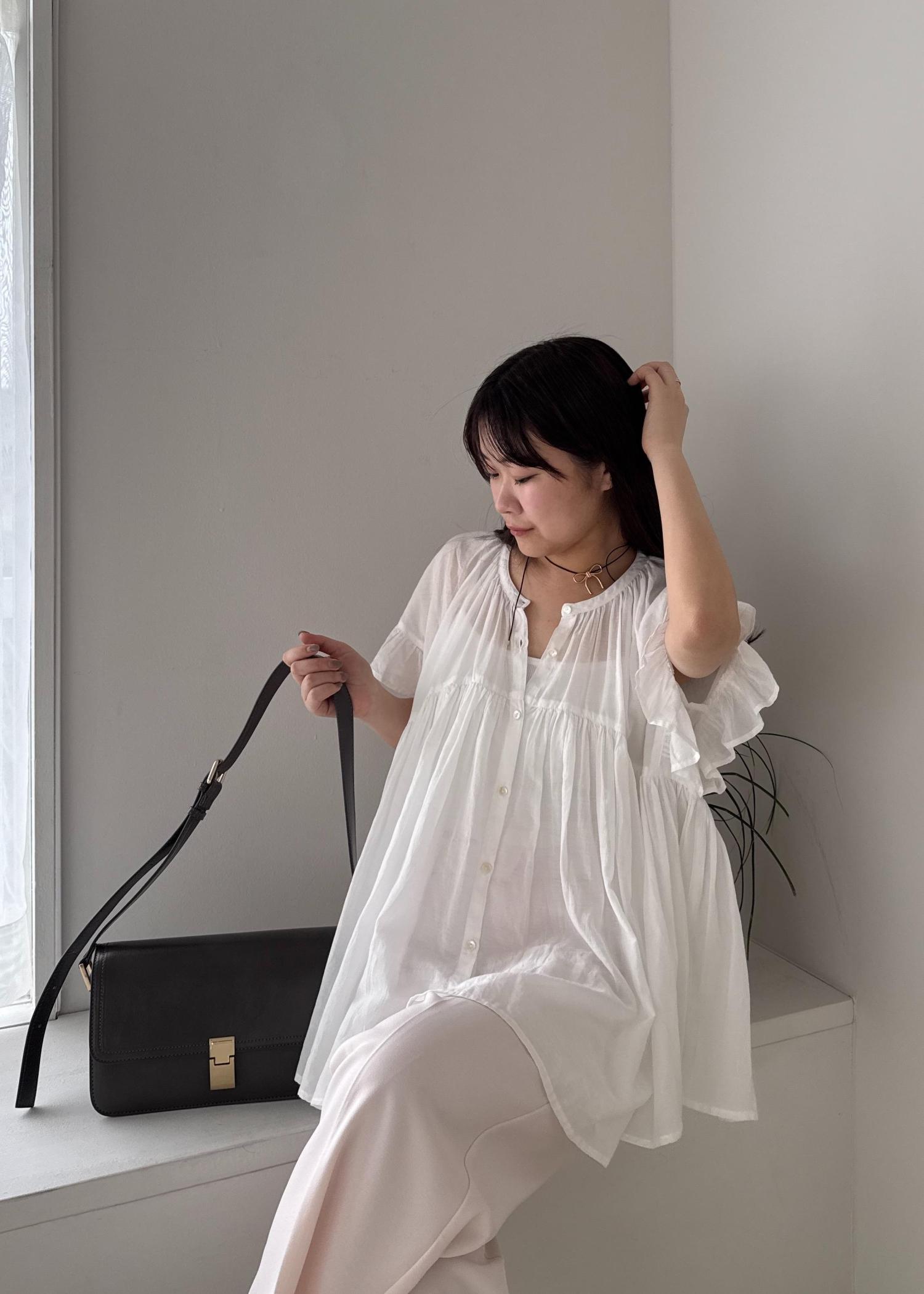 柔らかく軽やかな素材で生地がたっぷり使われているので、動いた時の揺れ感が華やかな1枚です。