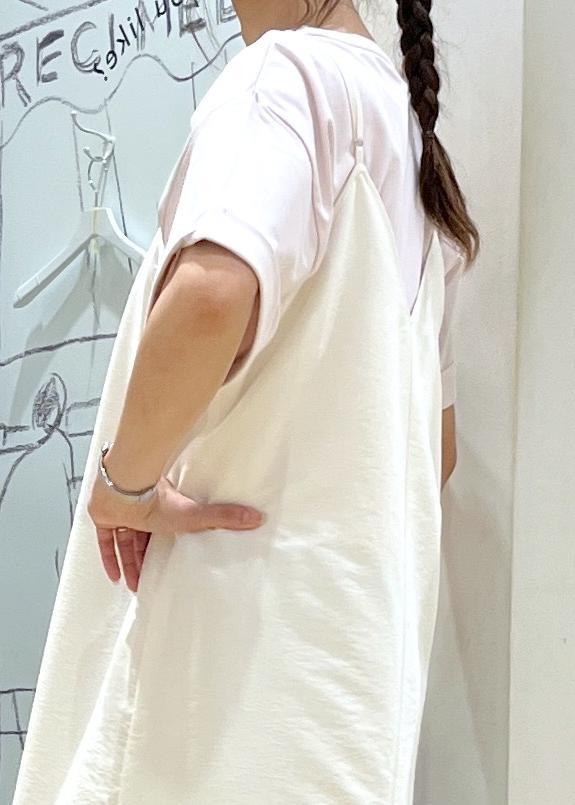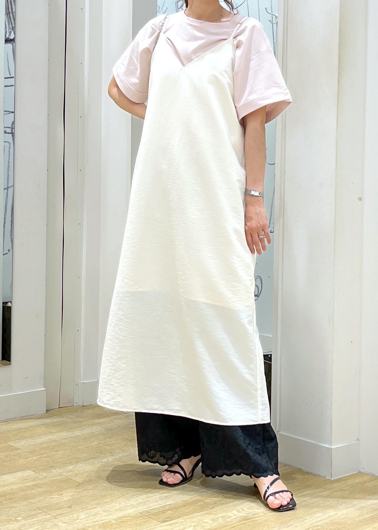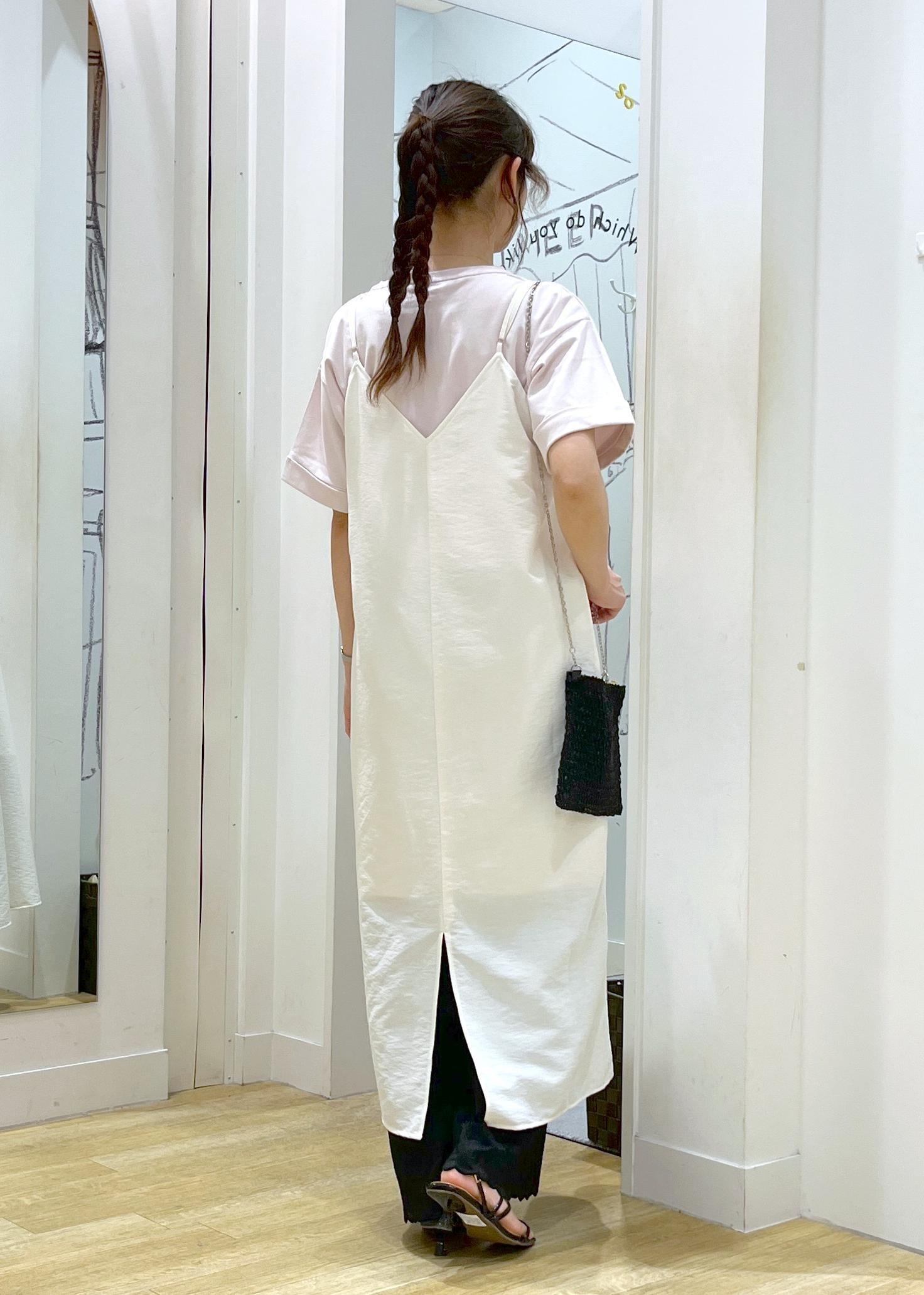 キャミワンピースにパンツをレイヤードしたコーデです。