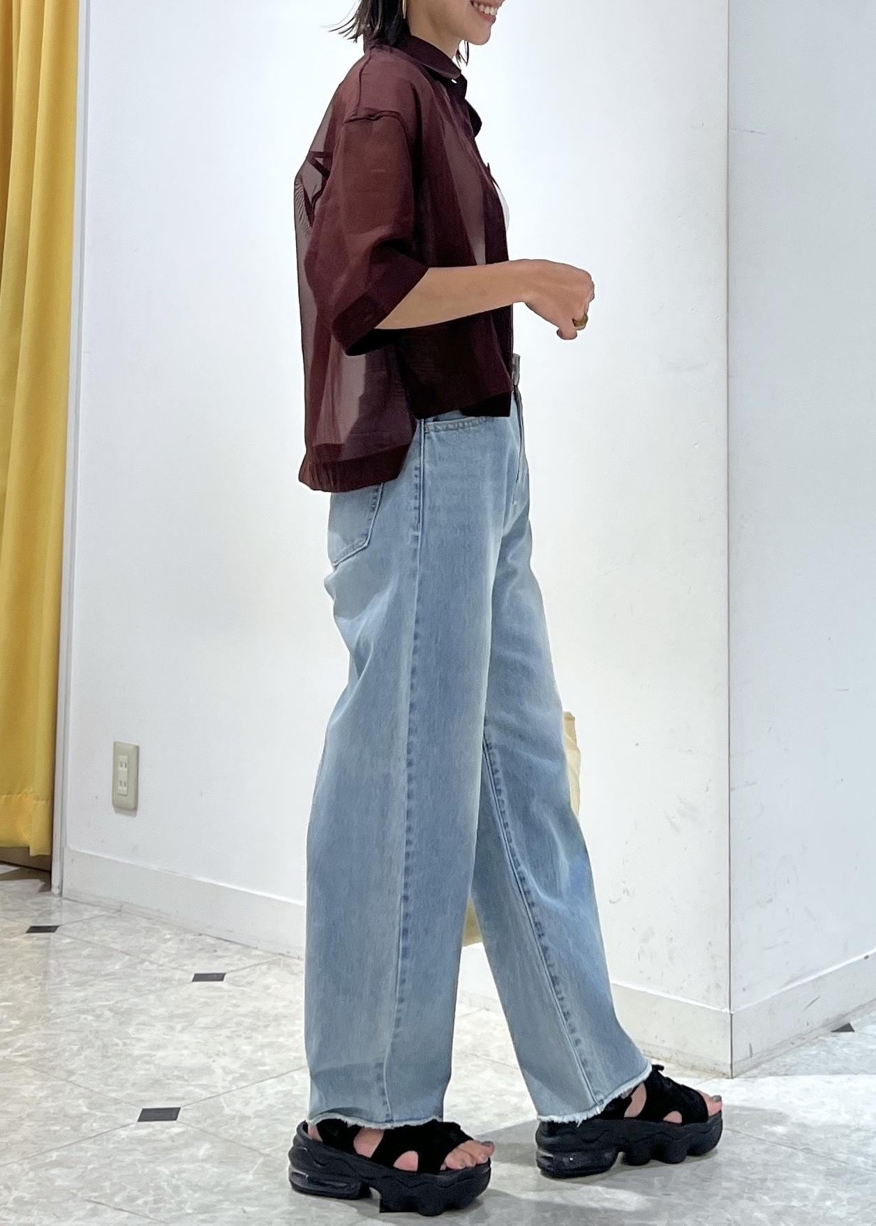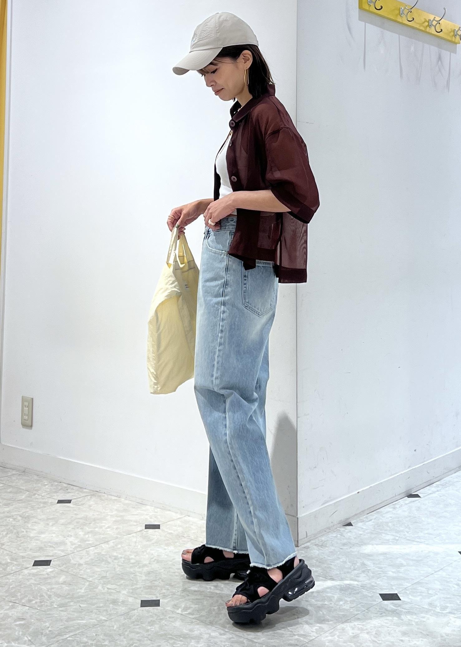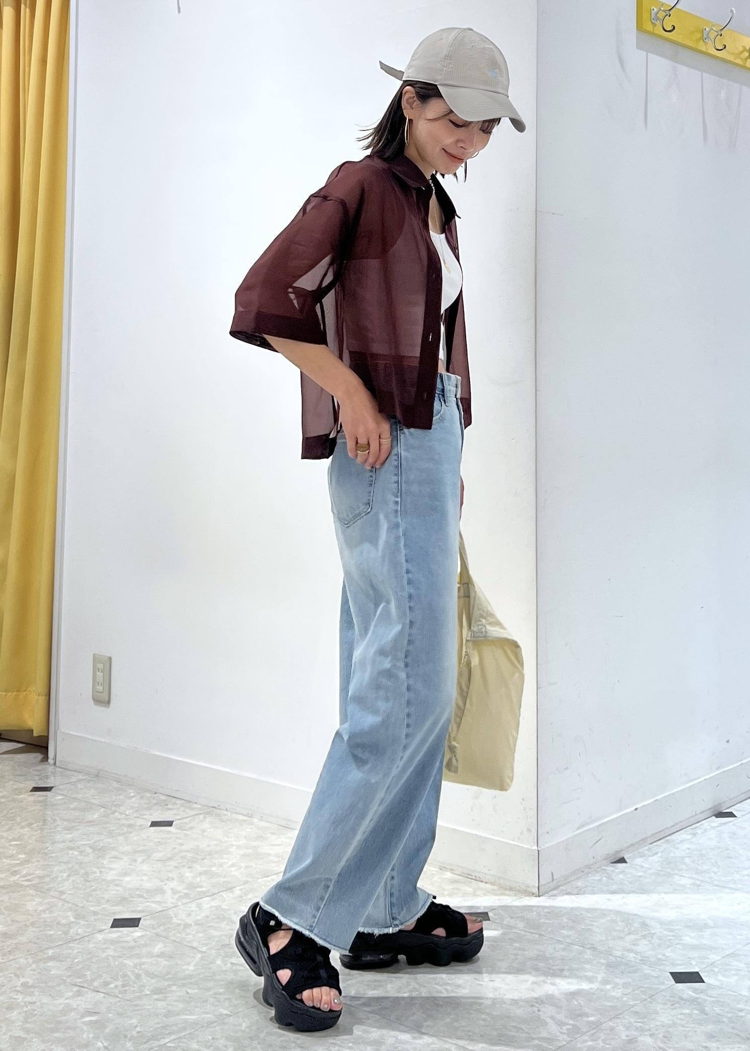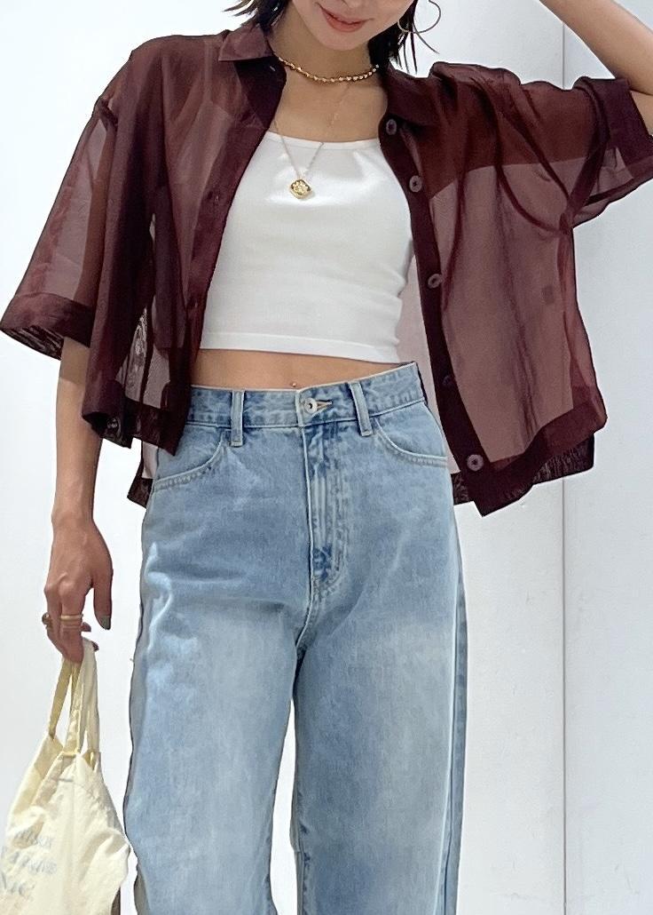 透け感のある軽いシアーシャツは、ヘルシーなカジュアルコーデにおすすめアイテム◎。