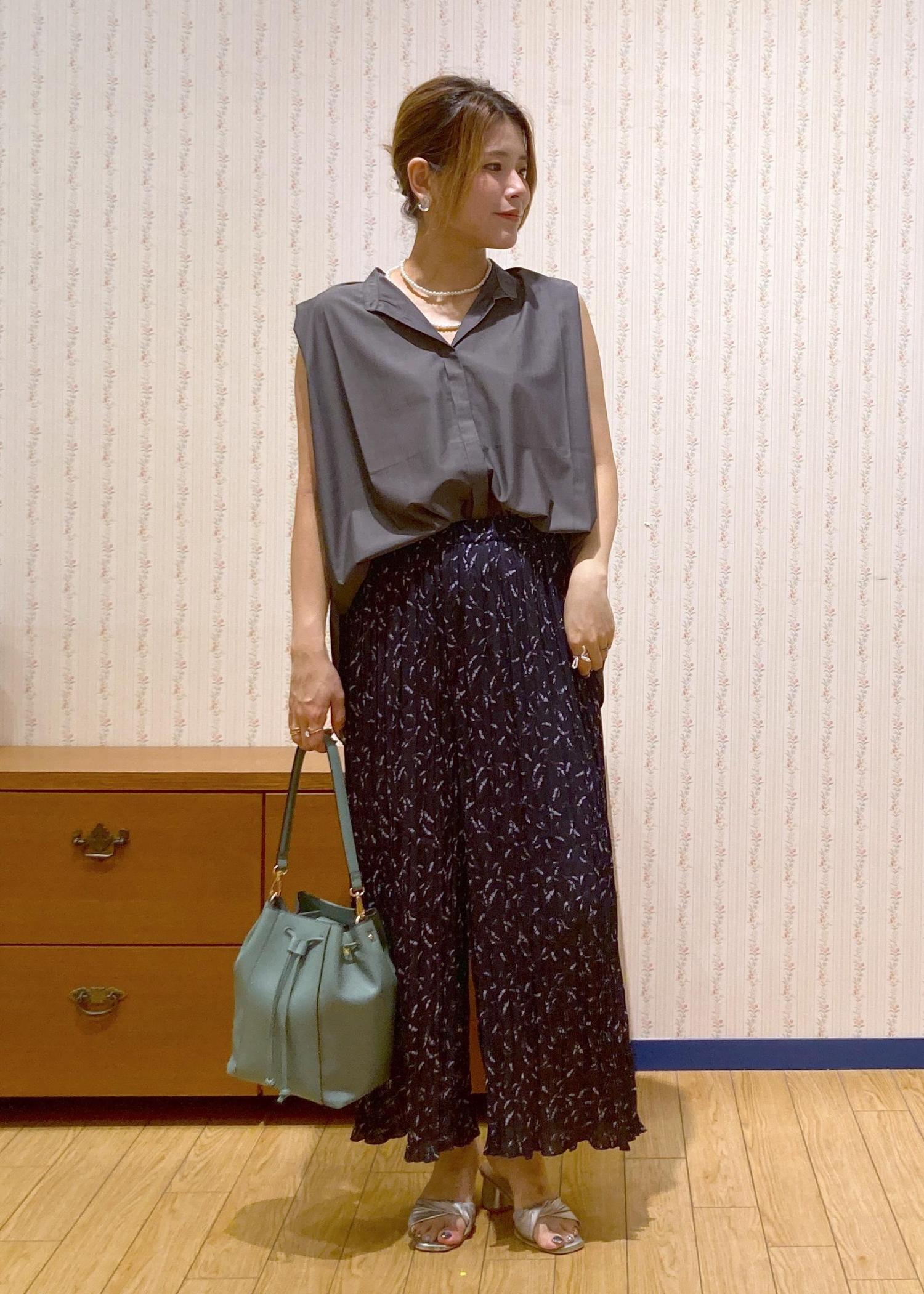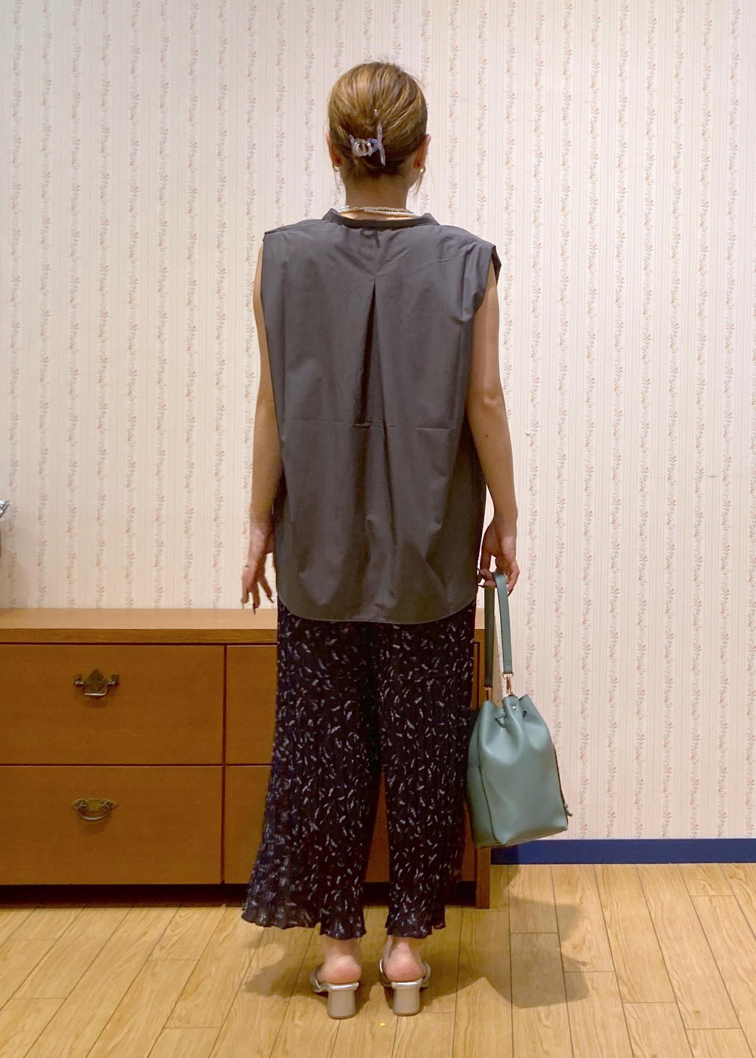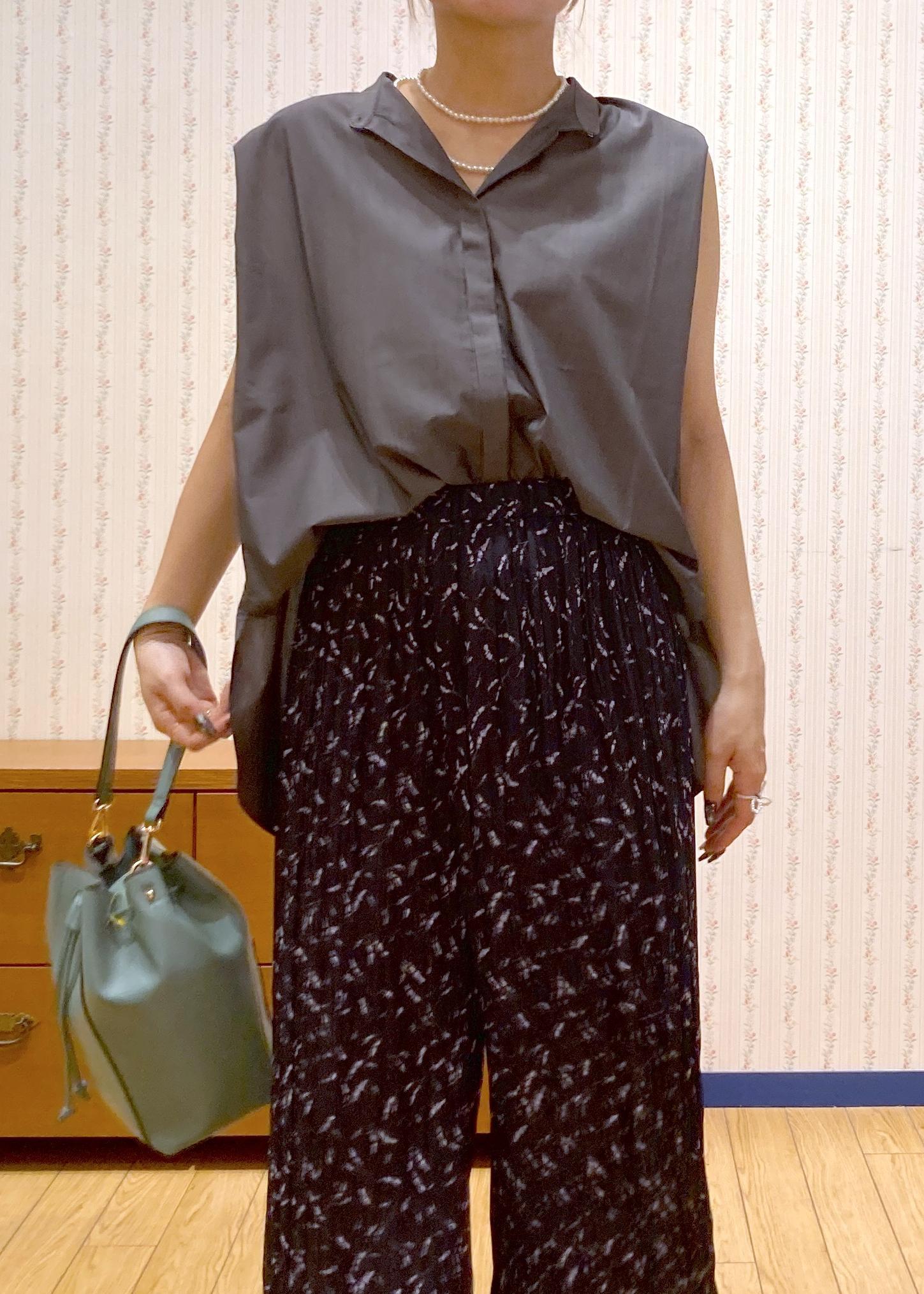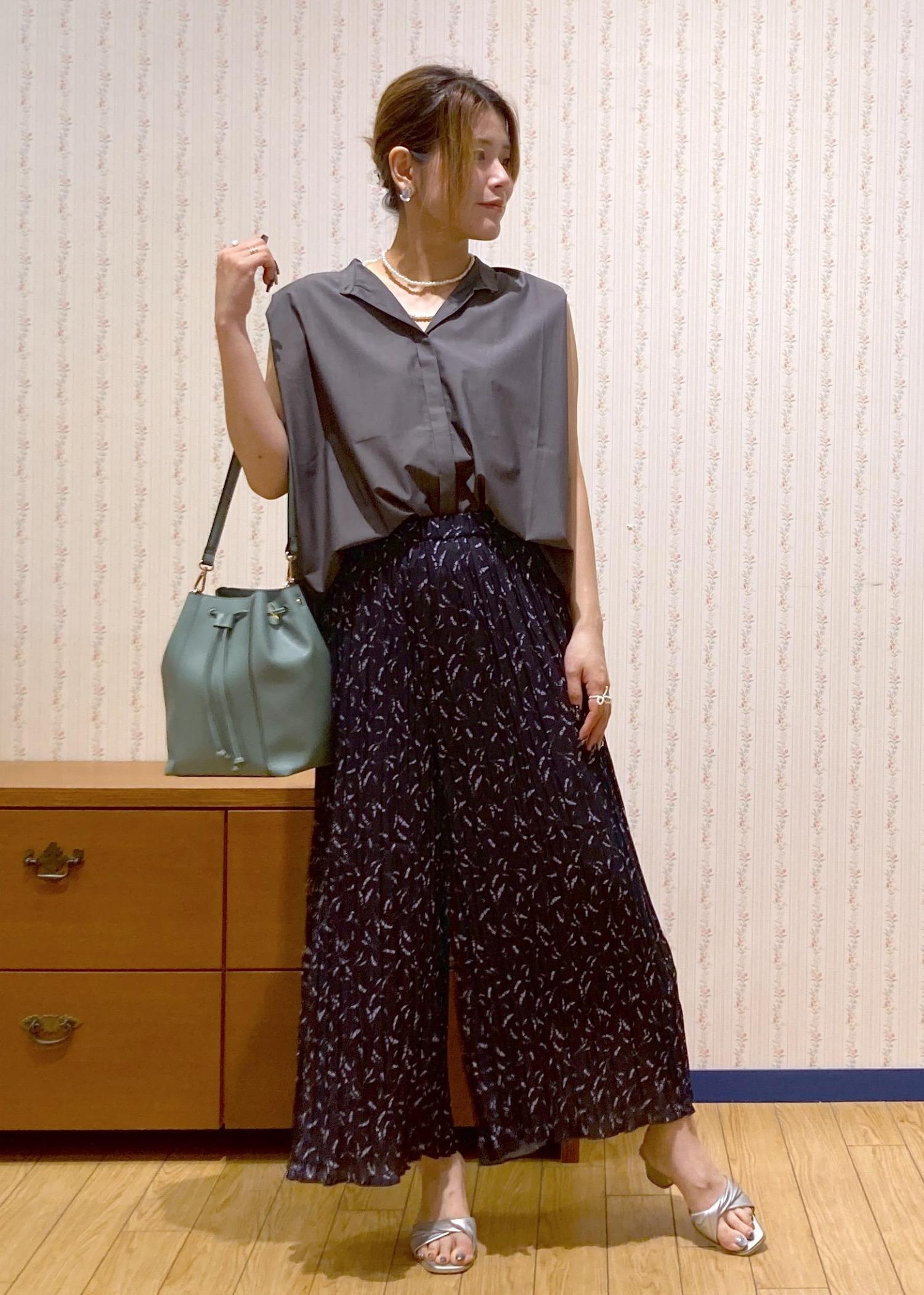 タック入りのノースリーブシャツにラベンダー柄のプリーツパンツを合わせたきちんと感もあるリラックスリゾートコーディネートです。
