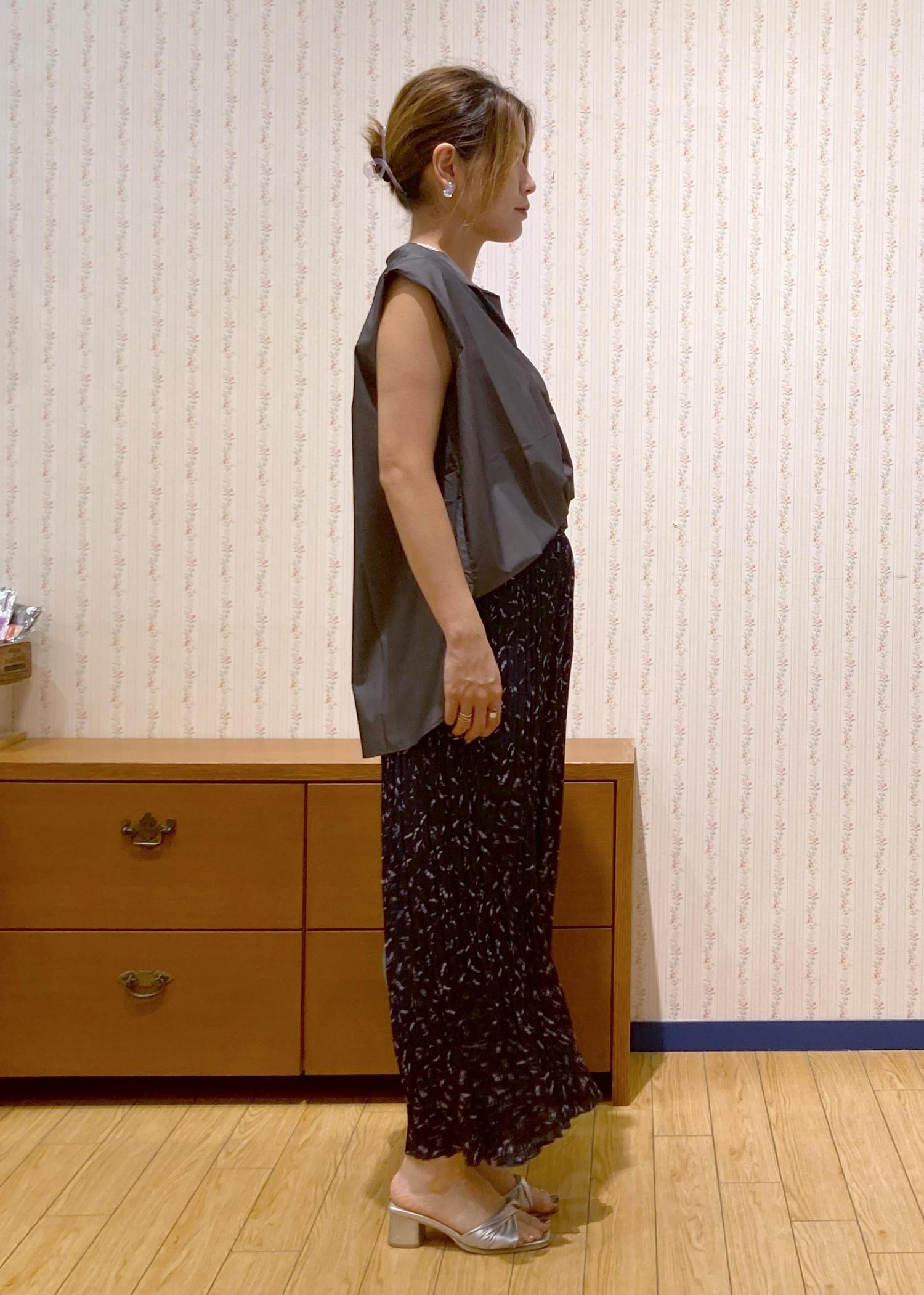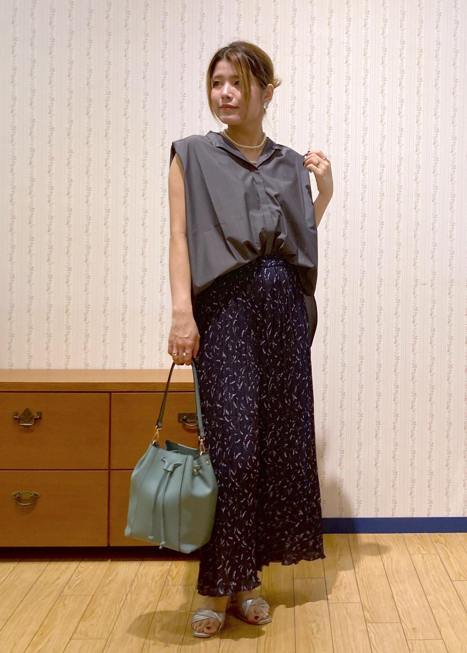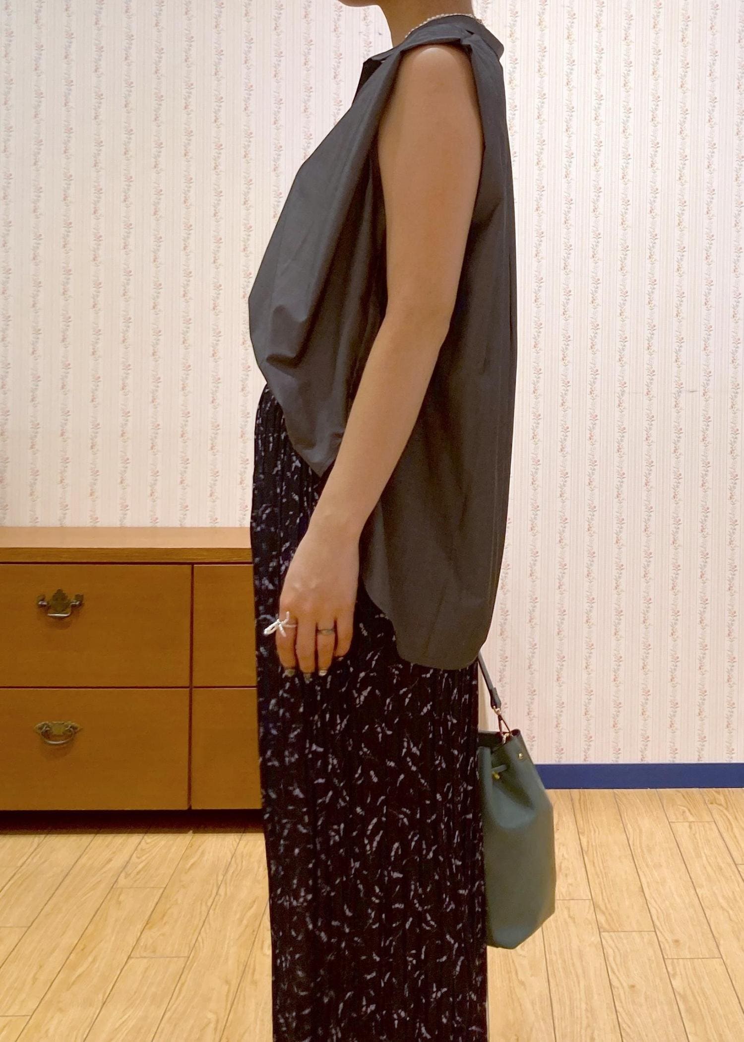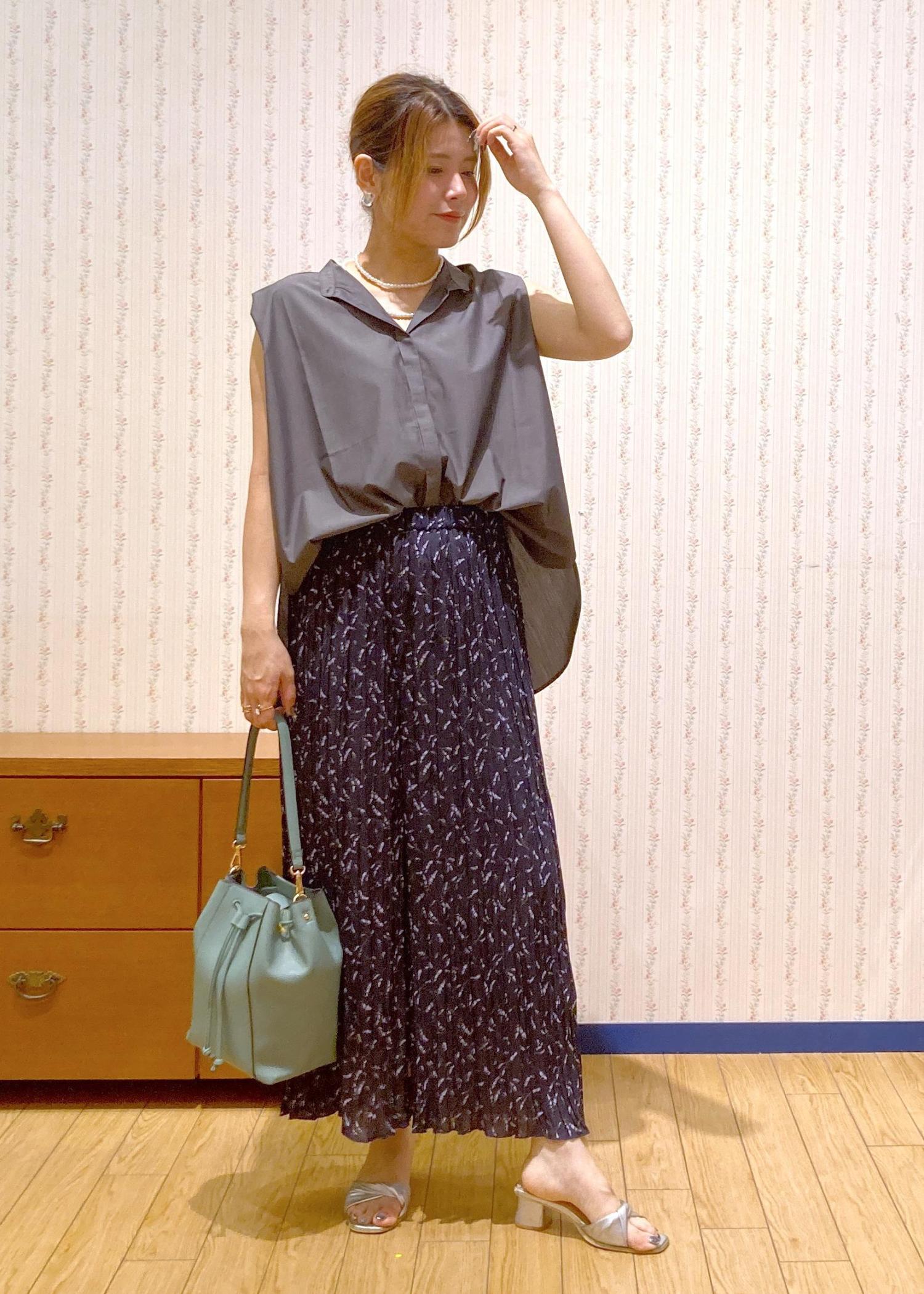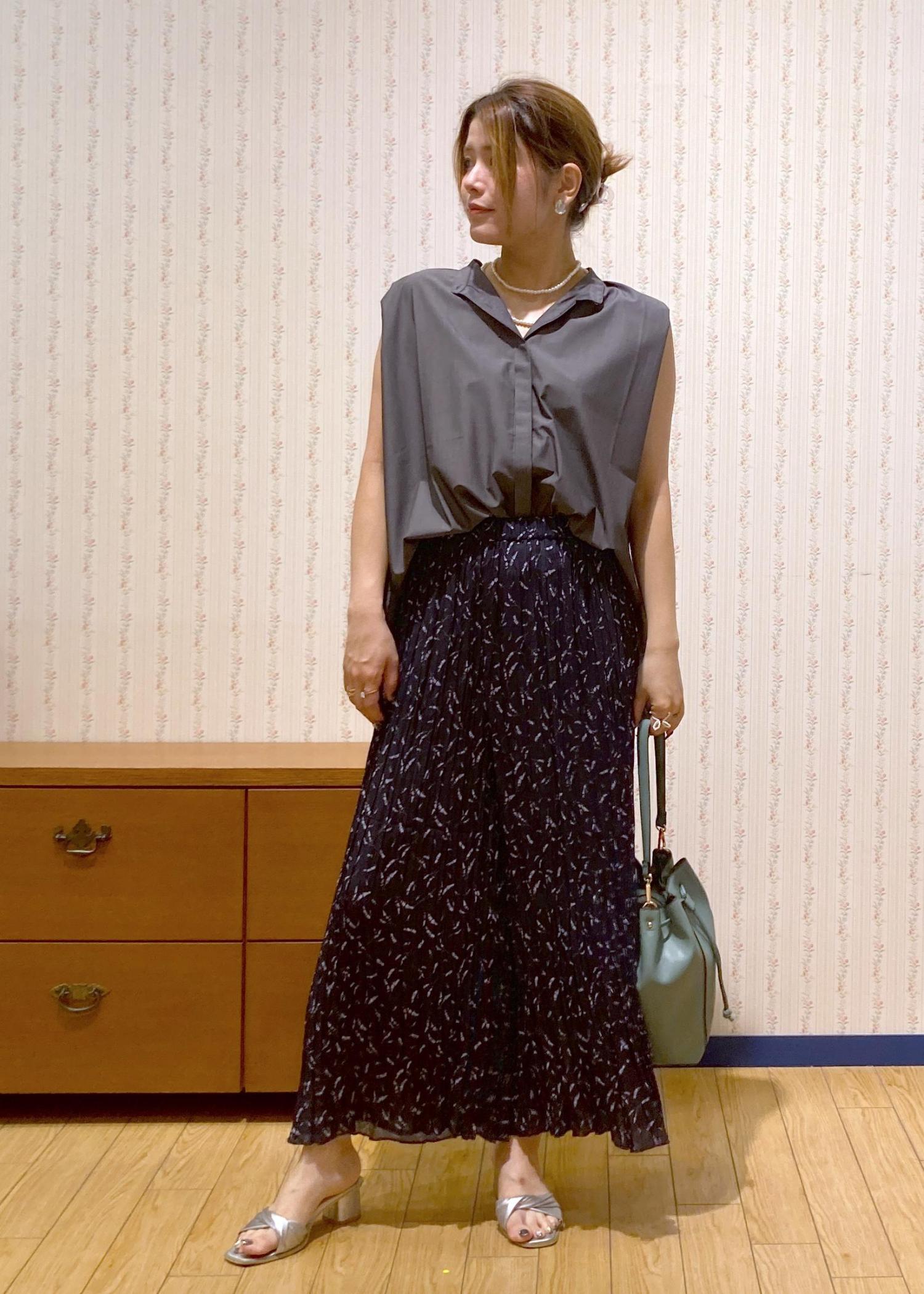 タック入りのノースリーブシャツにラベンダー柄のプリーツパンツを合わせたきちんと感もあるリラックスリゾートコーディネートです。