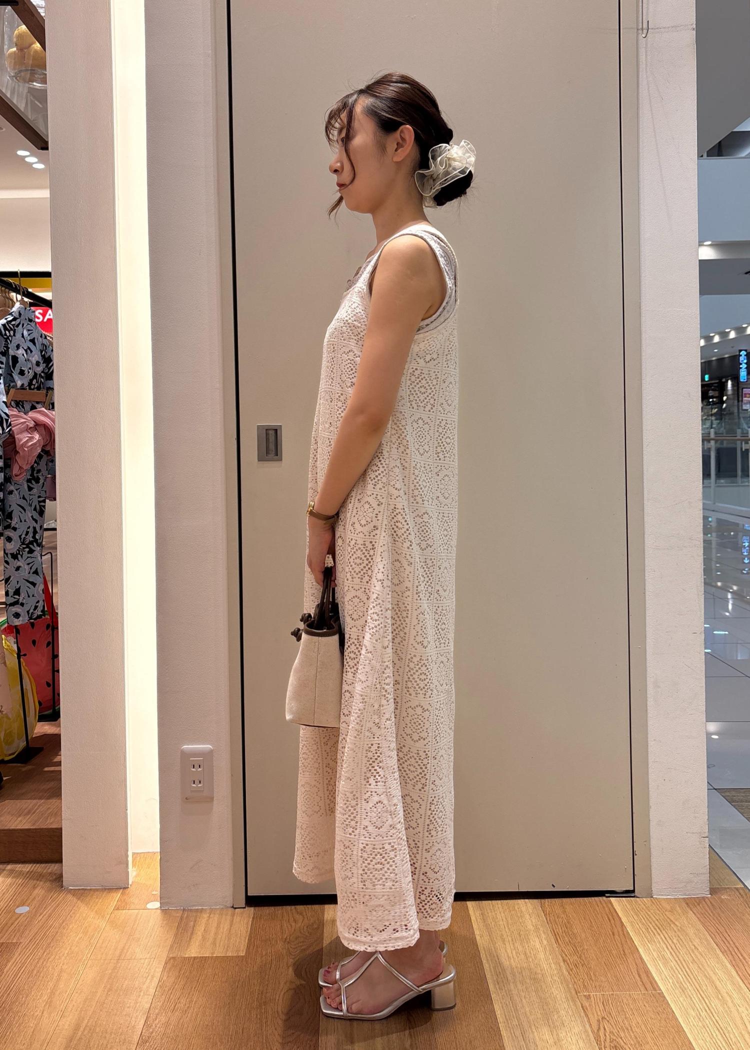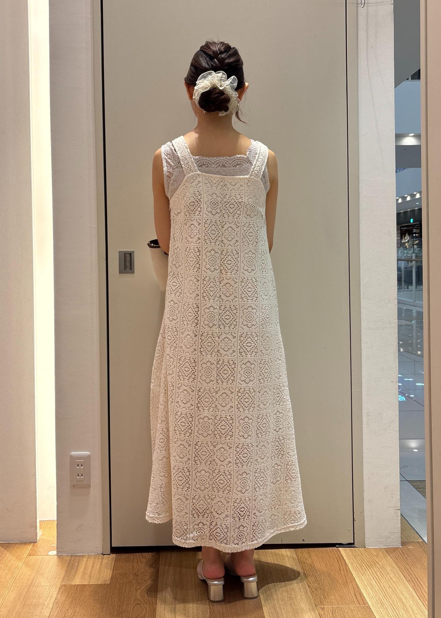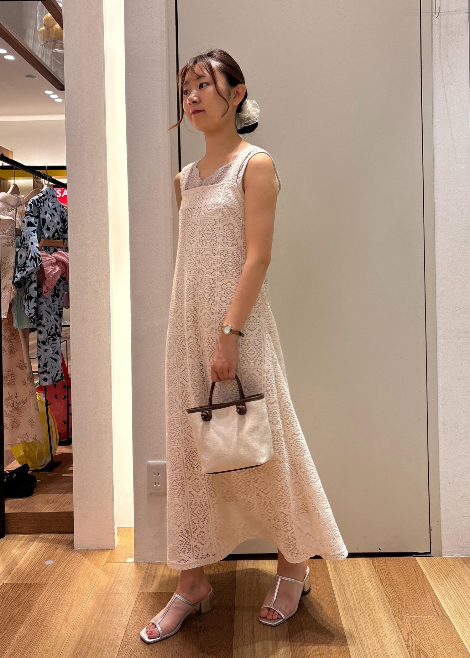 レースのワンピースは女性らしいシルエットで着用できます。1枚で着映えするアイテムです。