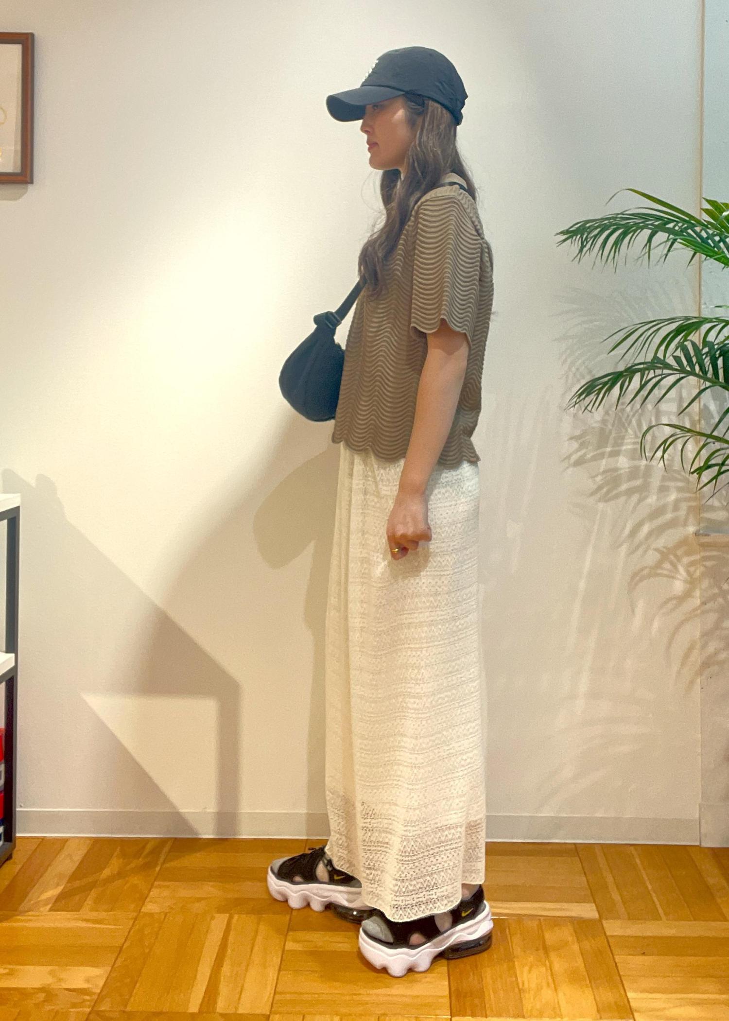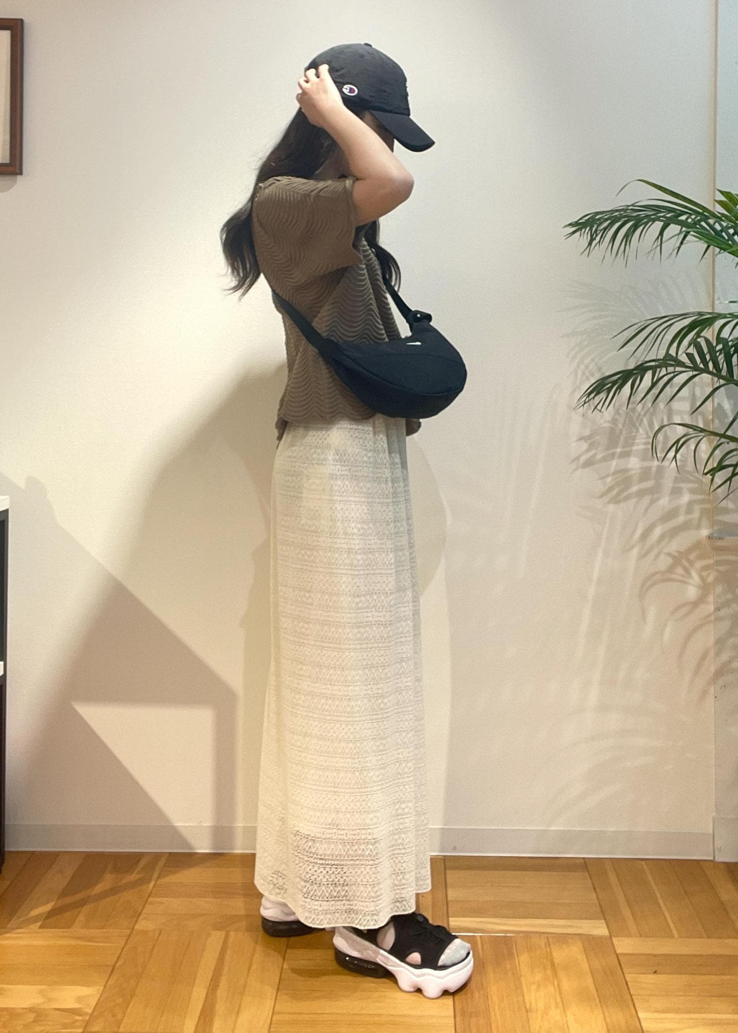 スカートで女性らしさを出しつつ、キャップとサンダルとカーキ色でカジュアル感も出して仕上げました^ ^