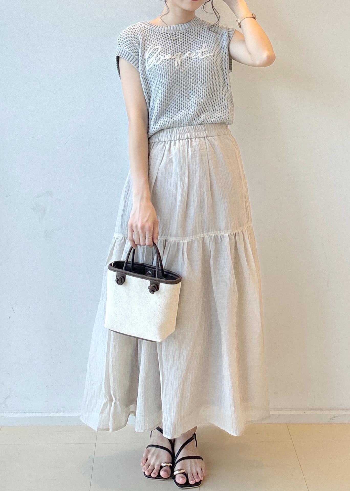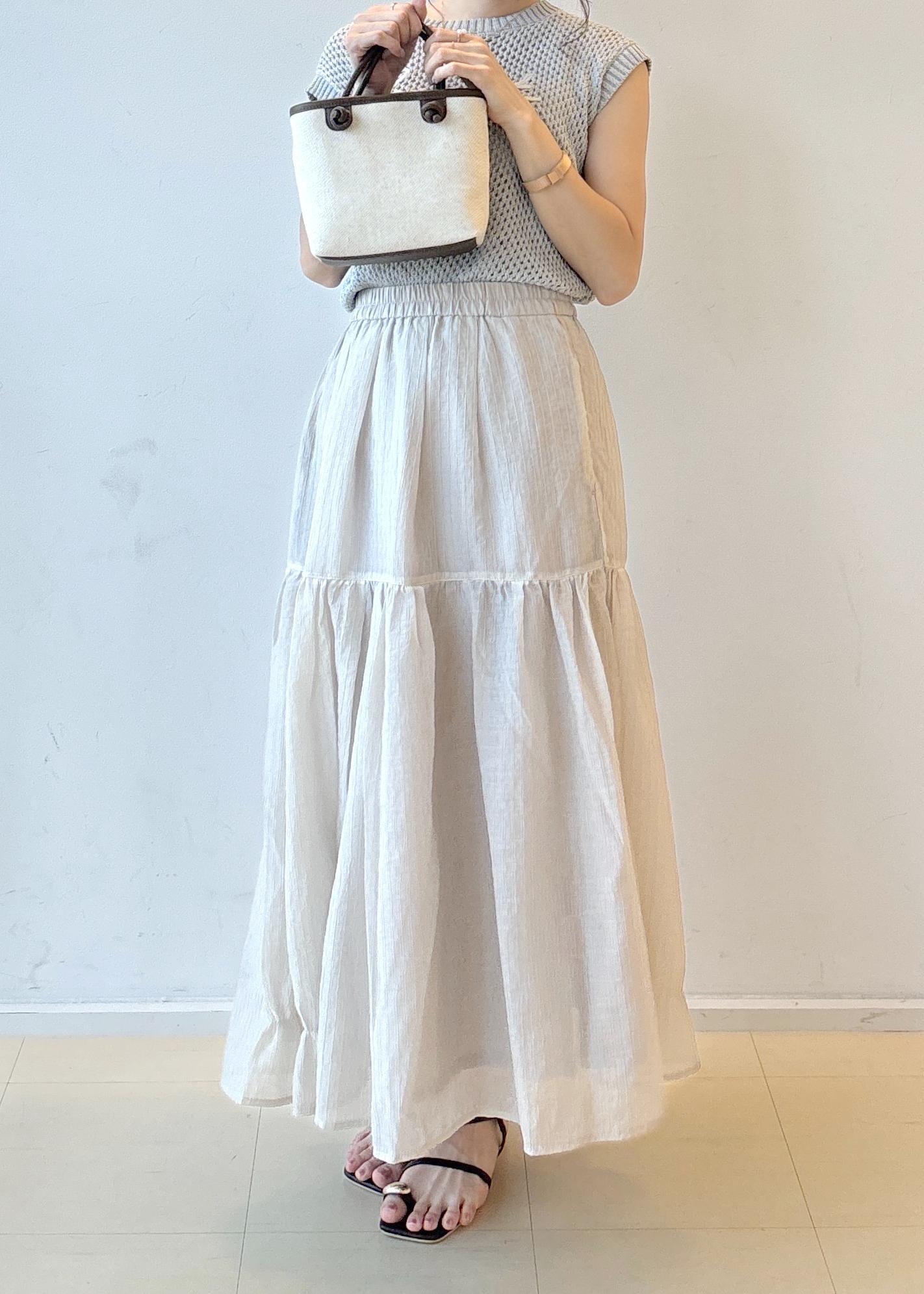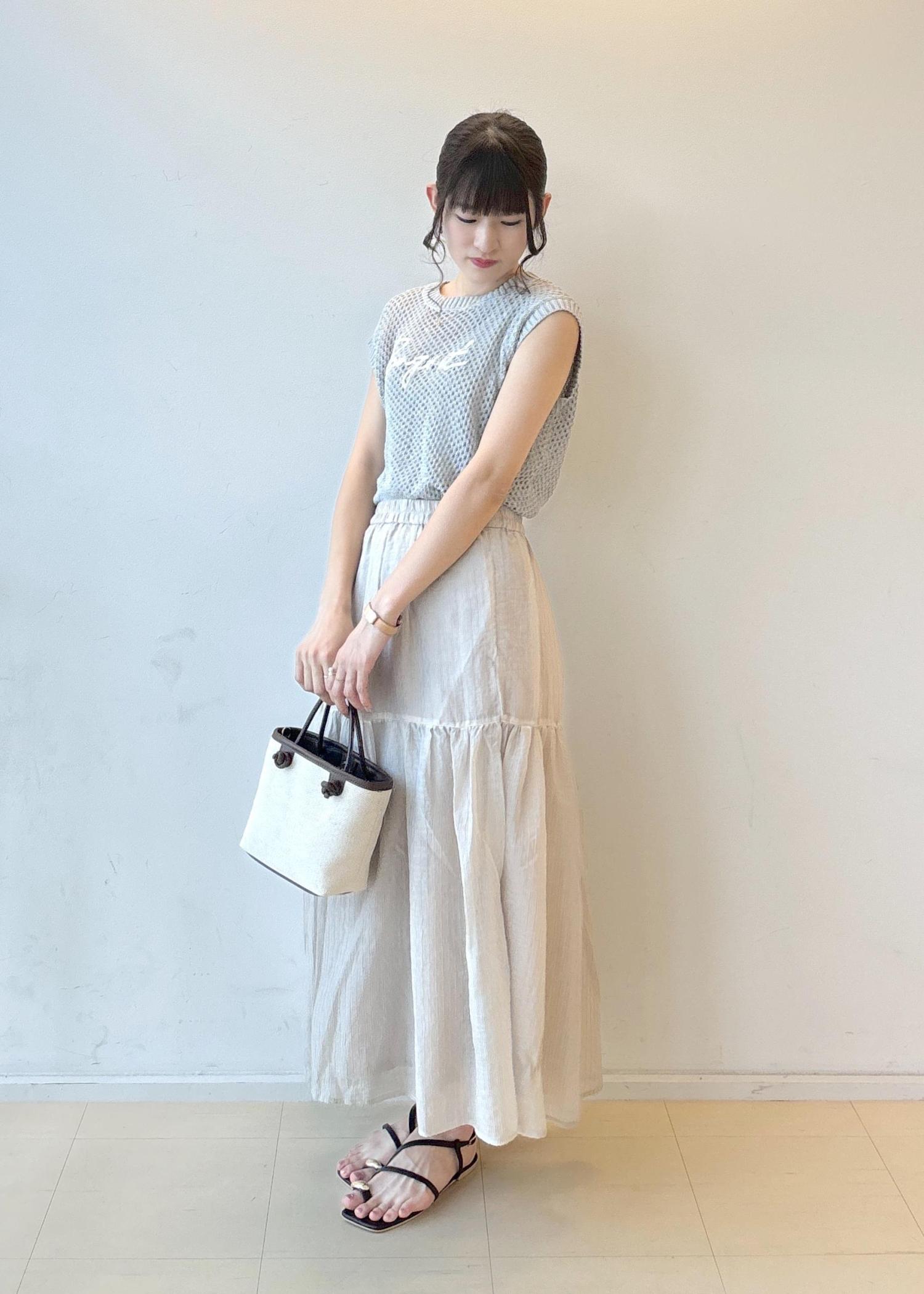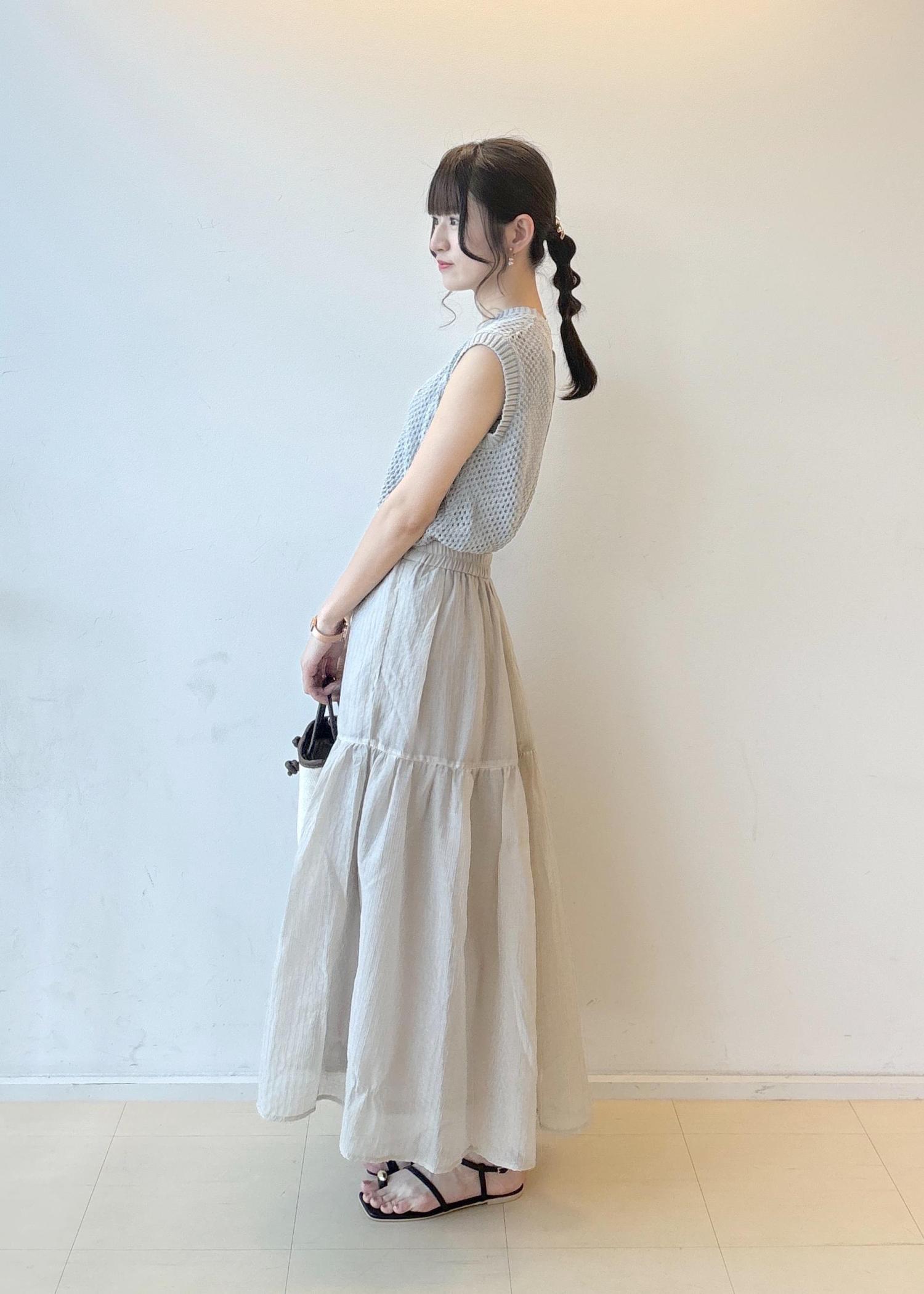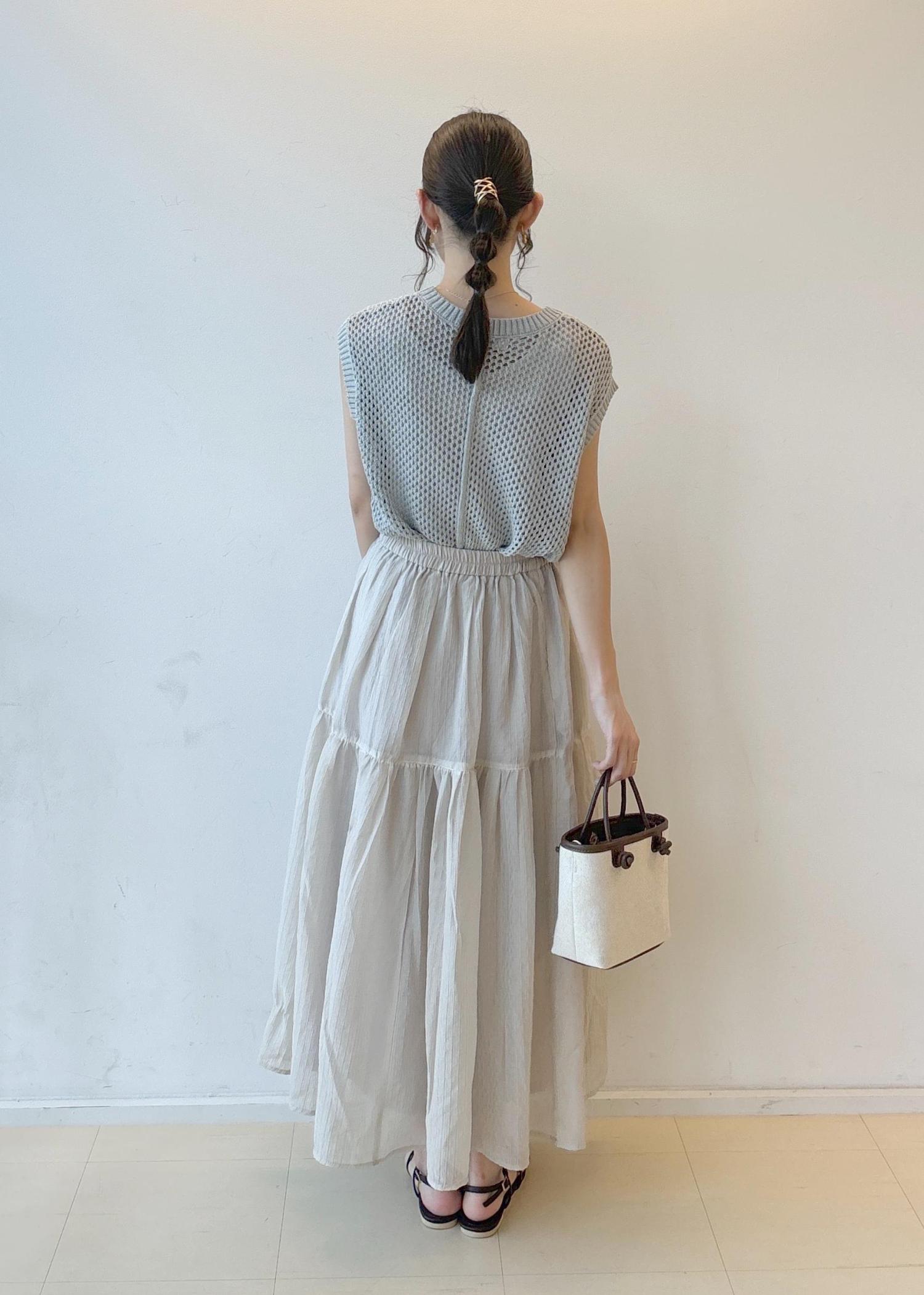 夏らしくトップスのインナーにはタンクトップを合わせて、スカートも透け感のある爽やかな印象のものを選び、涼し気なコーデにしたのがポイントです。