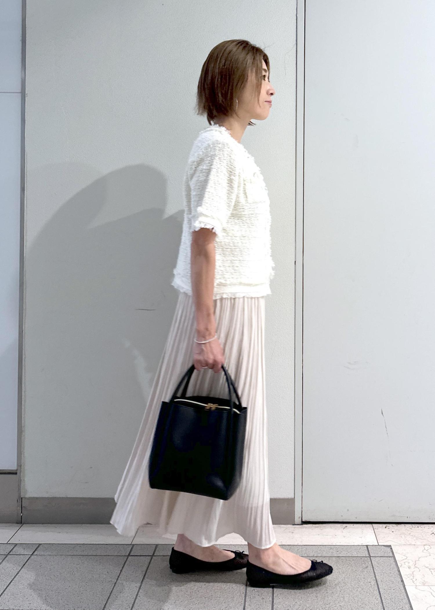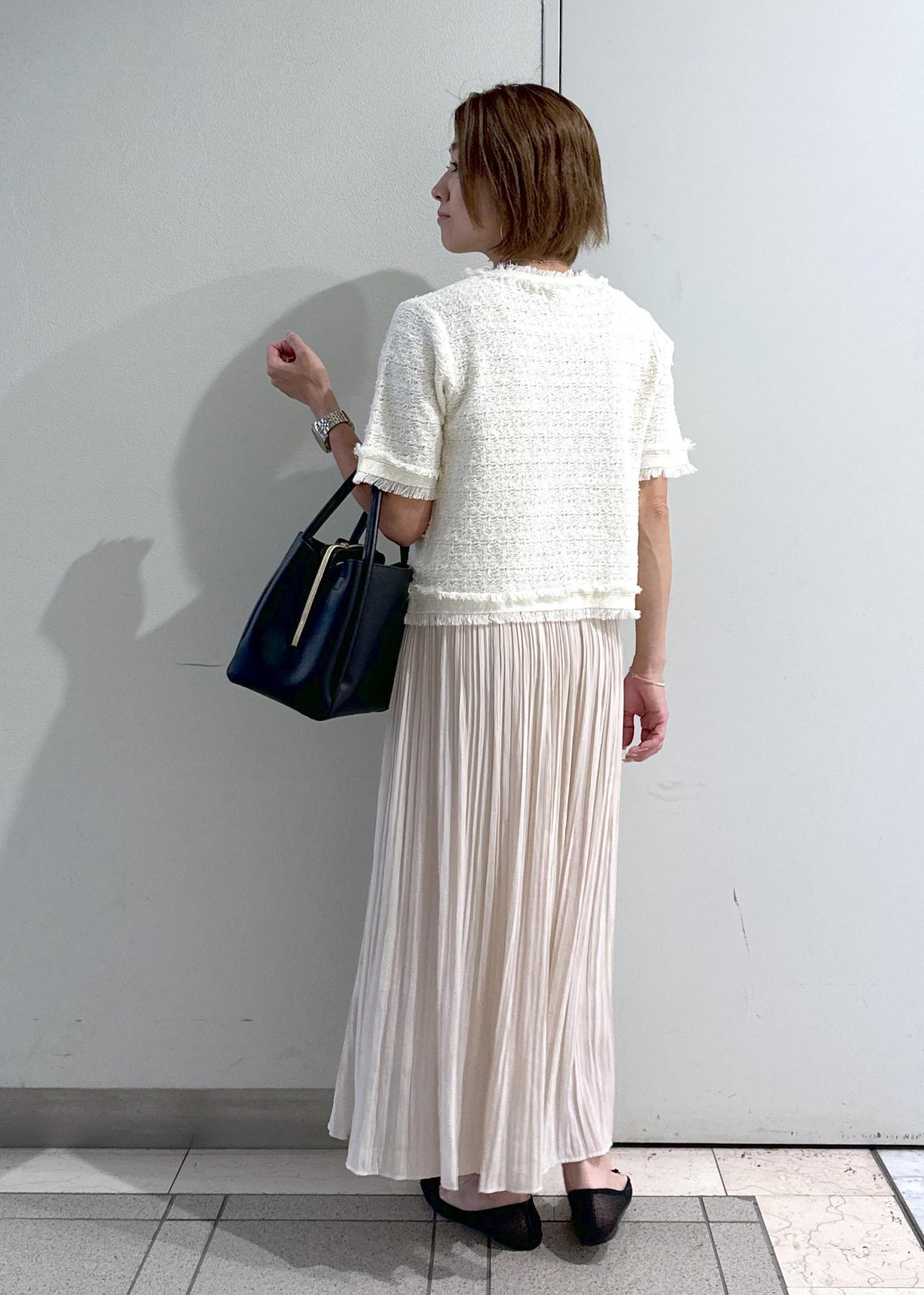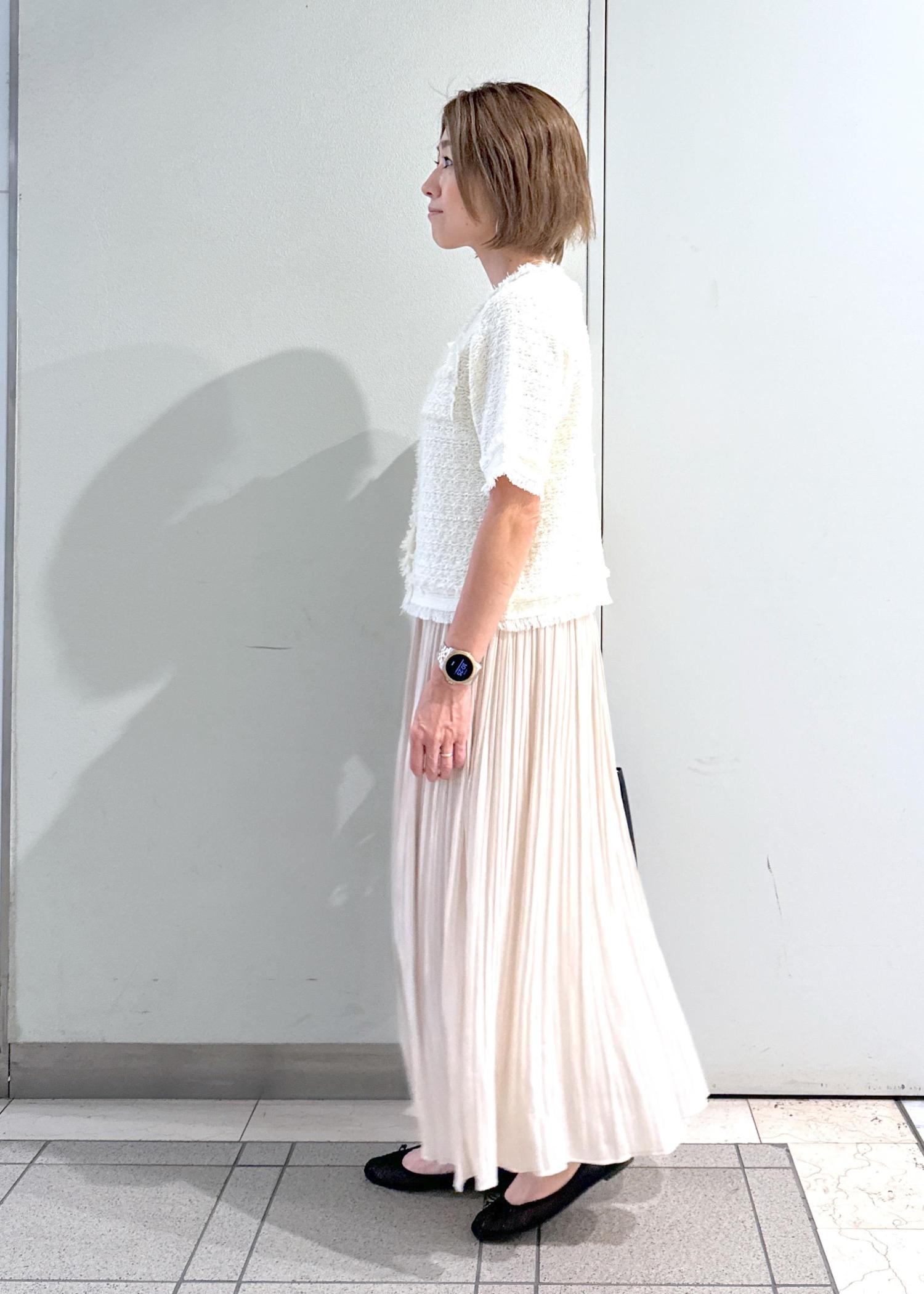 袖丈は肘が少し見える位の長さで、着丈はパンツでもスカートでも合わせやすい丈感になってます。 -