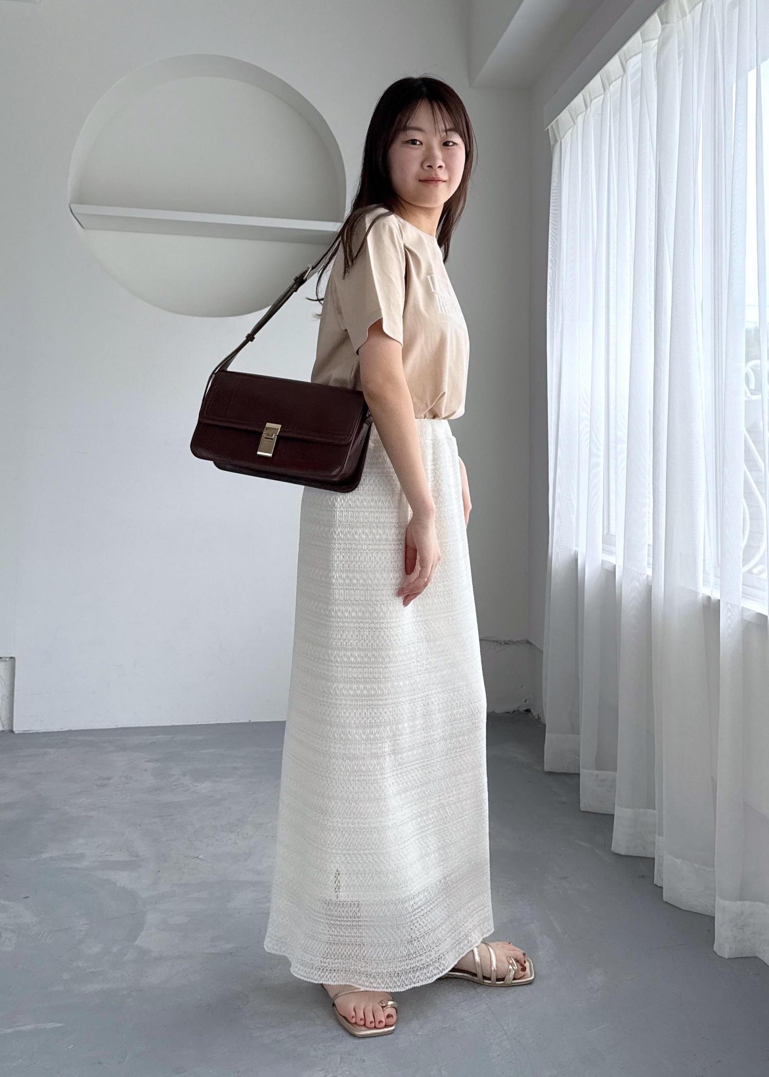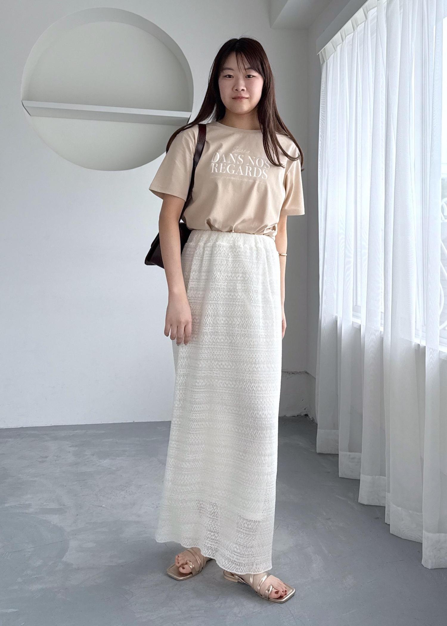 Tシャツの白いロゴを拾い、スカートも白で合わせました。