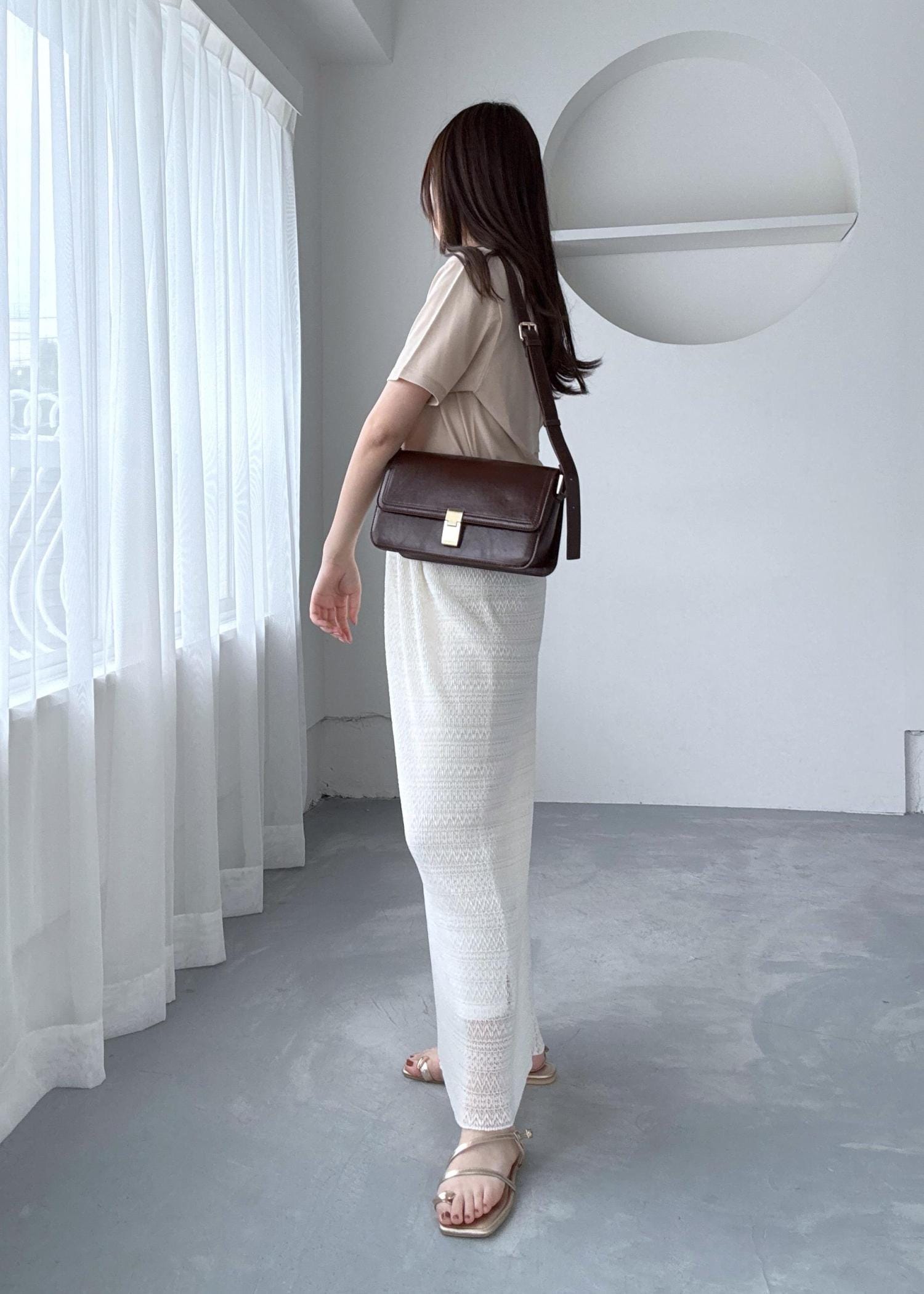 濃い色味のバッグを合わせて、コーディネートを締めているのがポイントです。