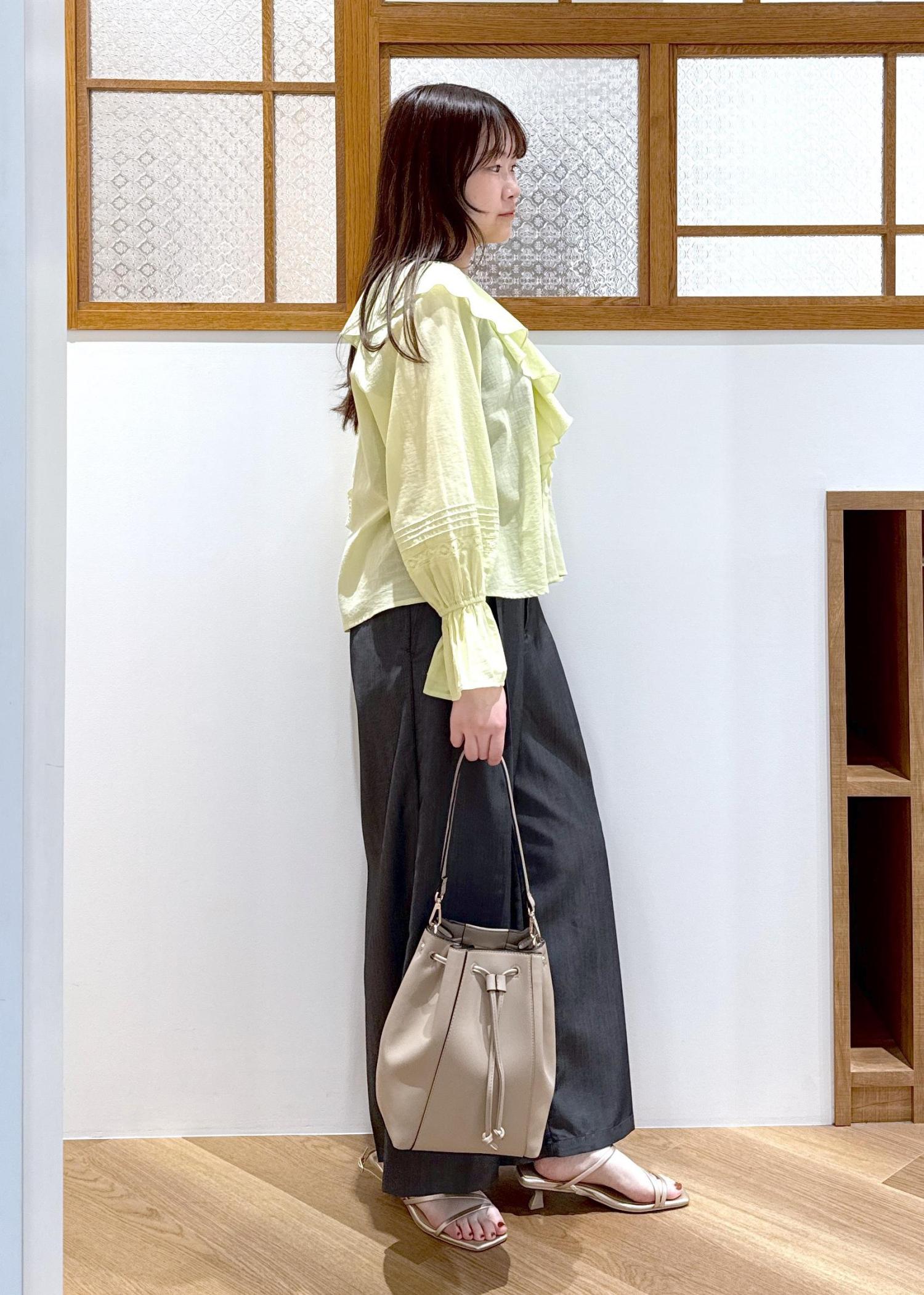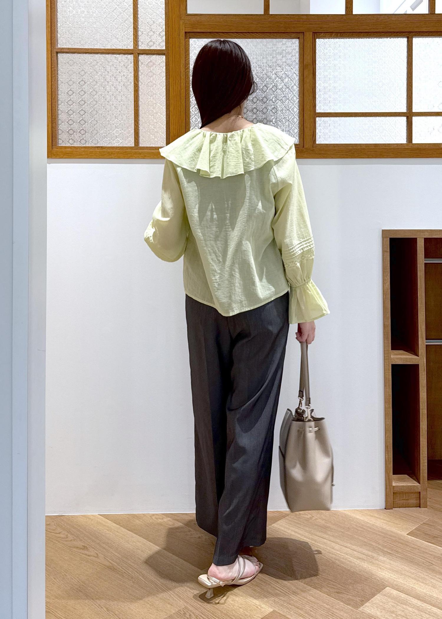 イエローのブラウスにスラックスを合わせて綺麗めな印象にしました。