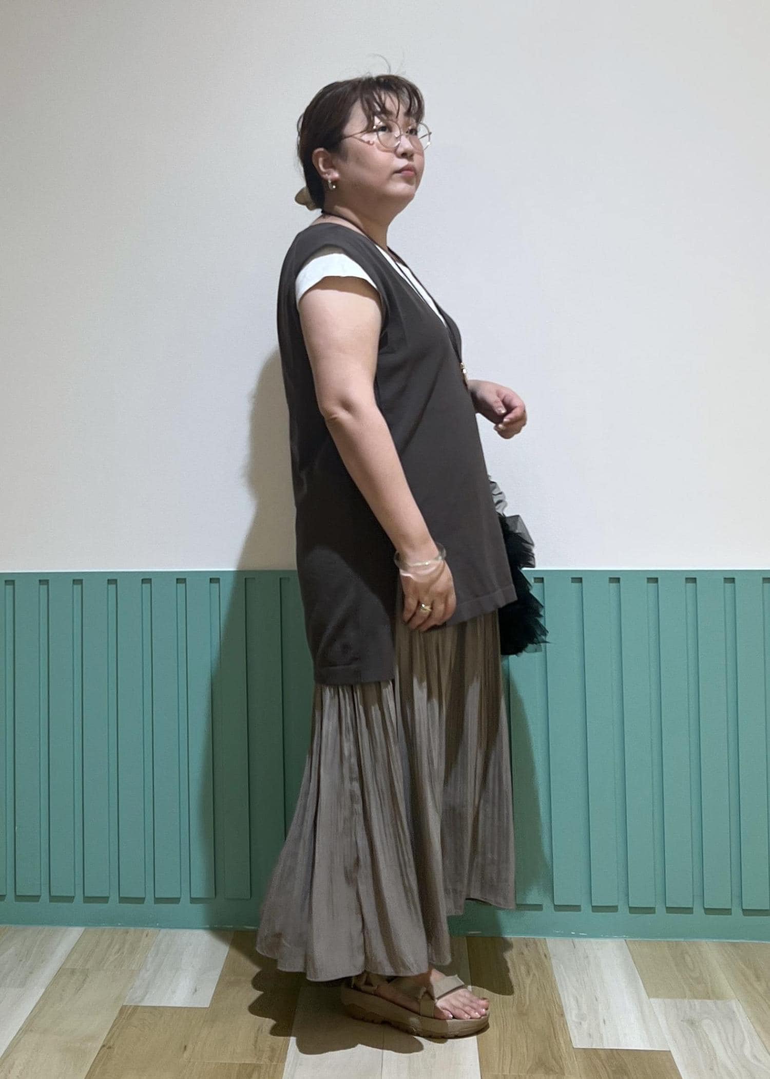 ブラウンのベストとスカートを合わせ