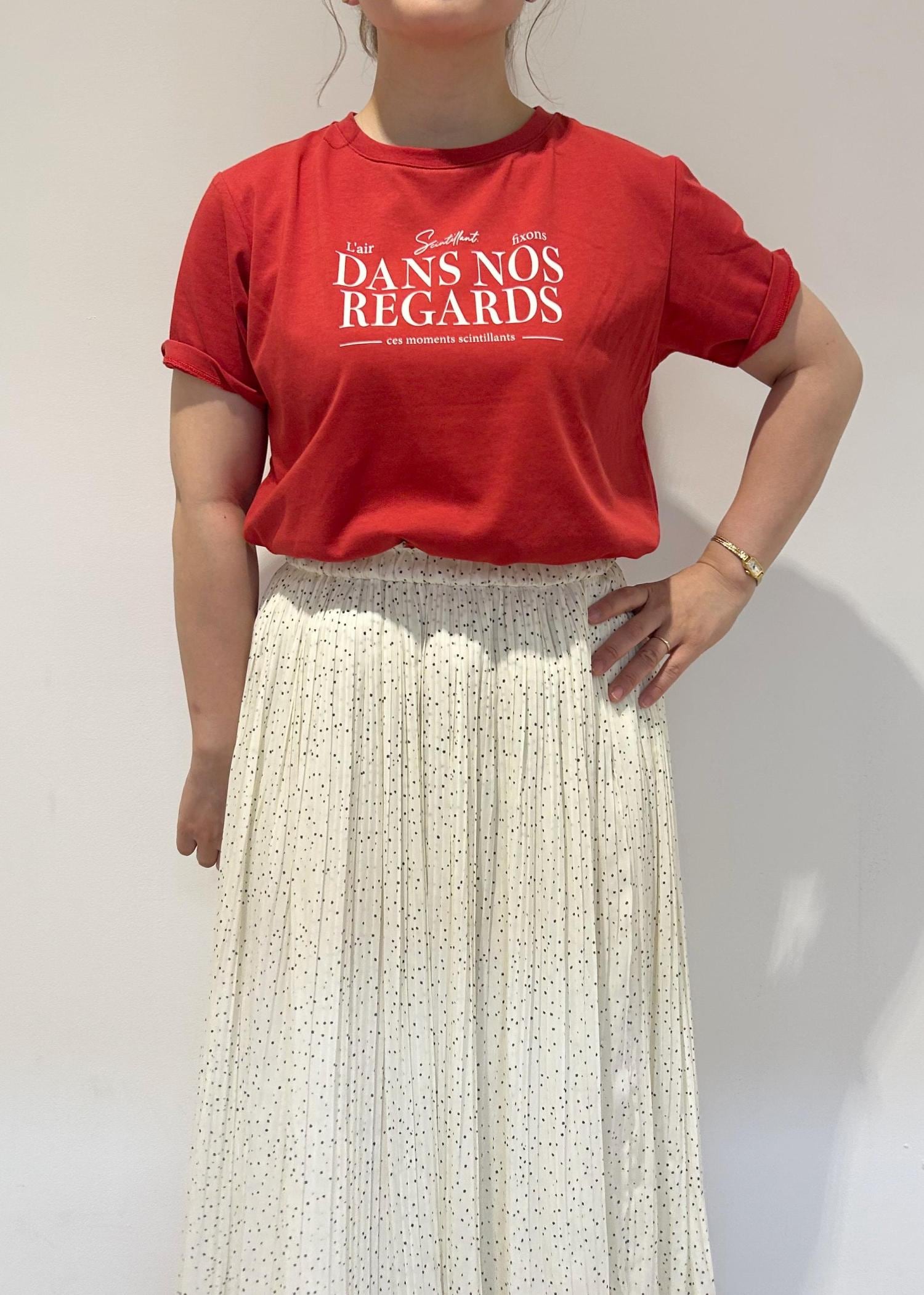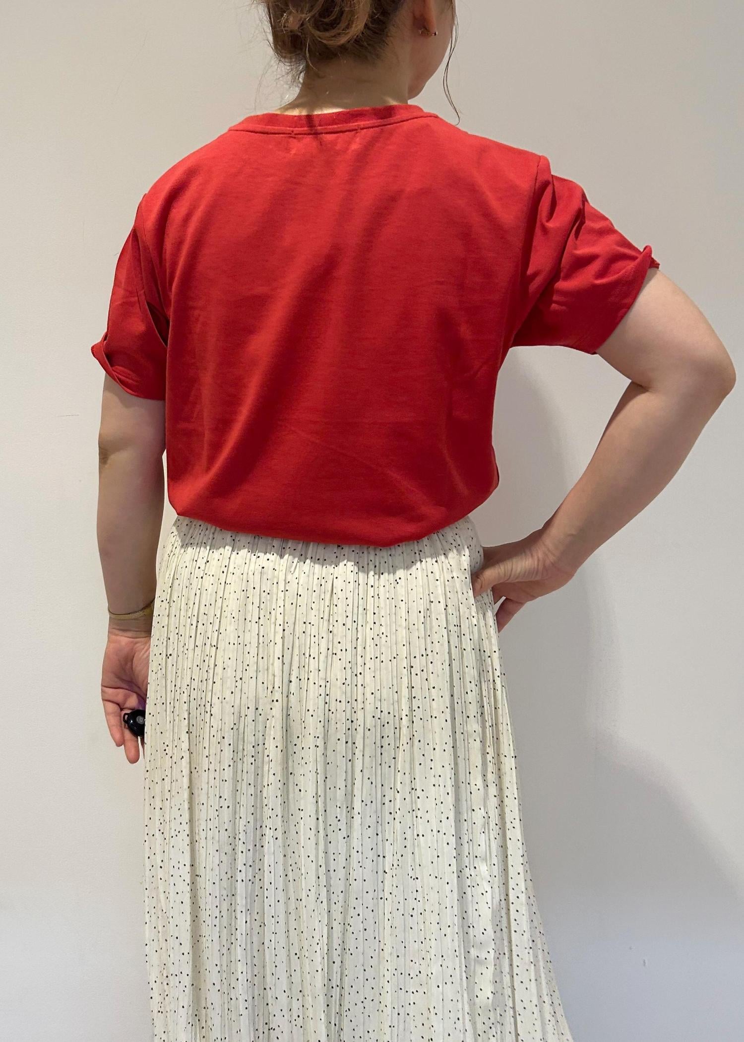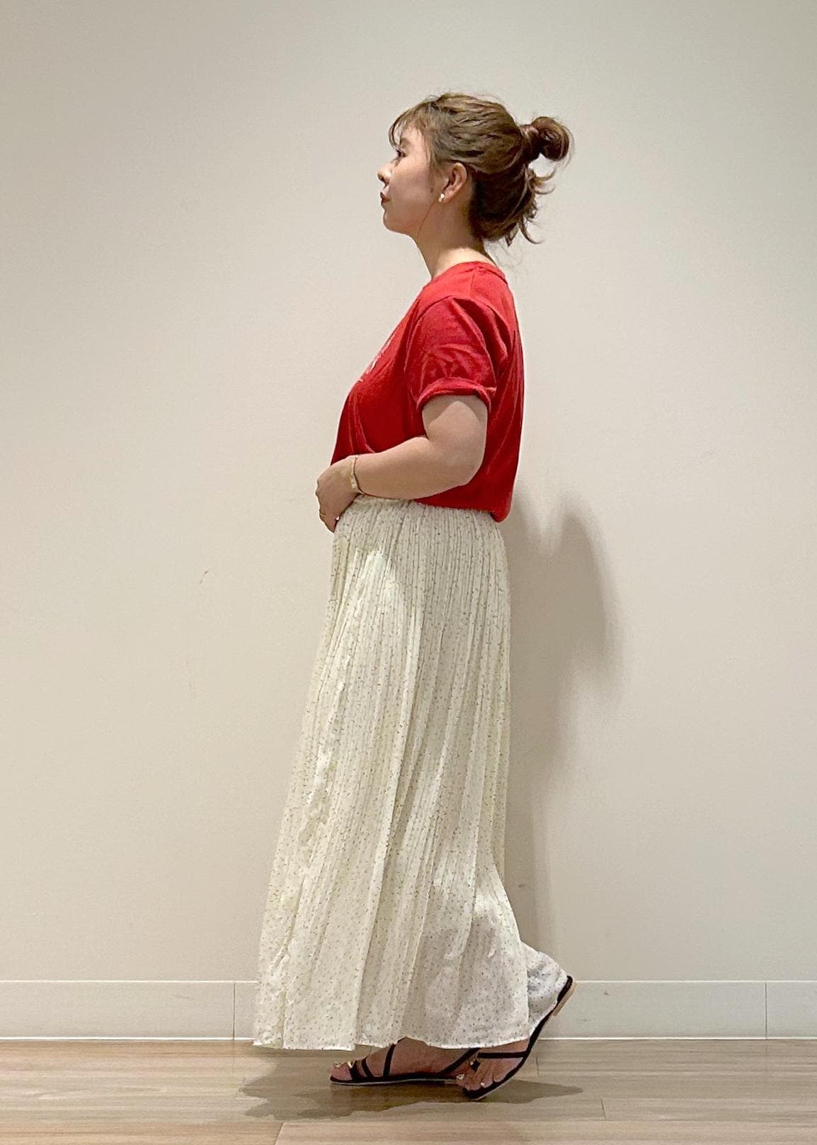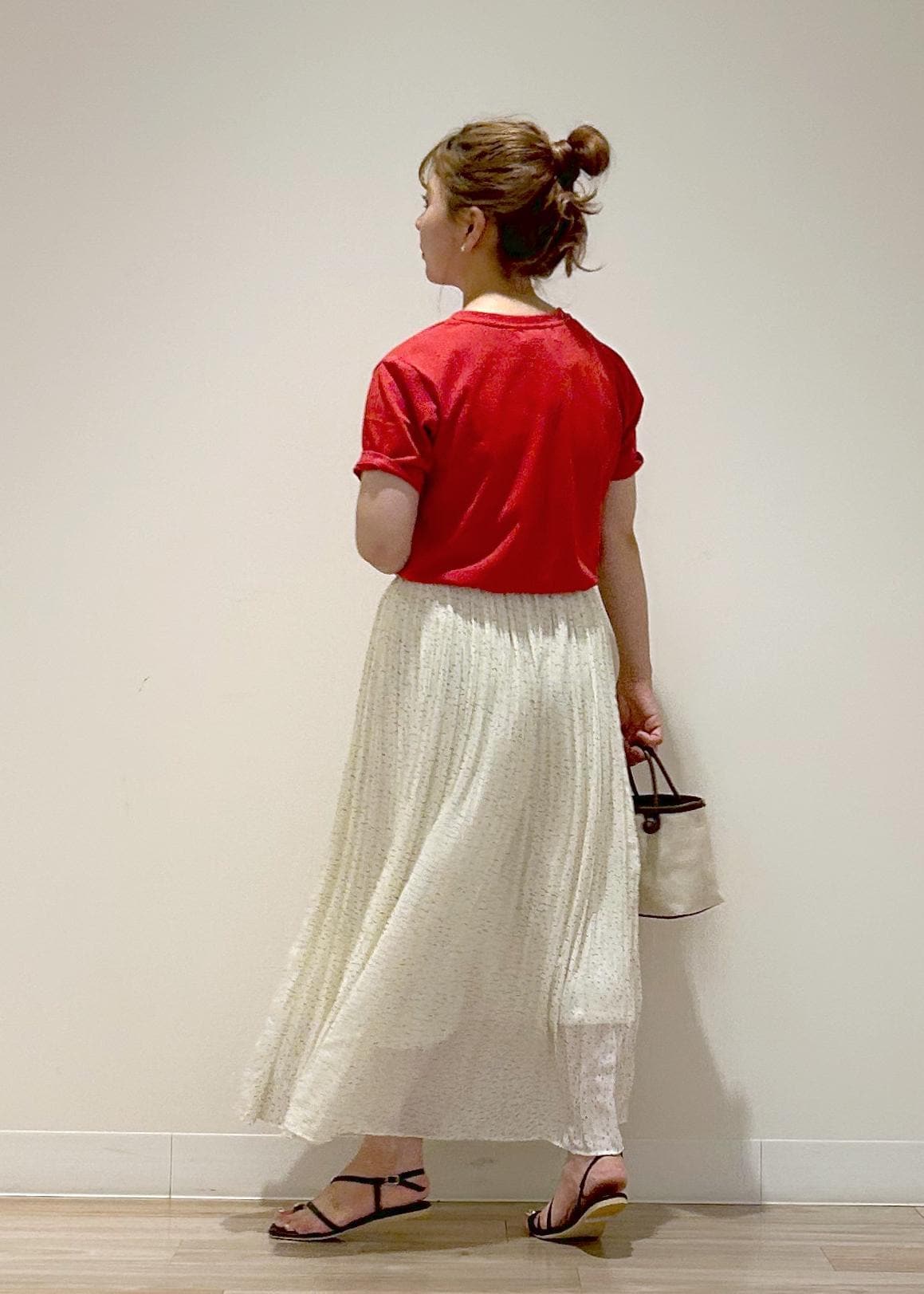 赤のTシャツで、夏らしいカラーコーディネートにしてみました。プリーツスカートやサンダル合わせが涼しげな印象で、夏にぴったりです。
