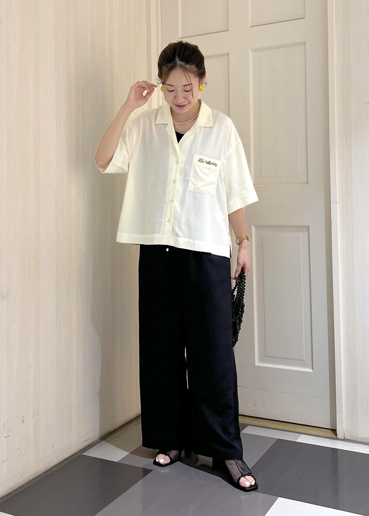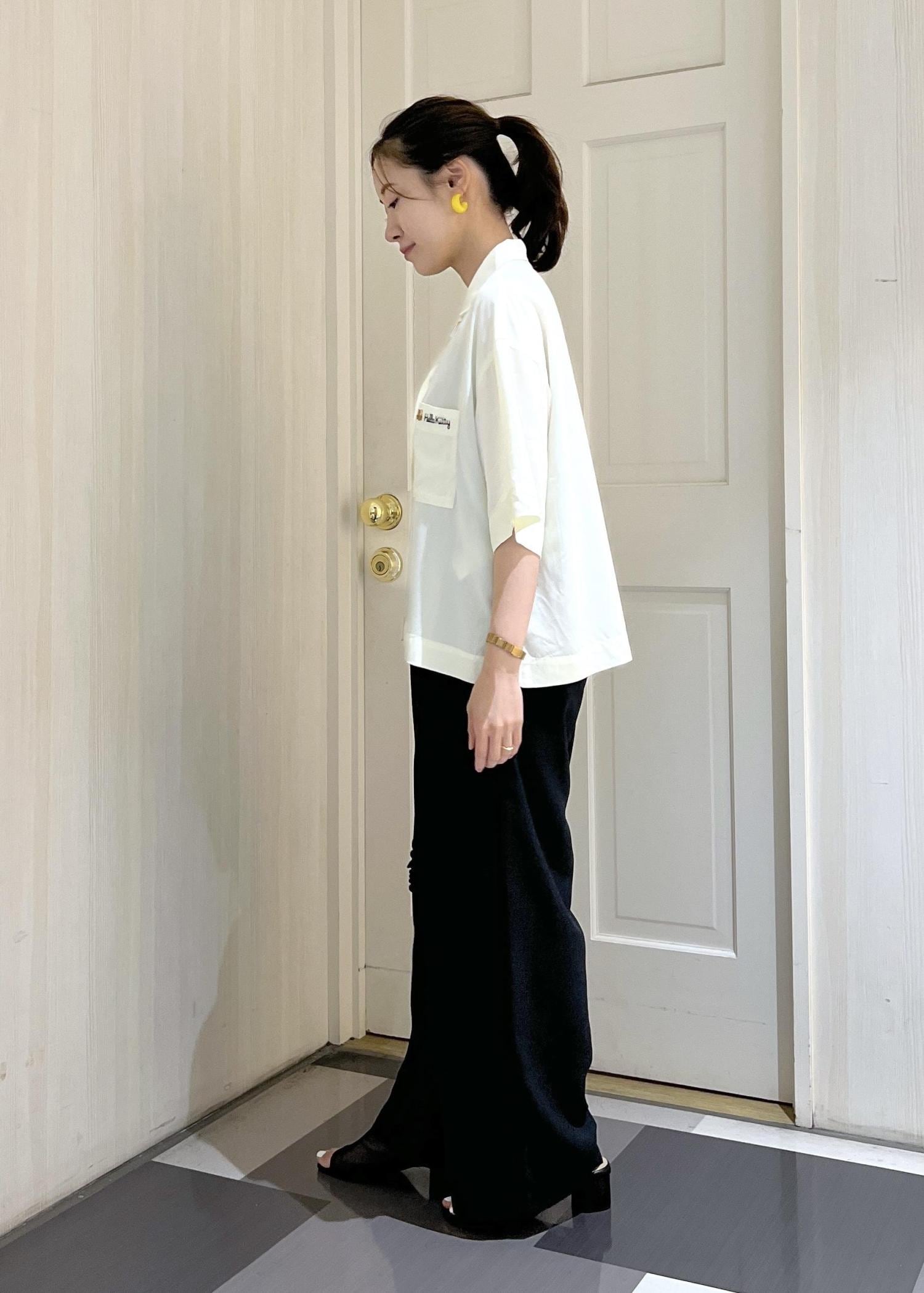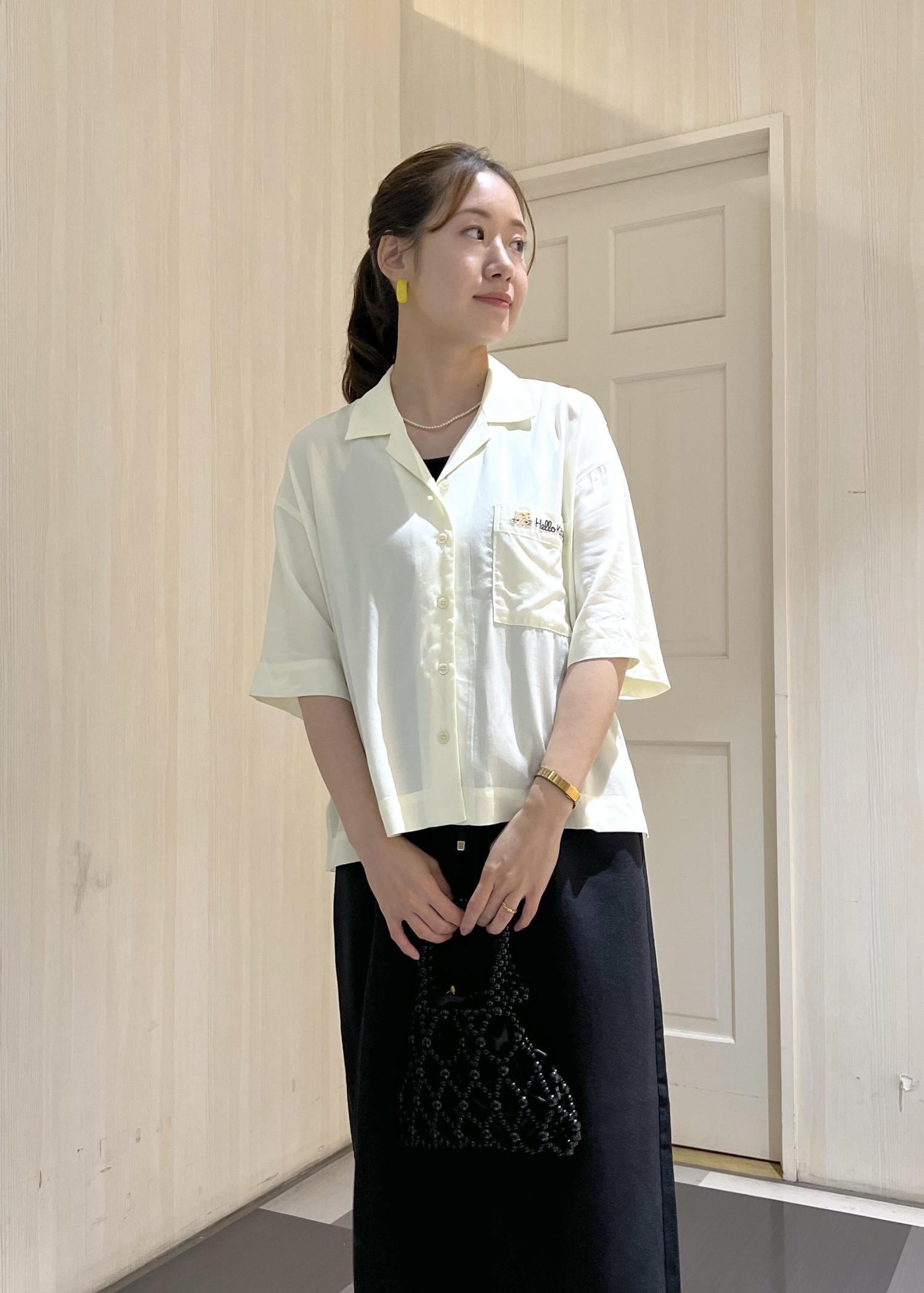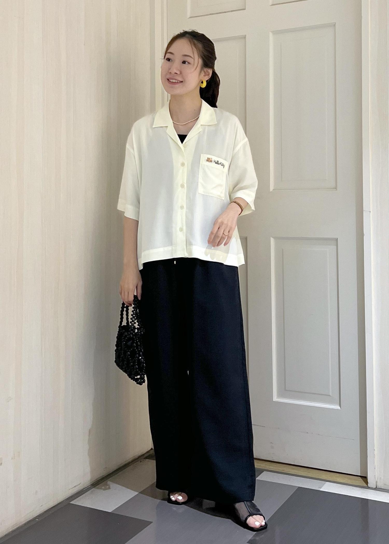 日焼けハローキティの刺繍が入ったシャツを、ワイドパンツと合わせてラフに着てみました!