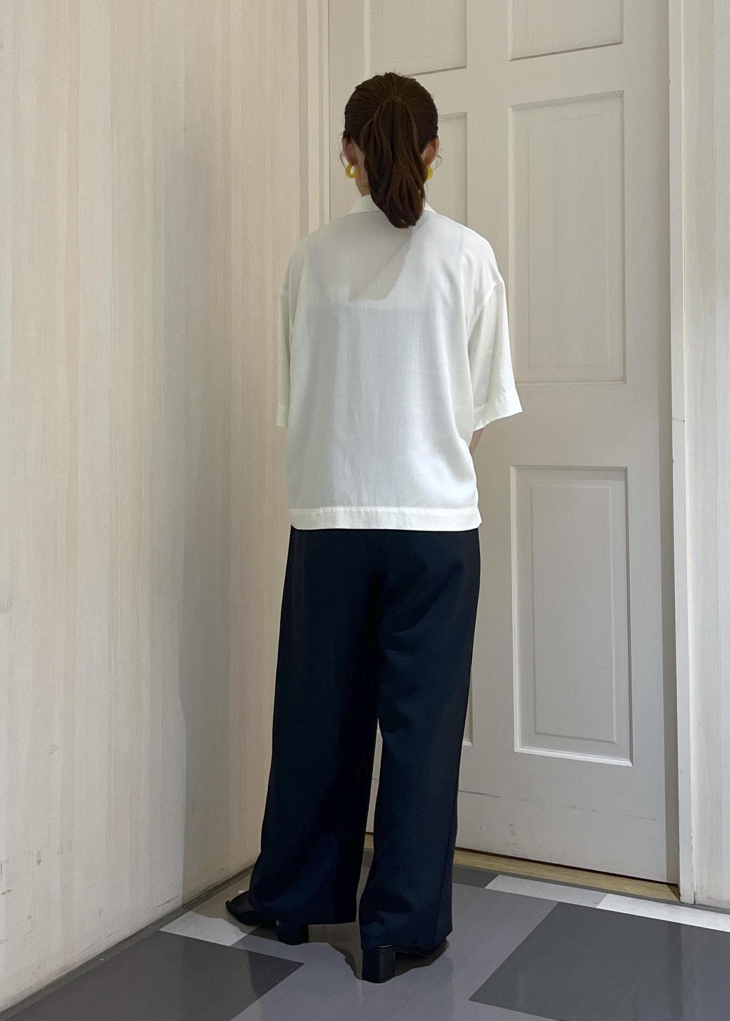 身幅がゆったりしていて、丈が短めなのでトップスとして着るのはもちろん、羽織にしてもバランスがとりやすいシルエットです。 -