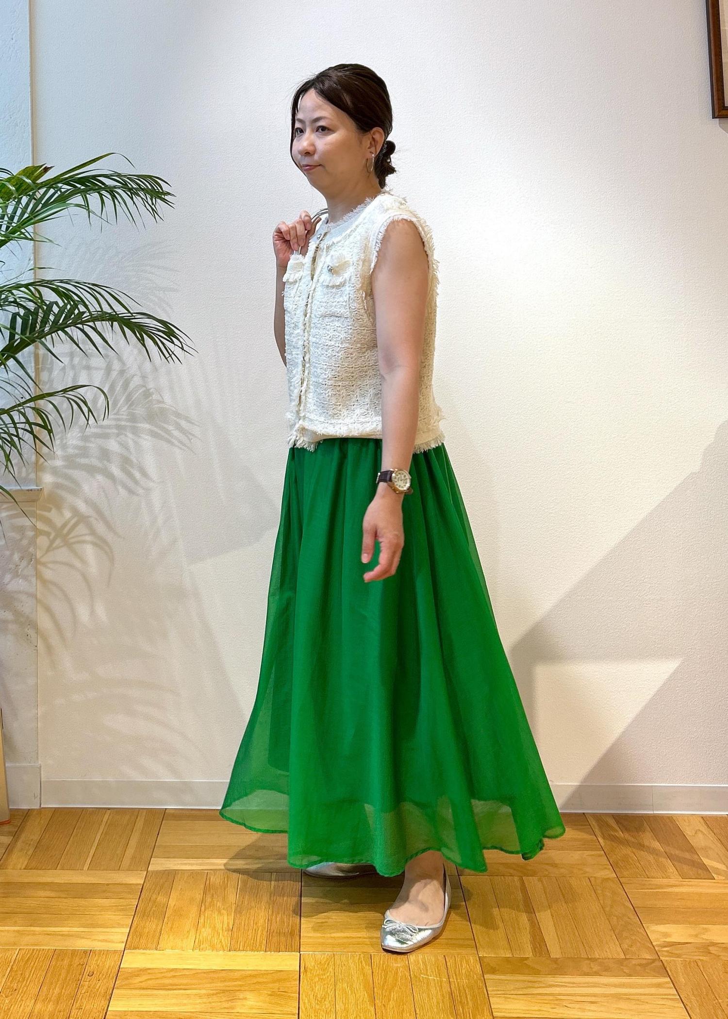このグリーンのスカートをアクセントにその他のアイテムはシンプルに仕上げました。