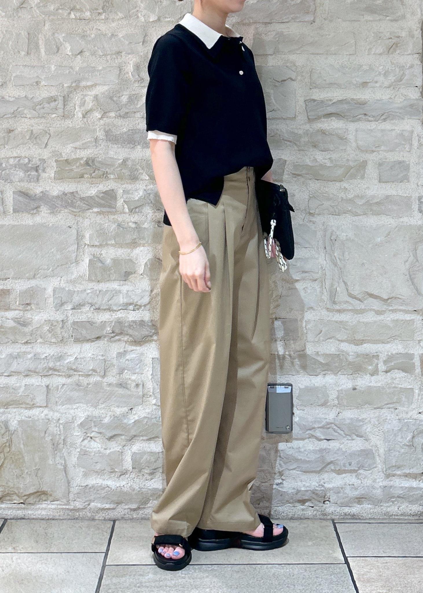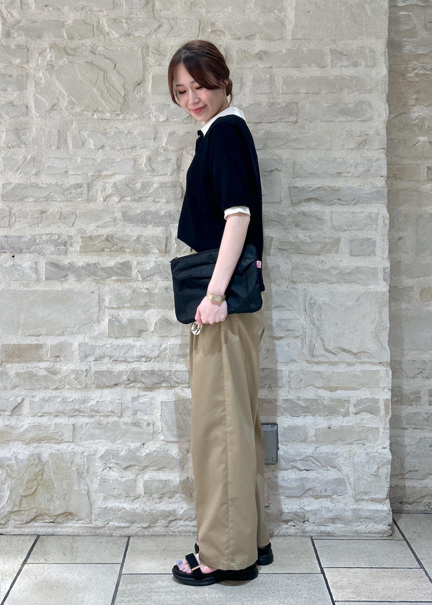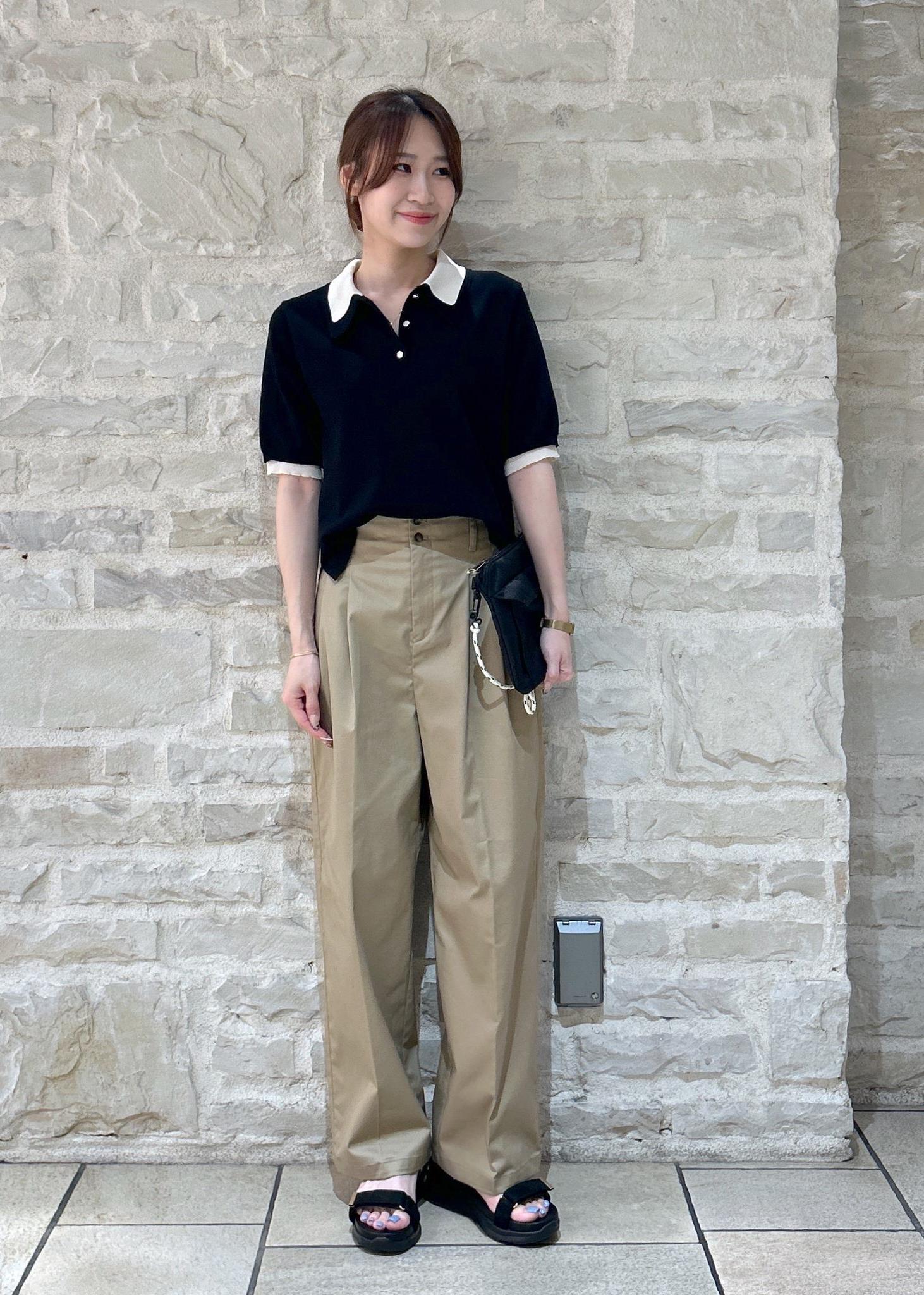 ベージュ×ブラックのトップスでシンプルで夏から秋にかけて使えるようなスタイリングにしました。