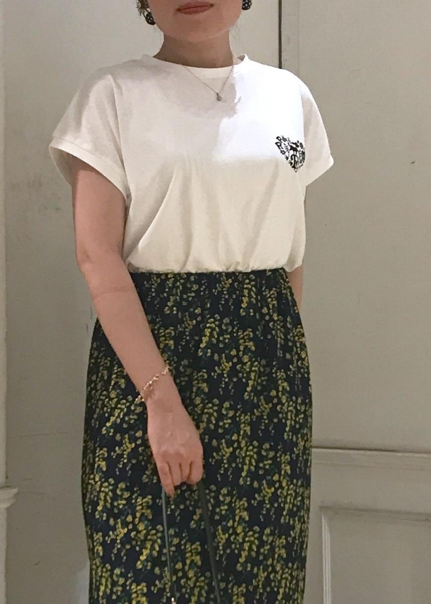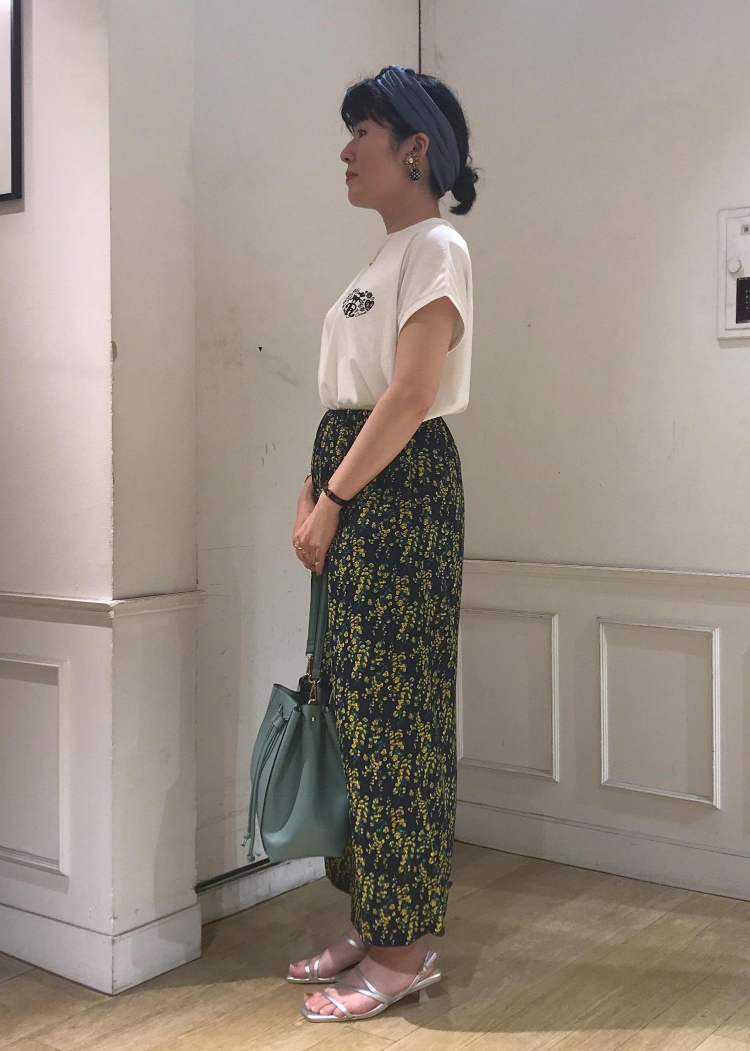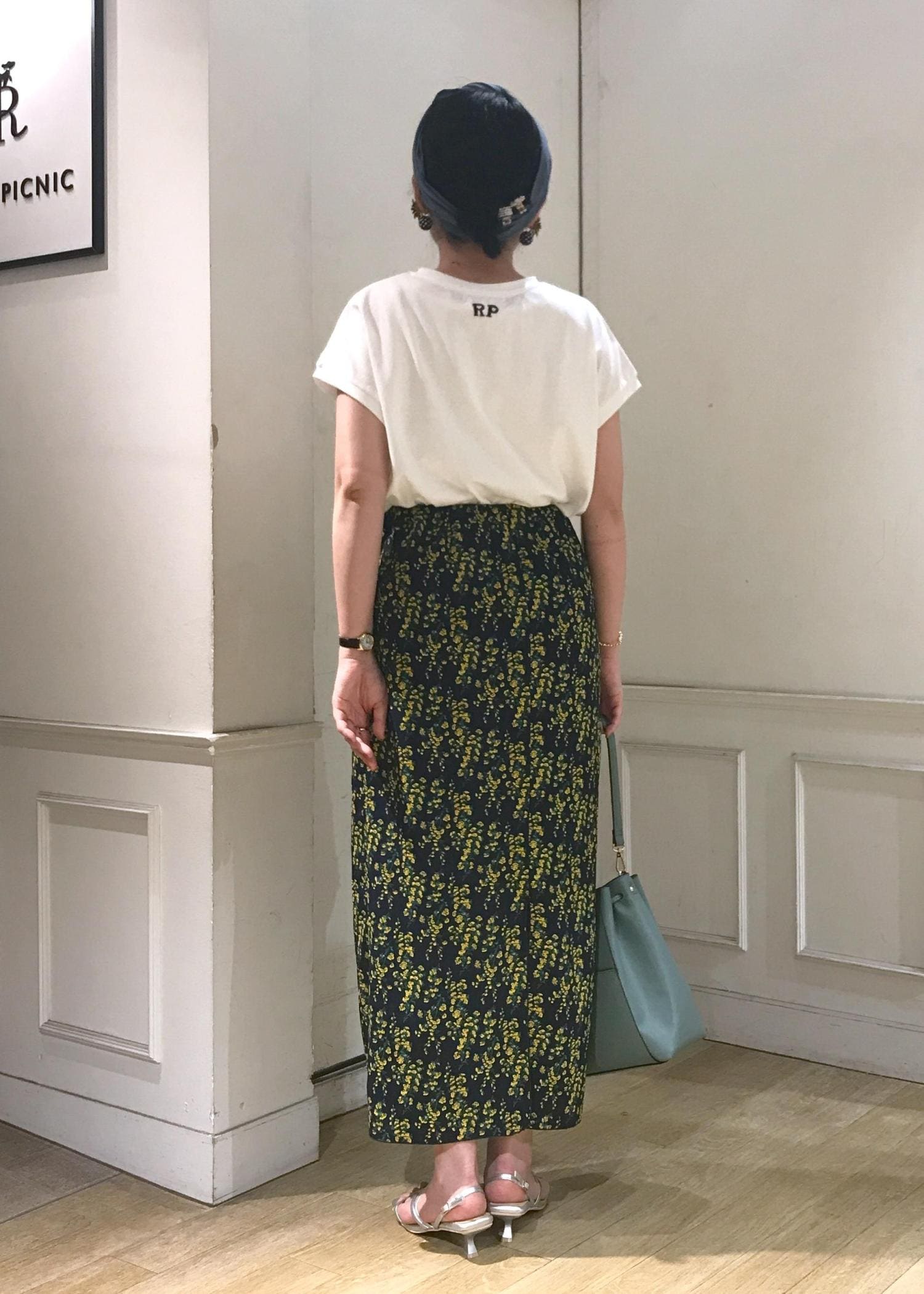 艶感ある柄スカートと合わせて着崩しすぎないスタイルです。