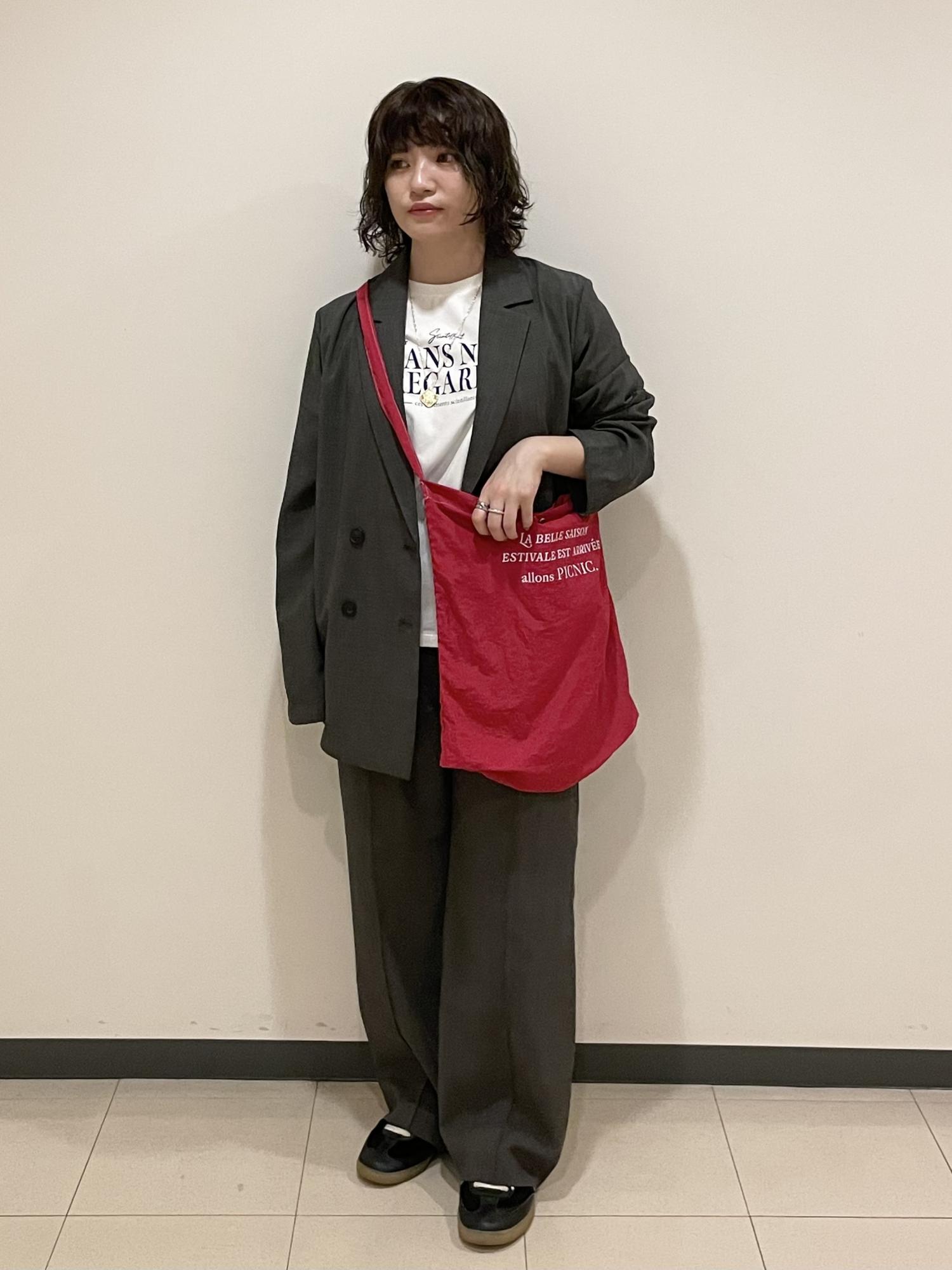 ブラウンで落ち着いた印象になる為、アクセントに赤のバッグをプラス。