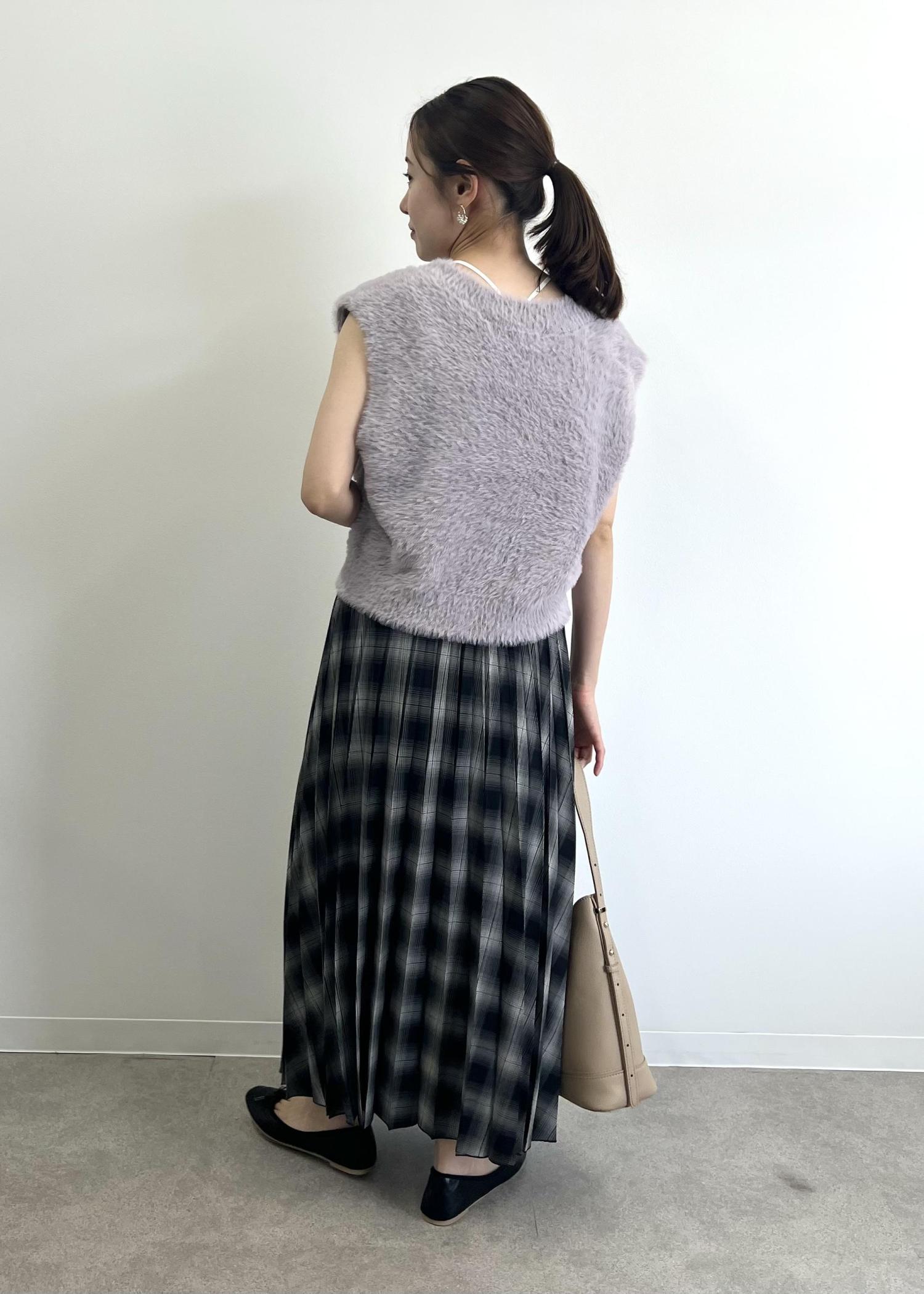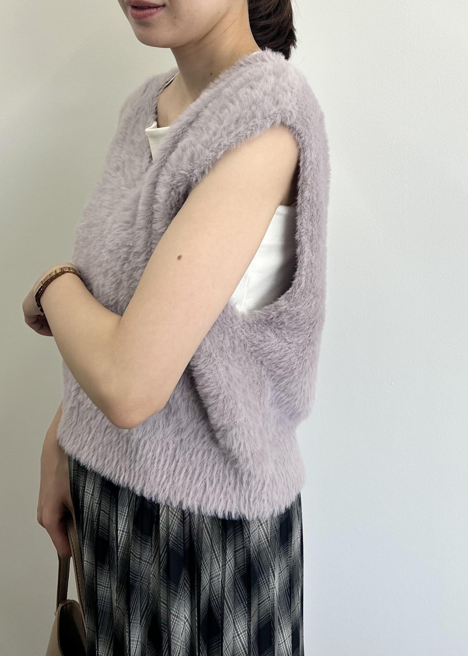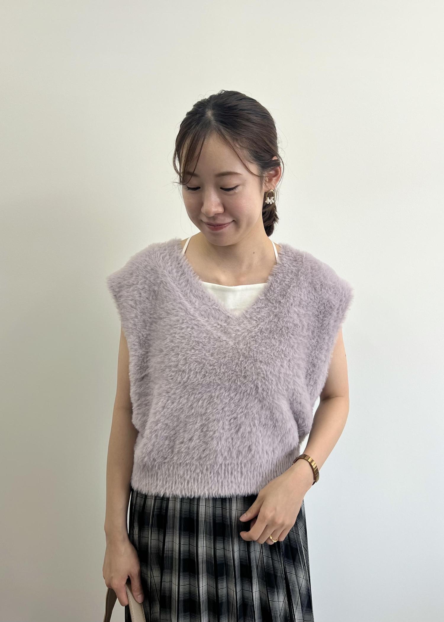 ROPÉ PICNICショートフェザーニットベストパープル系 / F¥3,993レビュー毛足のあるニット素材で、少しラメ感がありました。コンパクトな着丈なのでインせず綺麗に着こなせます。
