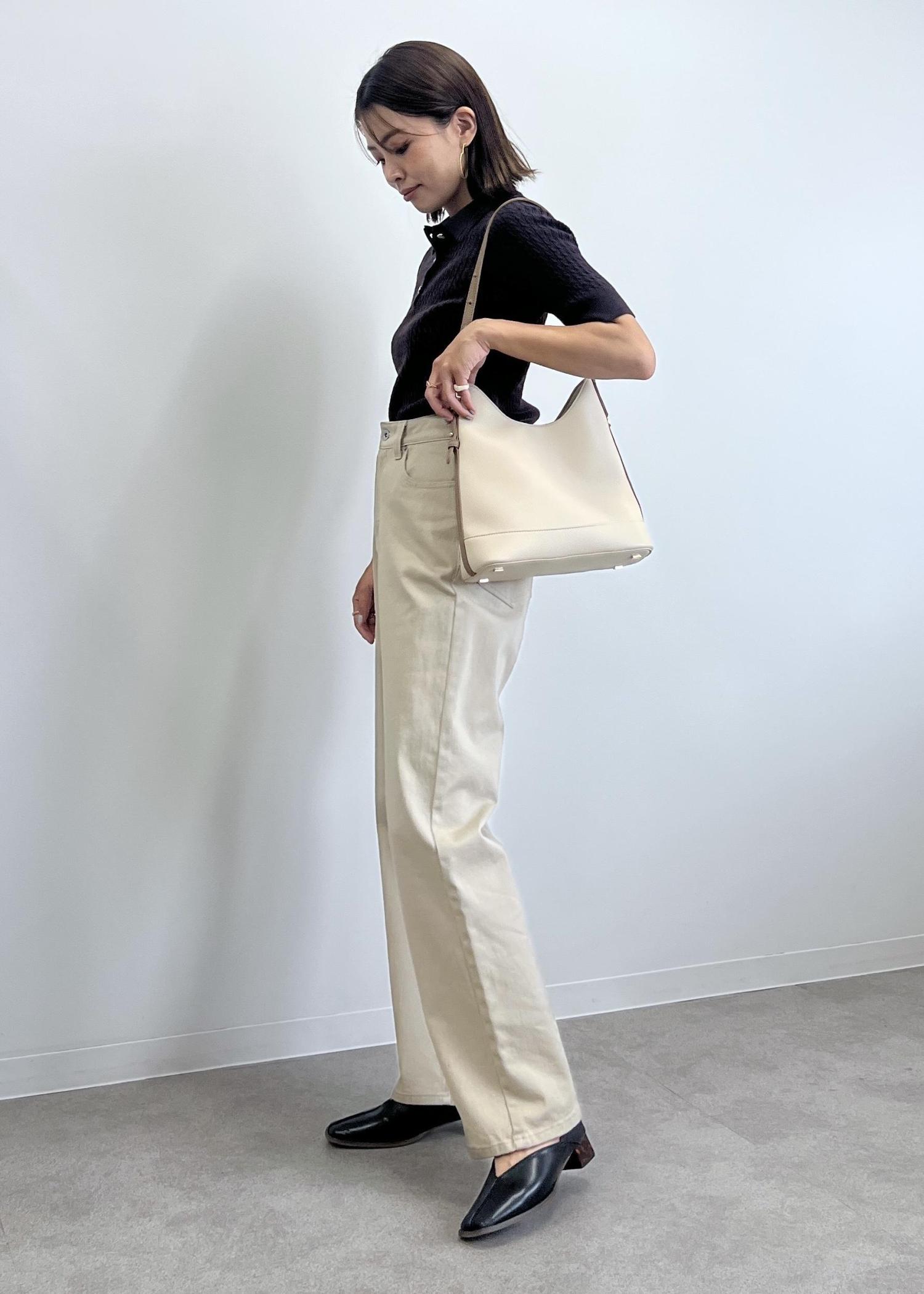 ベージュのハイウエストデニムを合わせてスッキリ感のある、大人スタイリングにしました。