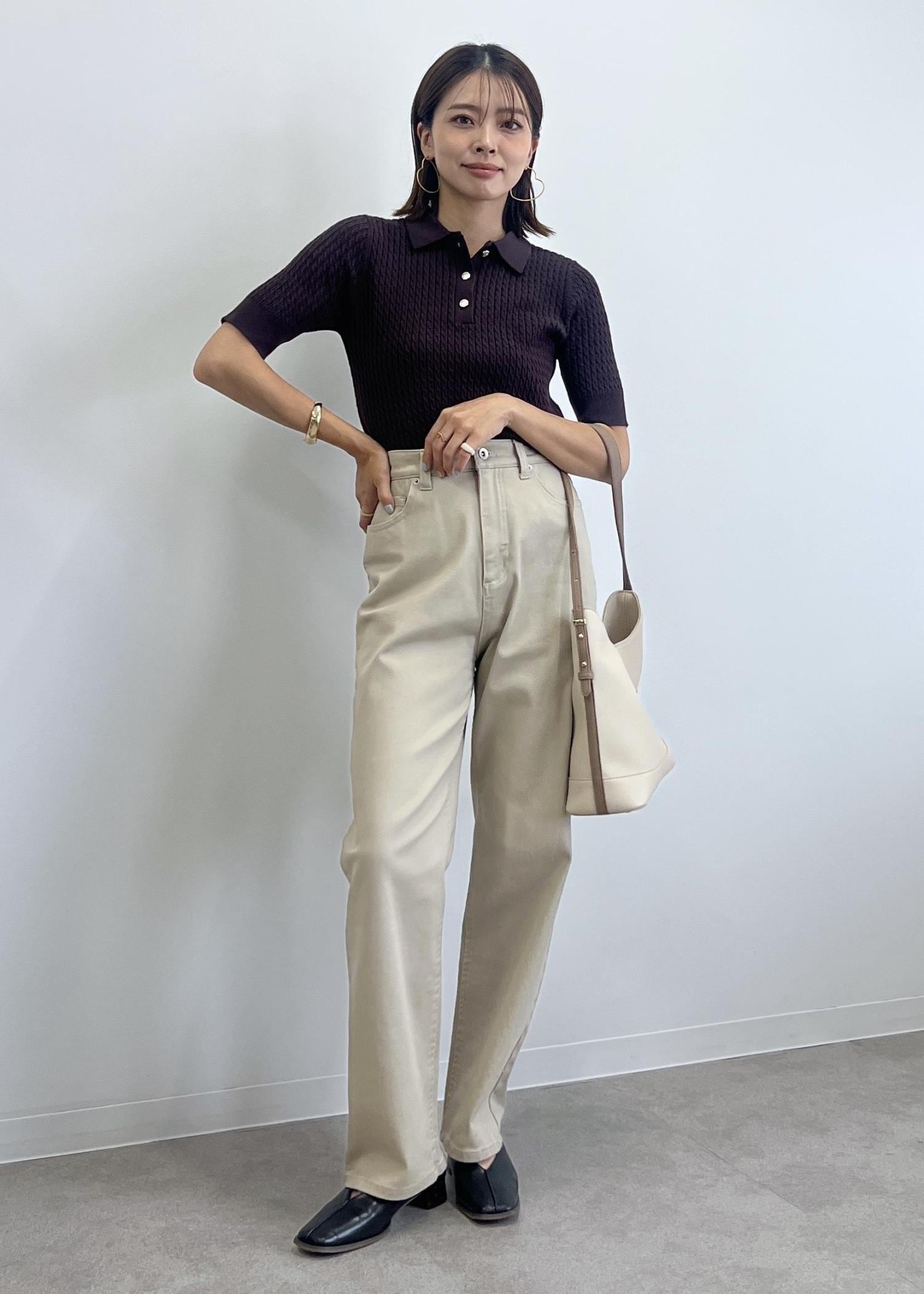 ブラウンのポロニットは、コンパクトなシルエットでシンプルコーデにおすすめアイテム。