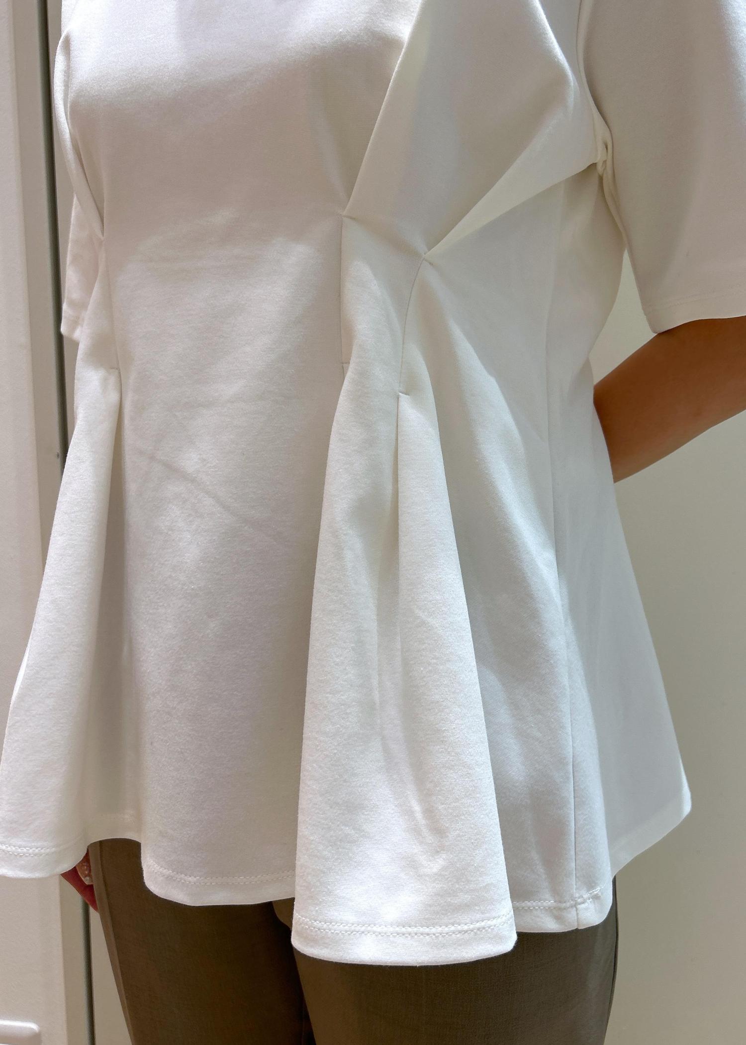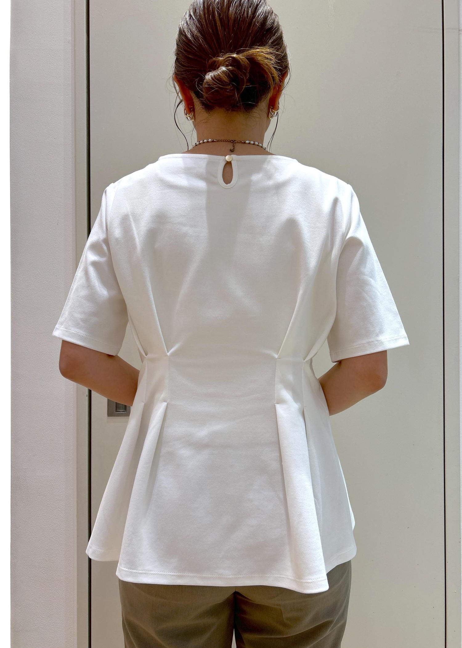 伸縮性があり、二の腕カバーしてくれるトップスはペプラムシルエットで細見え効果抜群でとってもおすすめです◎