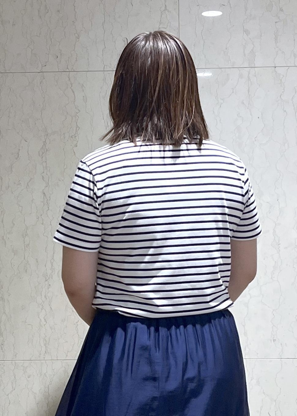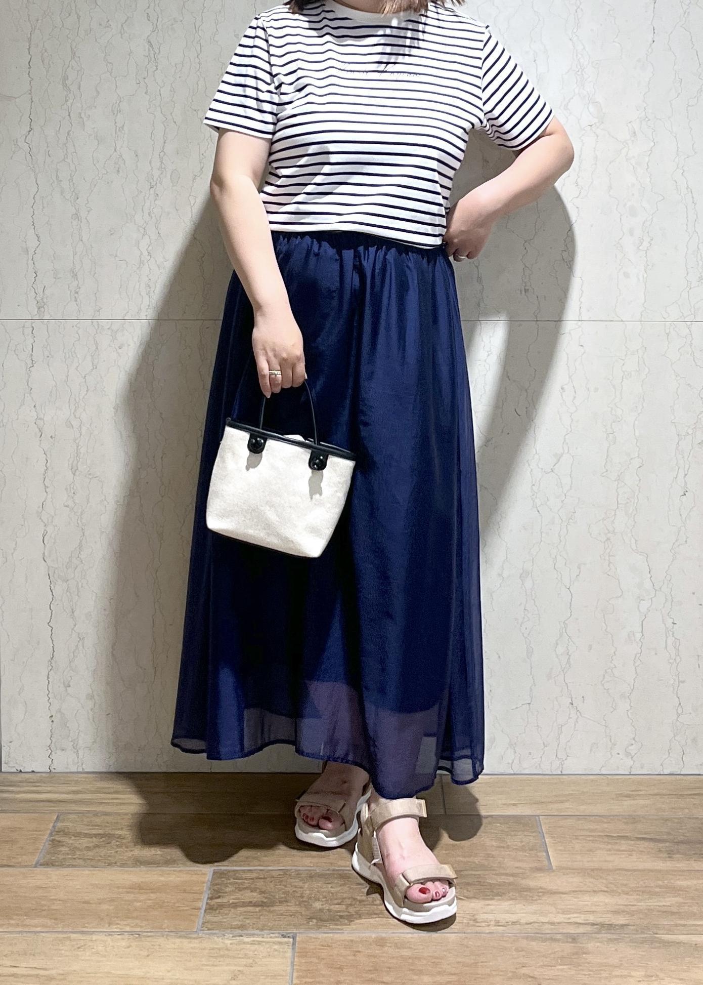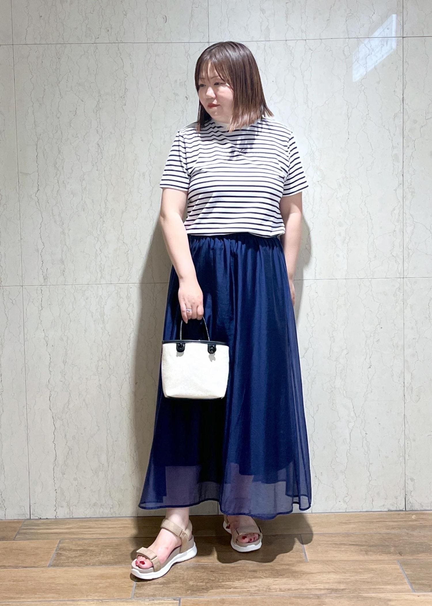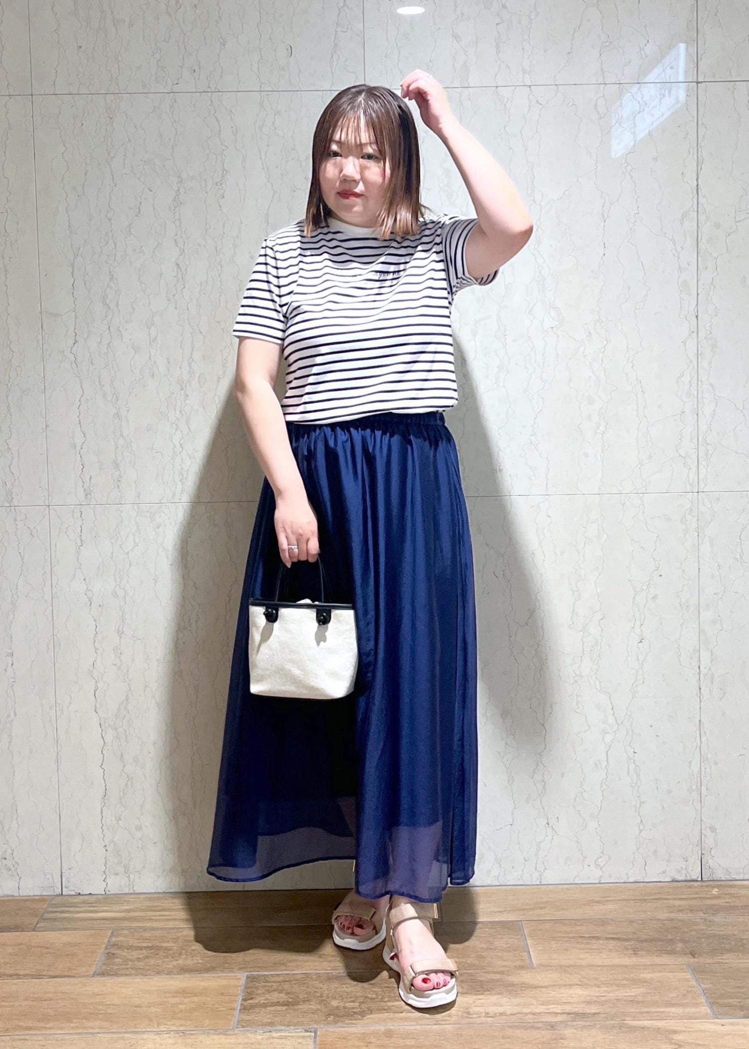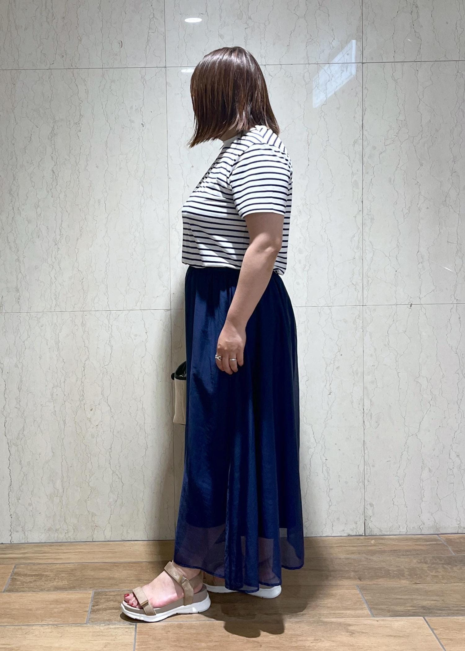 ボーダーTシャツにブルースカートを合わせた夏にピッタリなコーディネートです。