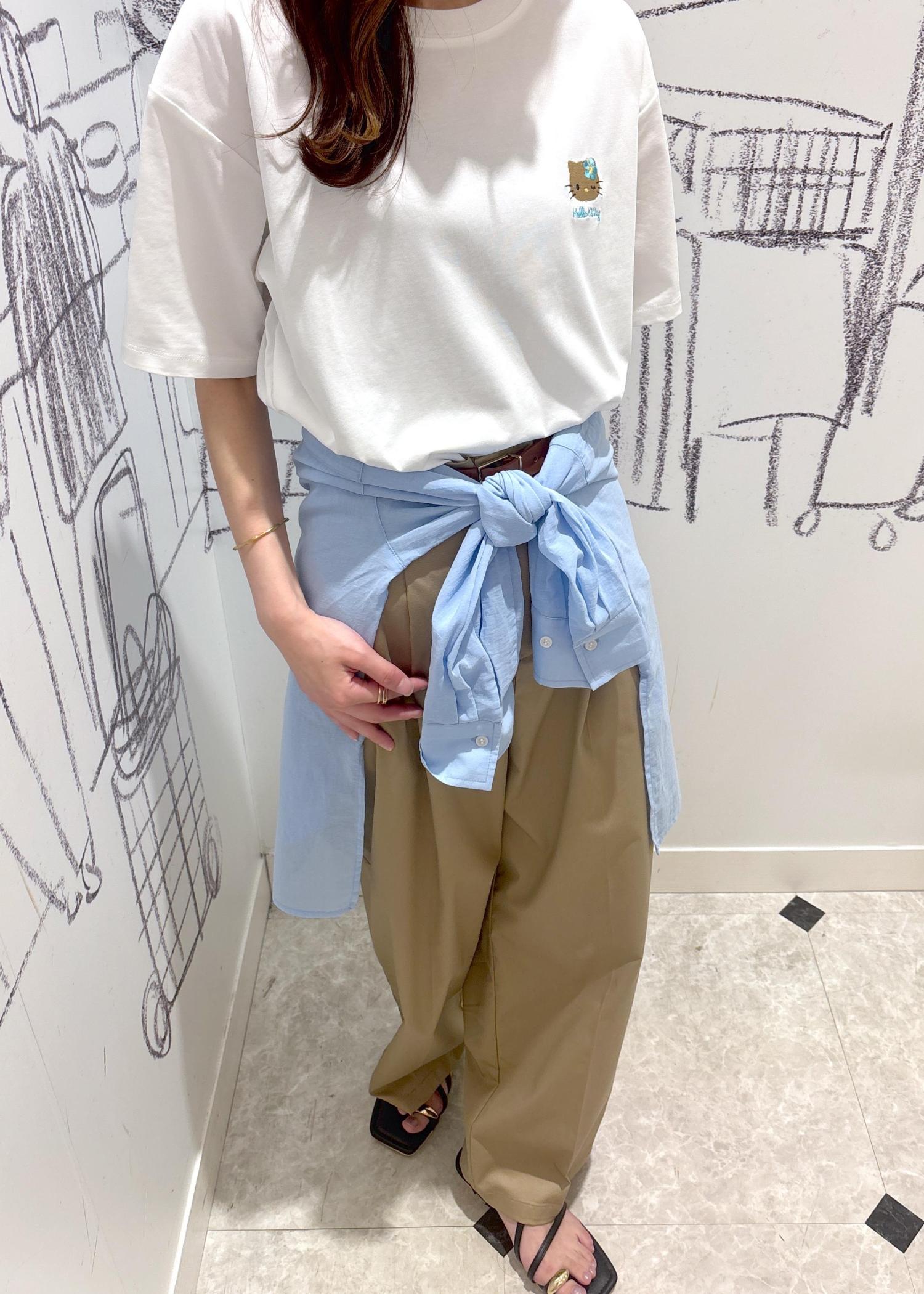 ロペピクニックと日焼けハローキティのコラボアイテムをチノパンツと合わせたカジュアルなコーディネートです。