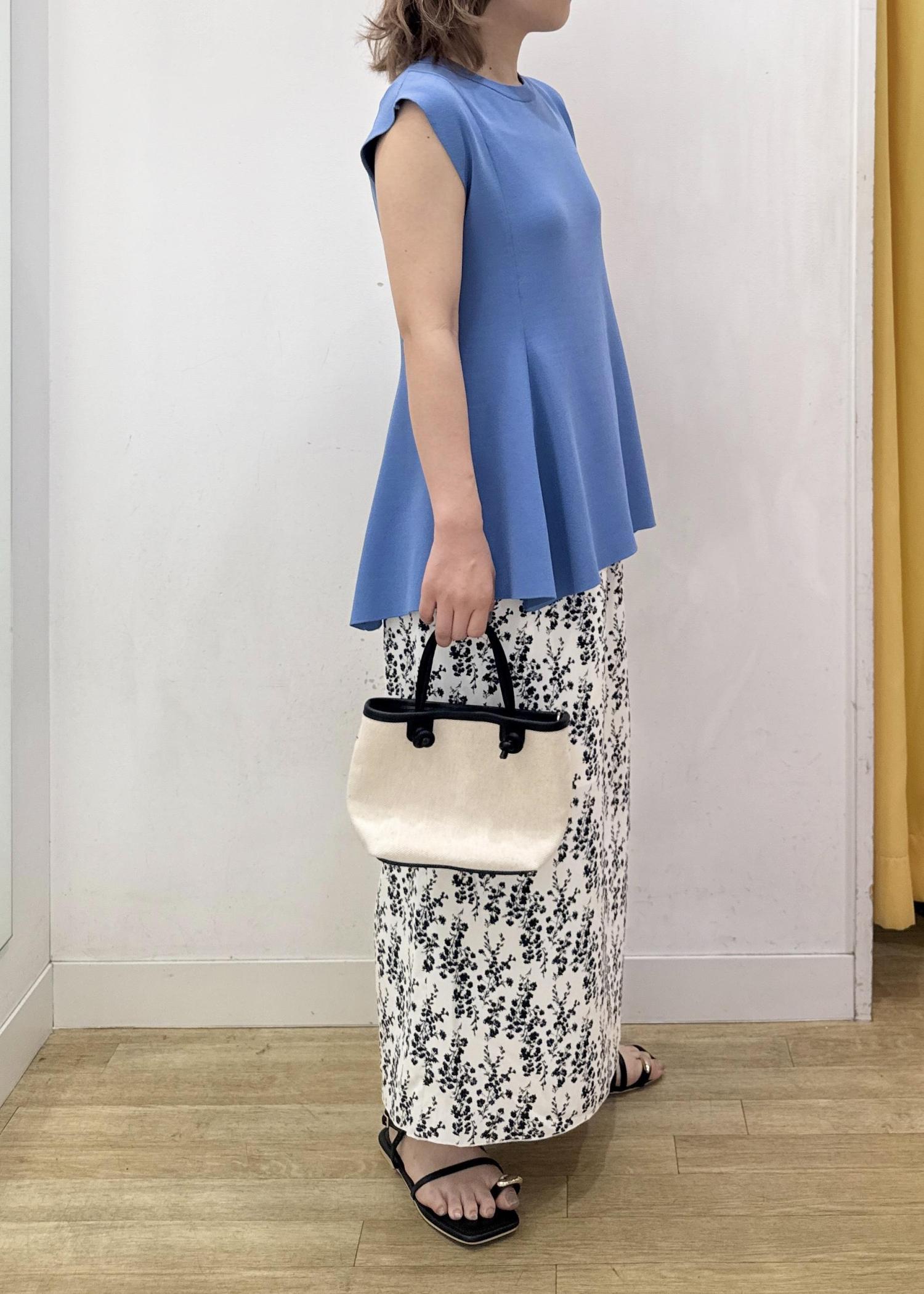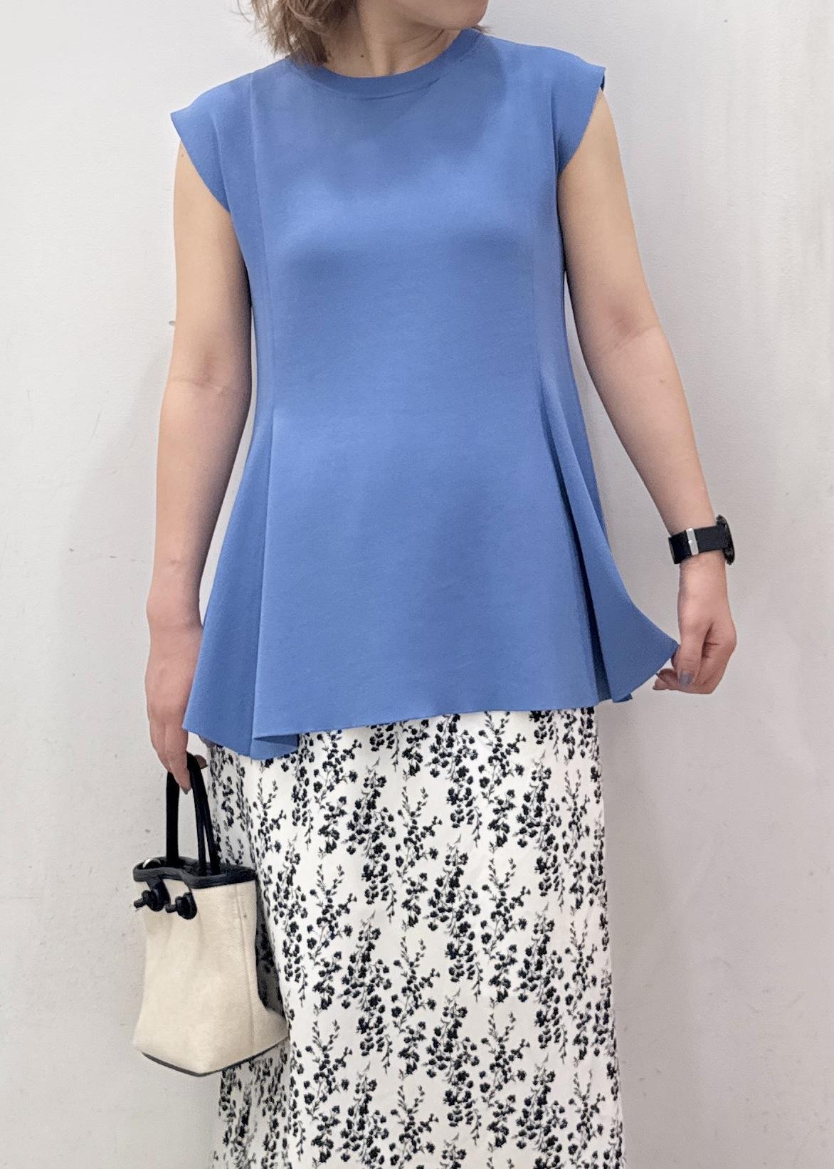 涼しげな印象のブルーカラーのニットは、ペプラムシルエットでヒップまわりをカバーしつつオシャレに☺︎