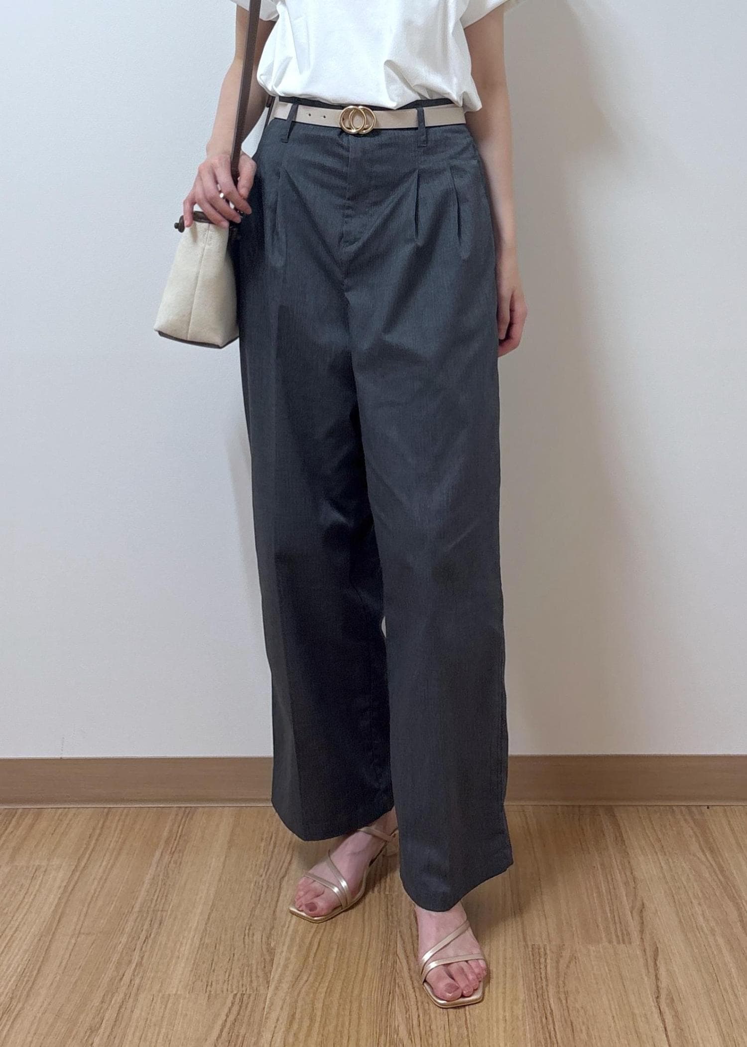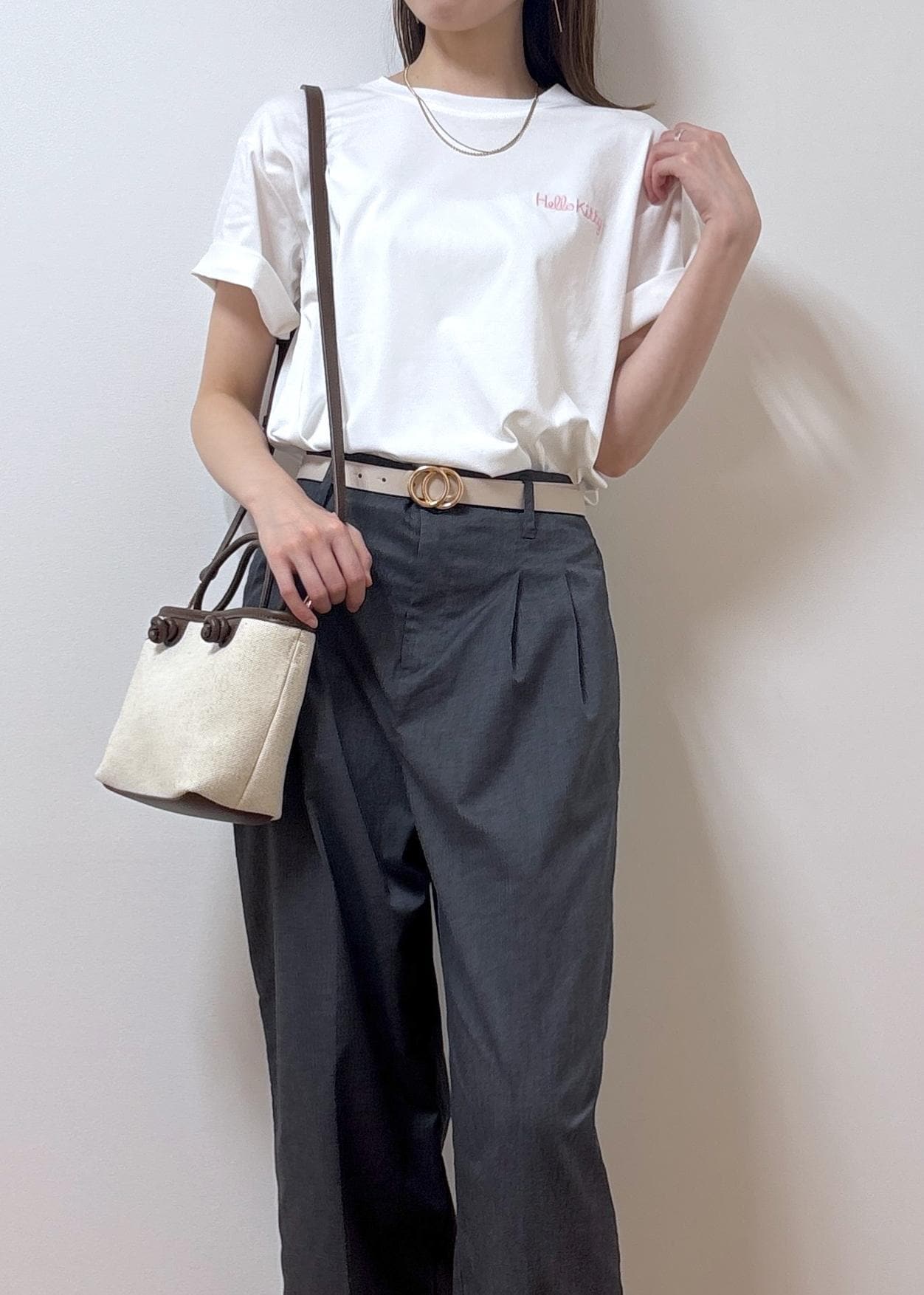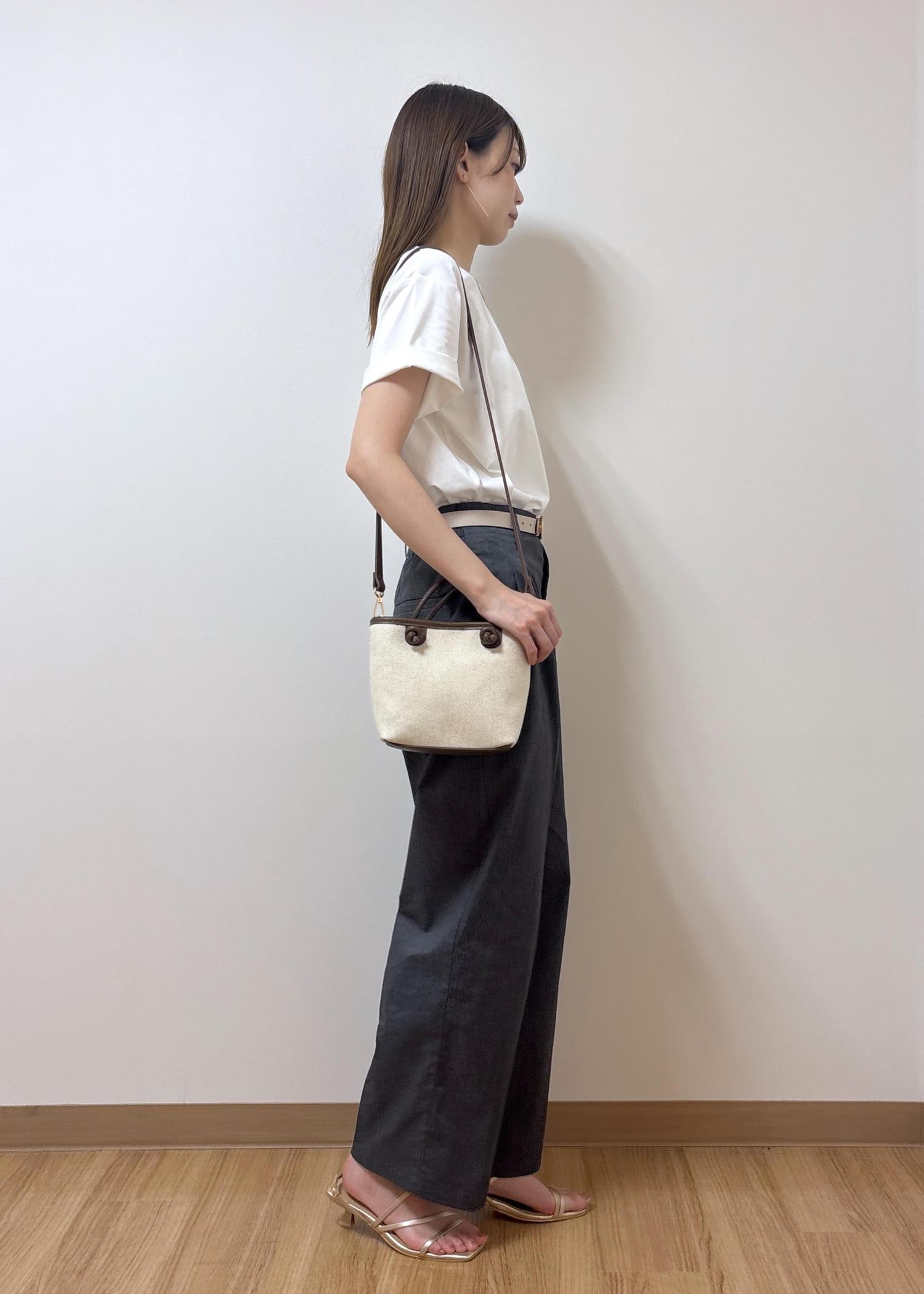 ゆったりめのTシャツなので、トップスはパンツにインしてスッキリとした印象にしました。