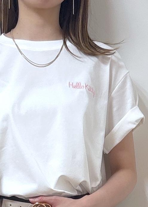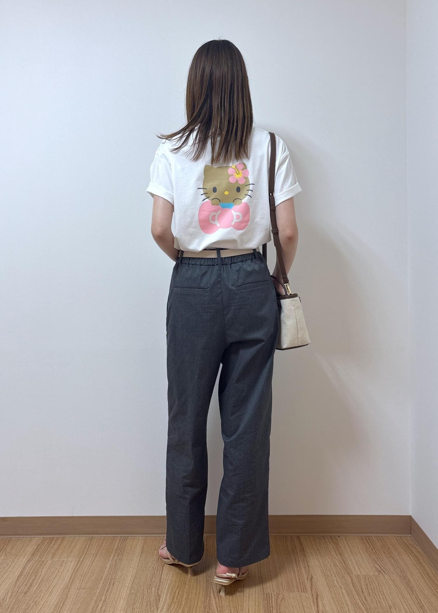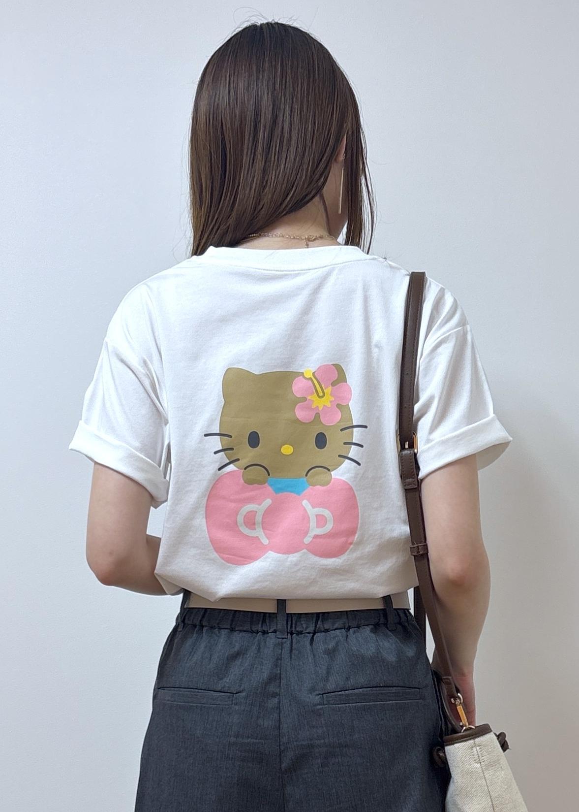 バックスタイルがとっても可愛い日焼けハローキティのトップスをシンプルに合わせたコーディネートです。