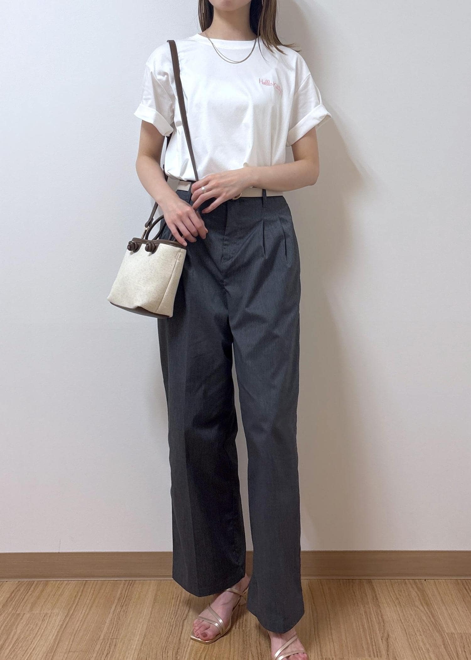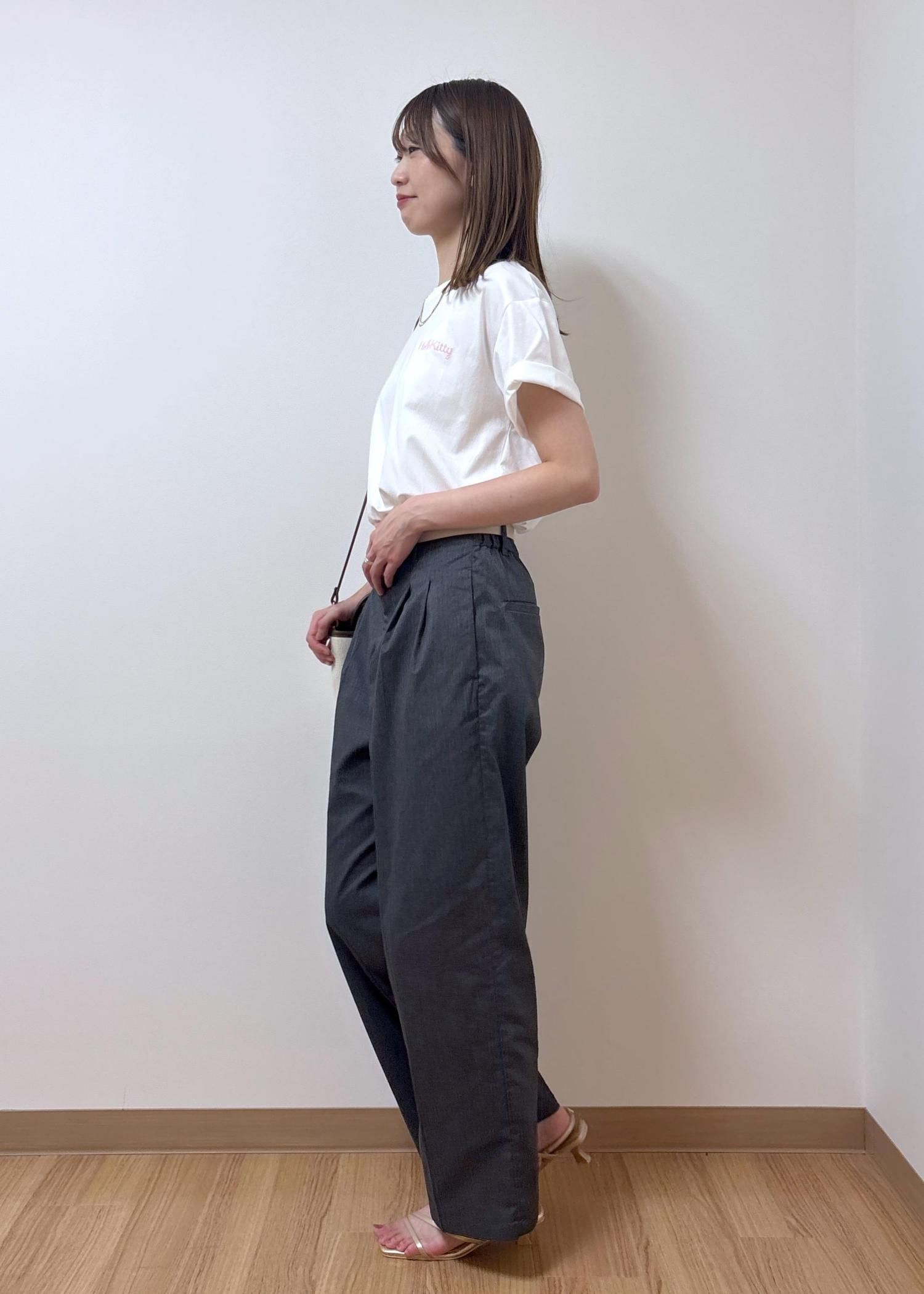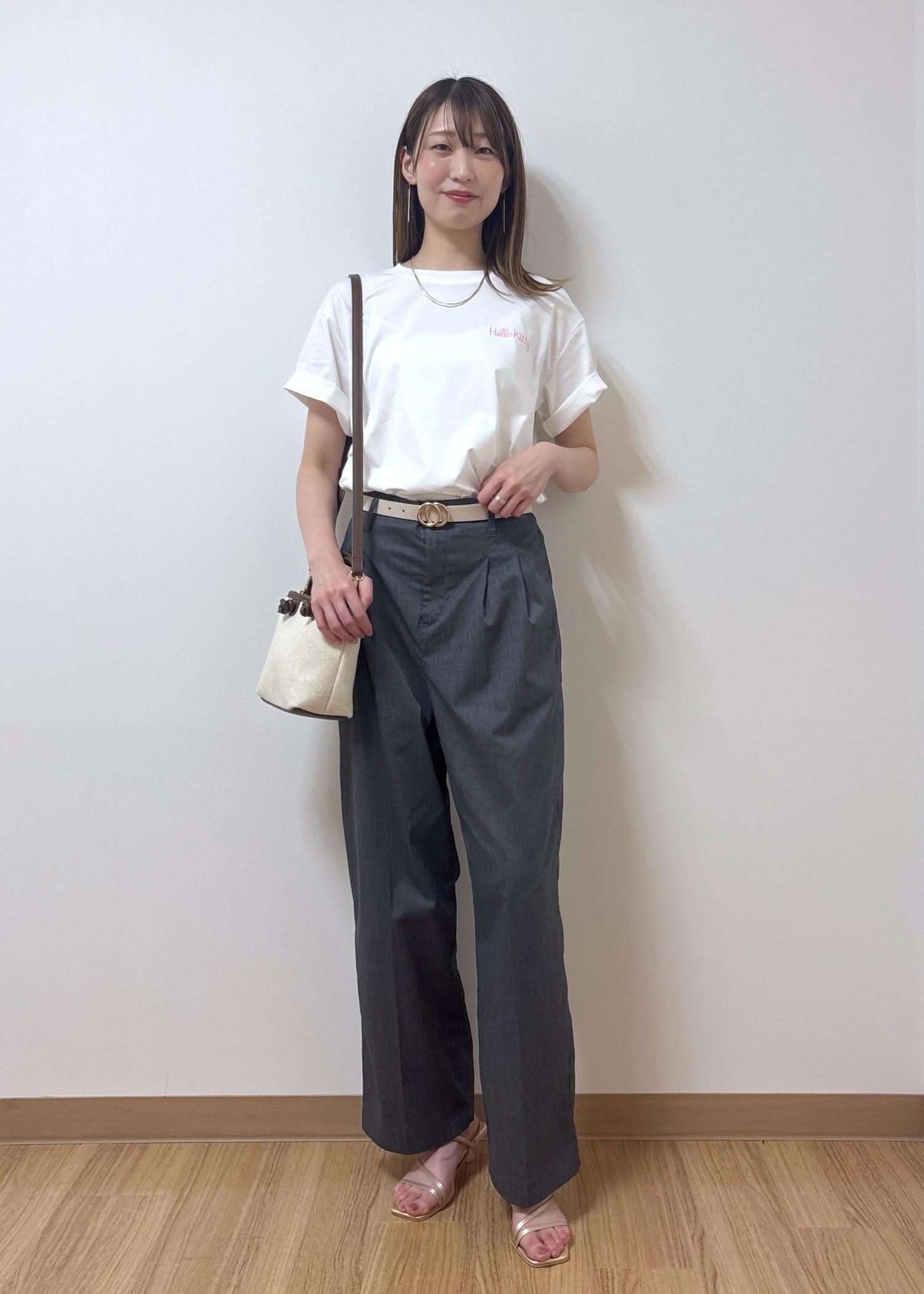 バックスタイルがとっても可愛い日焼けハローキティのトップスをシンプルに合わせたコーディネートです。