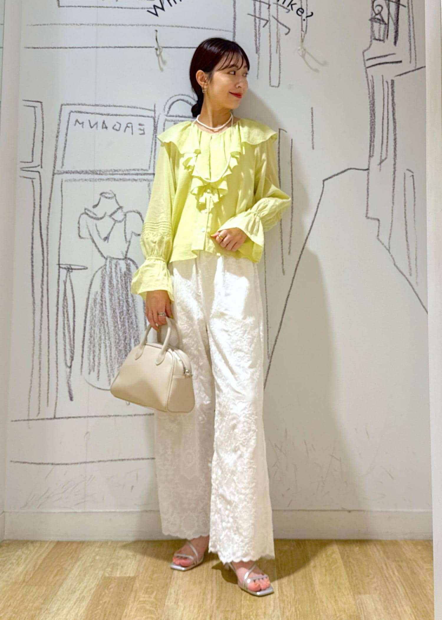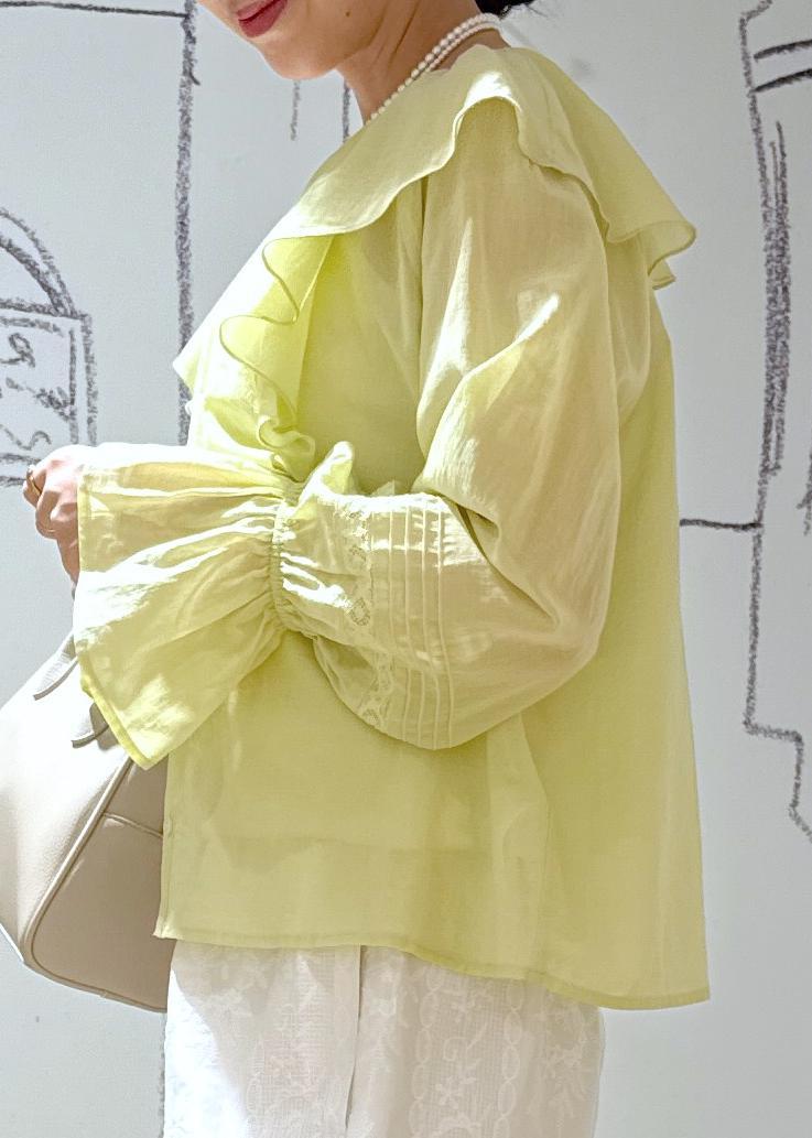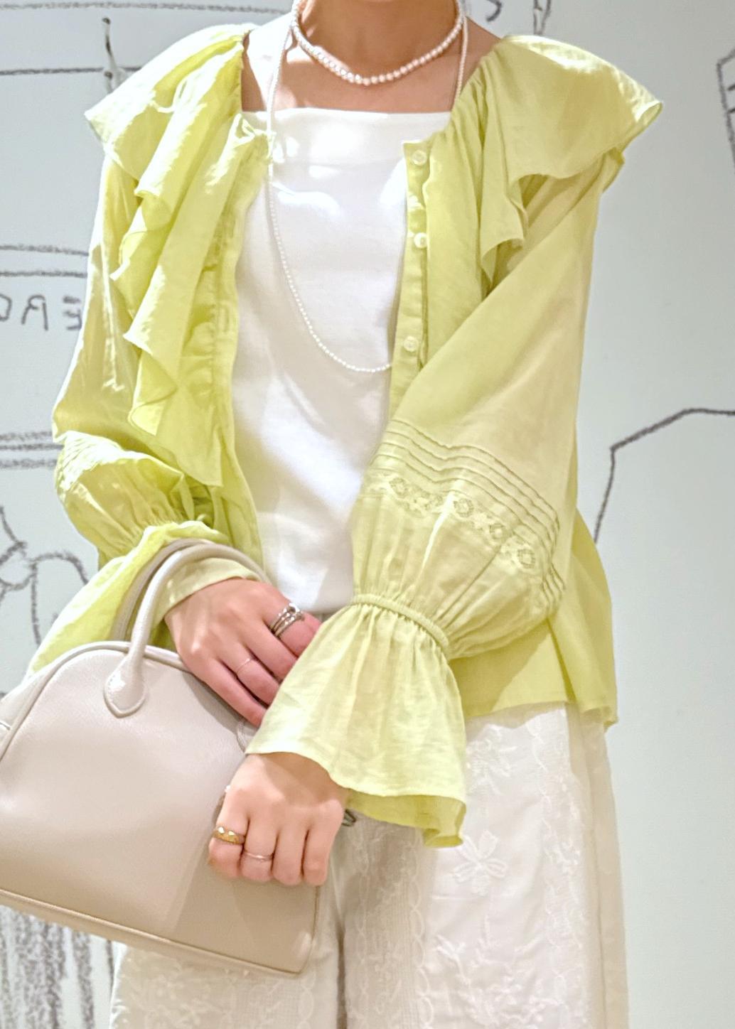 麻のような涼やかな見た目ですが綿素材なので優しい肌あたりです。シャツのパリッと感はなく、ガーゼのような軽さと柔らかさがあります。デコルテラインが上品に見える開き具合とフリル使いで華やかさ抜群です。