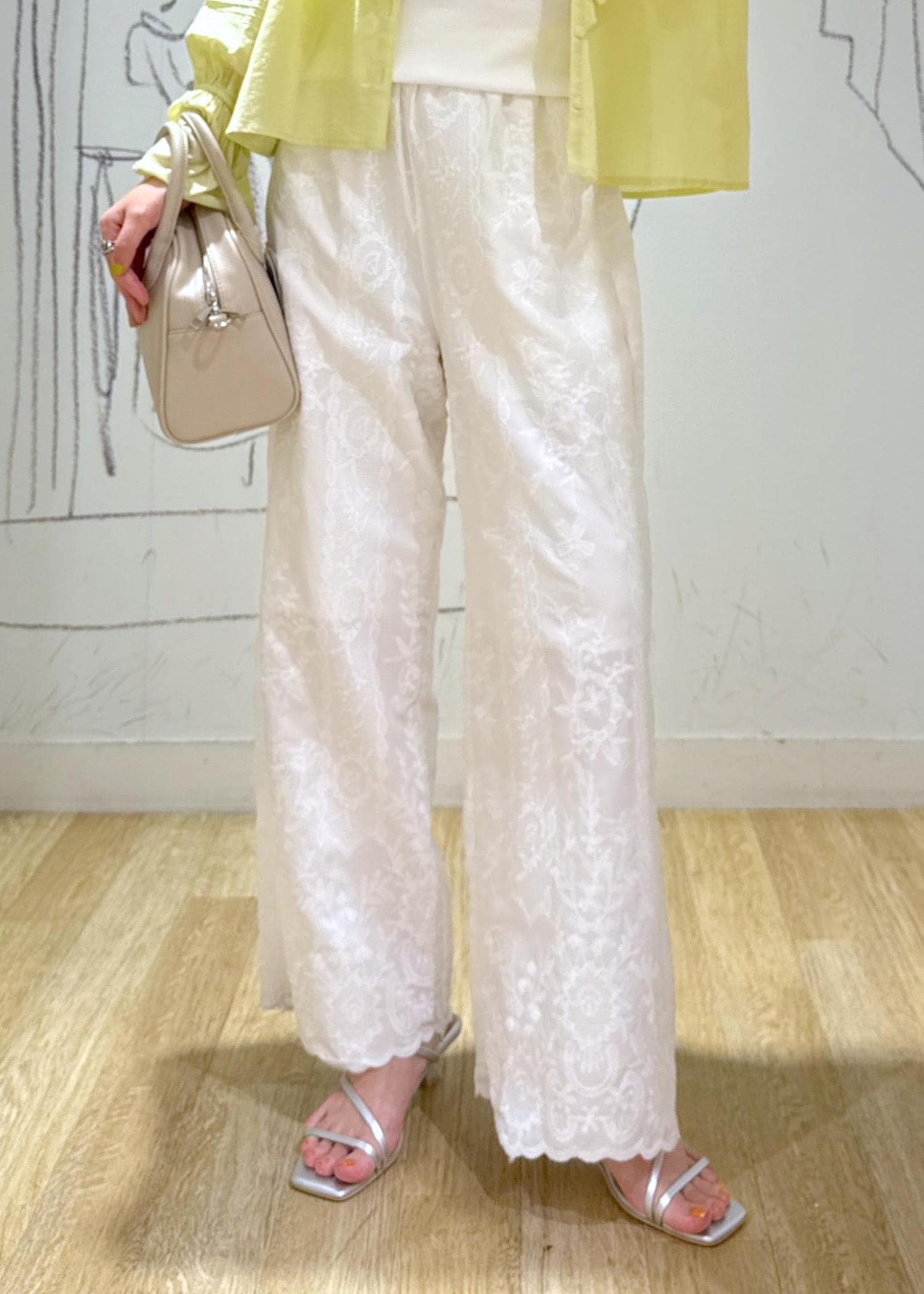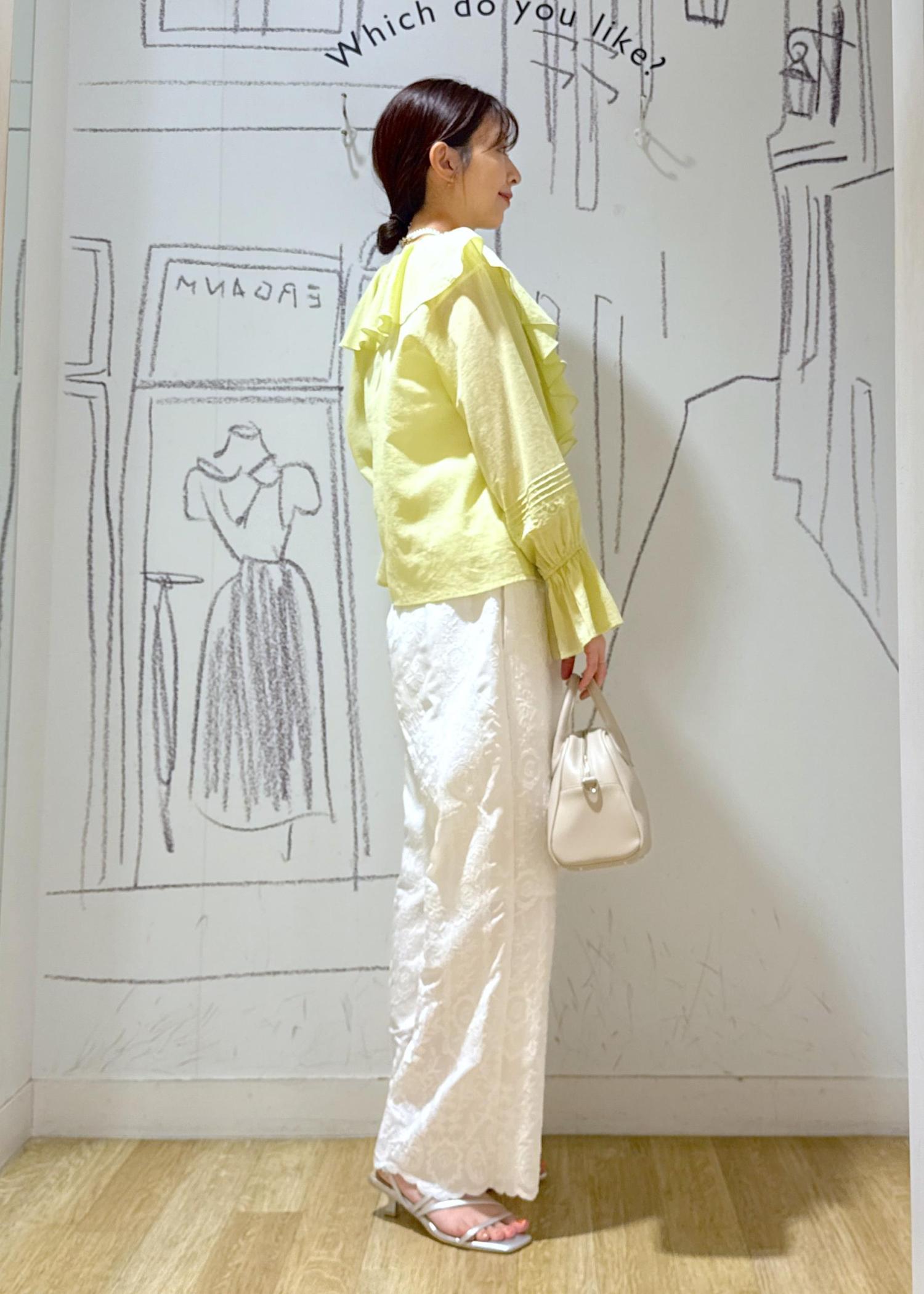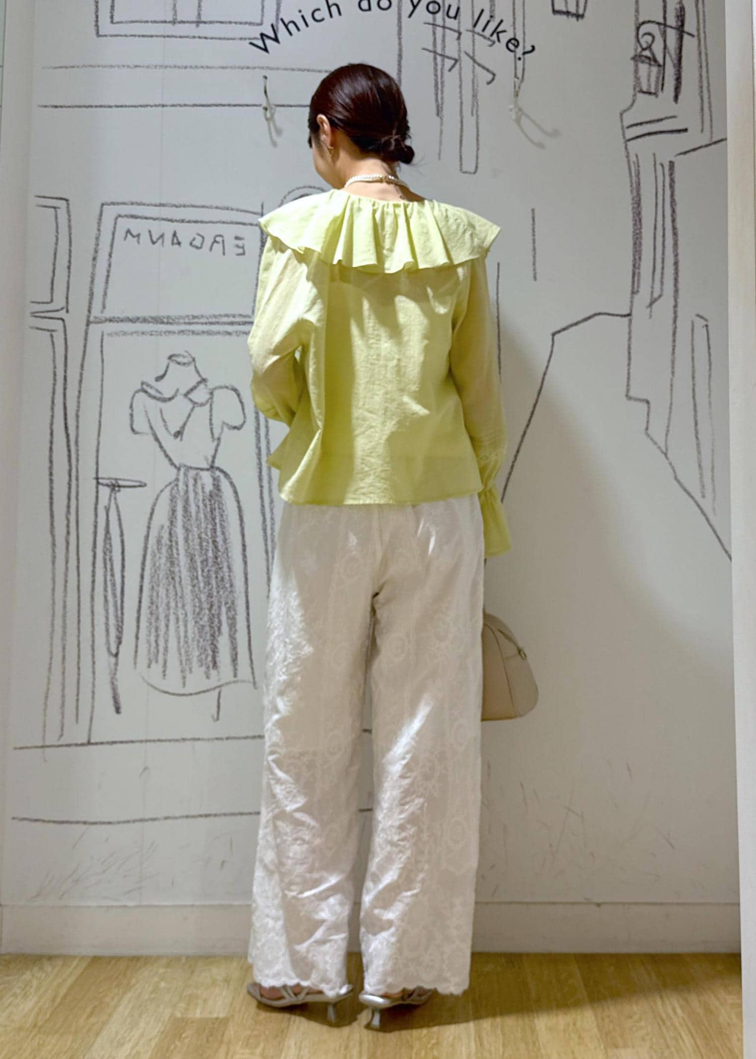 麻のような涼やかな見た目ですが綿素材なので優しい肌あたりです。シャツのパリッと感はなく、ガーゼのような軽さと柔らかさがあります。デコルテラインが上品に見える開き具合とフリル使いで華やかさ抜群です。