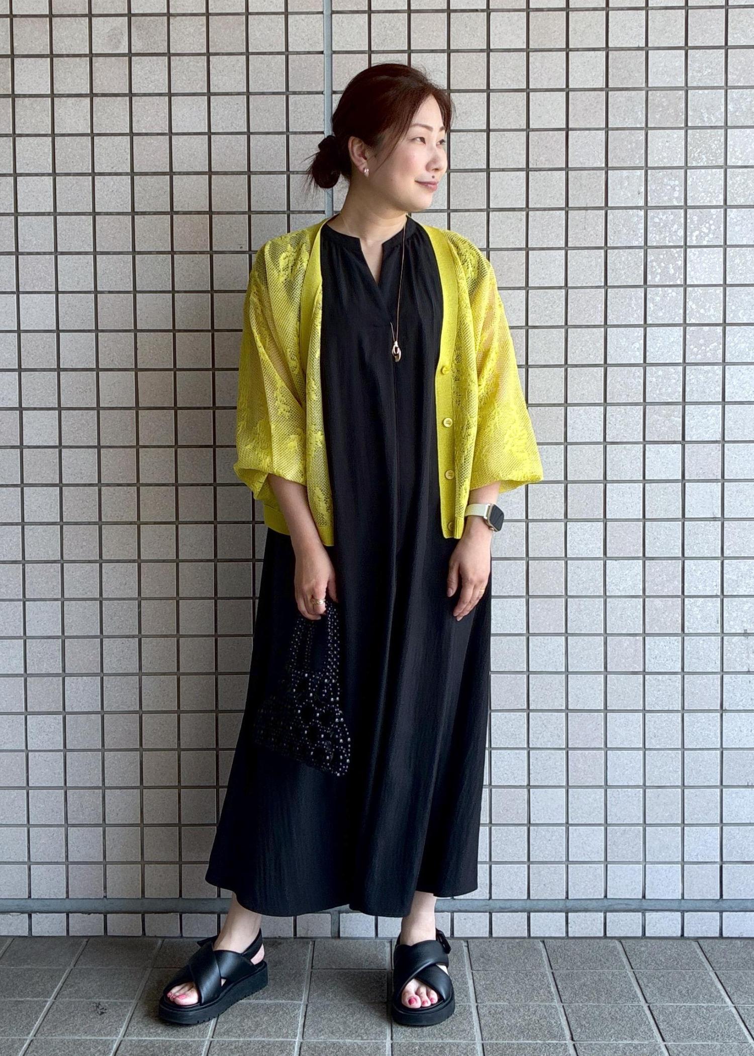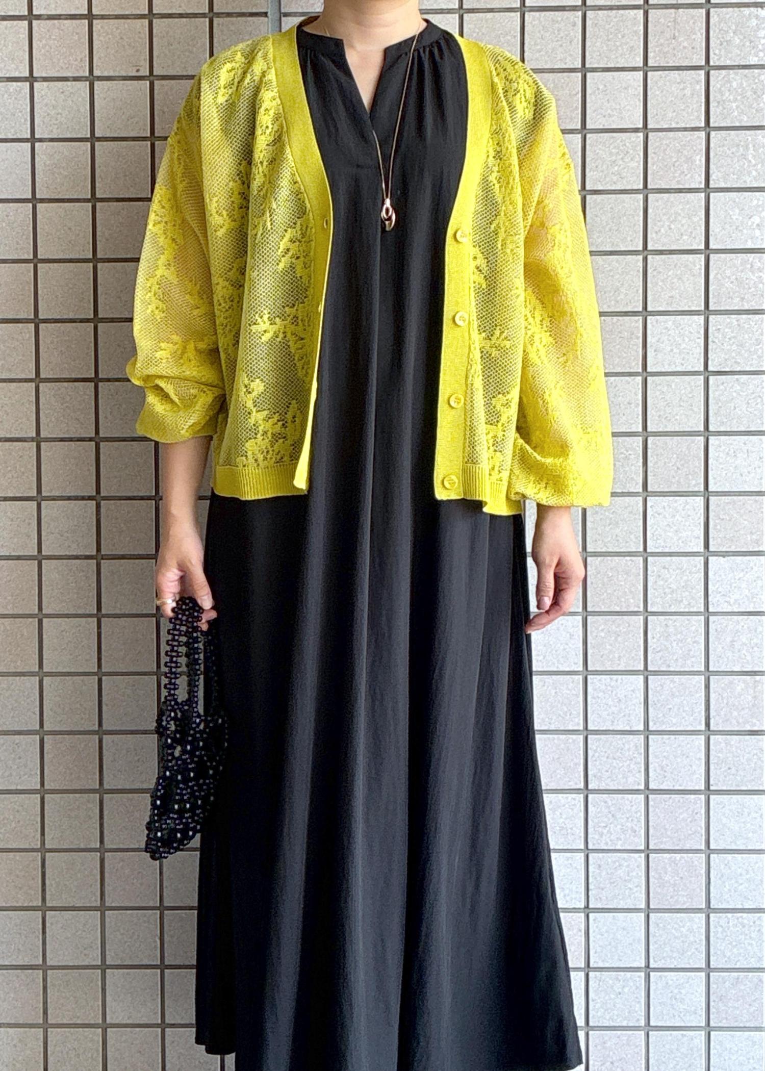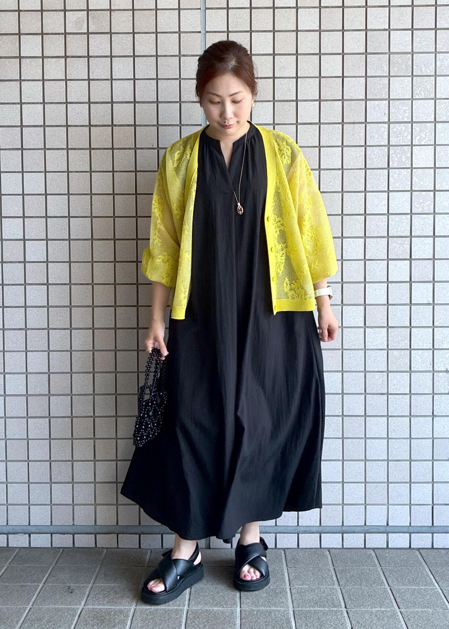 暗くなりすぎないように、差し色でイエローのカーディガンを合わせました☺︎
