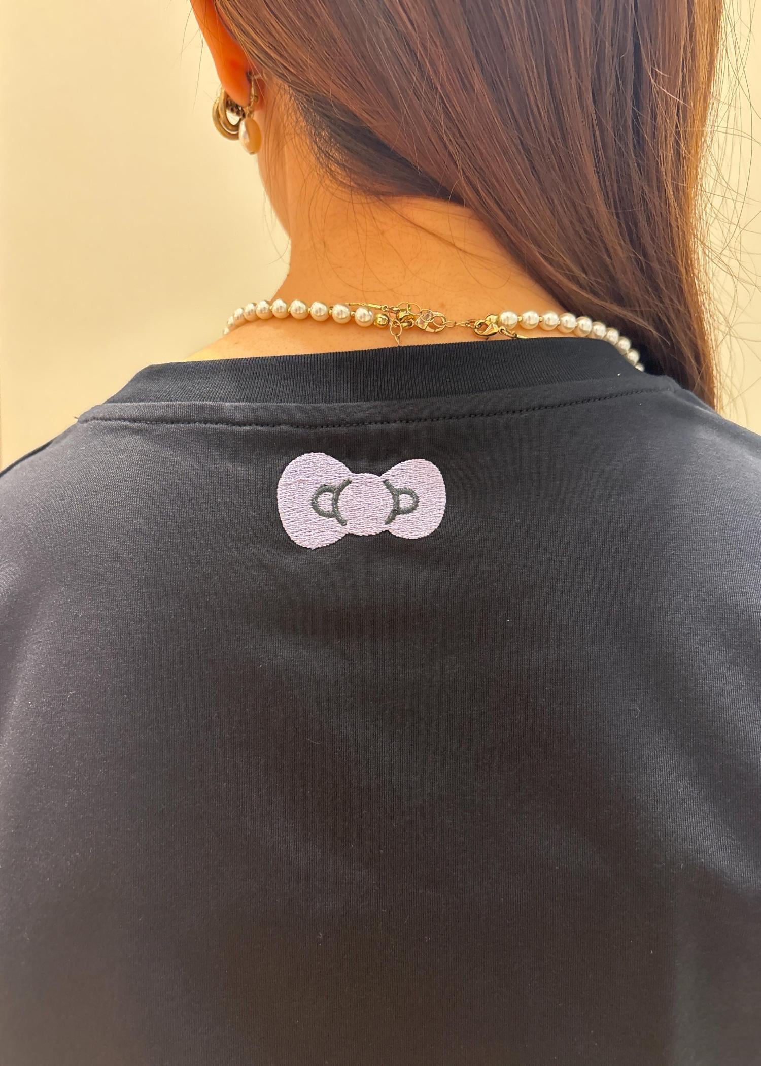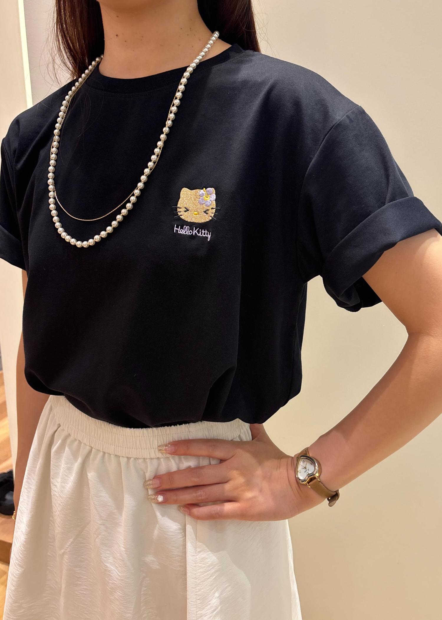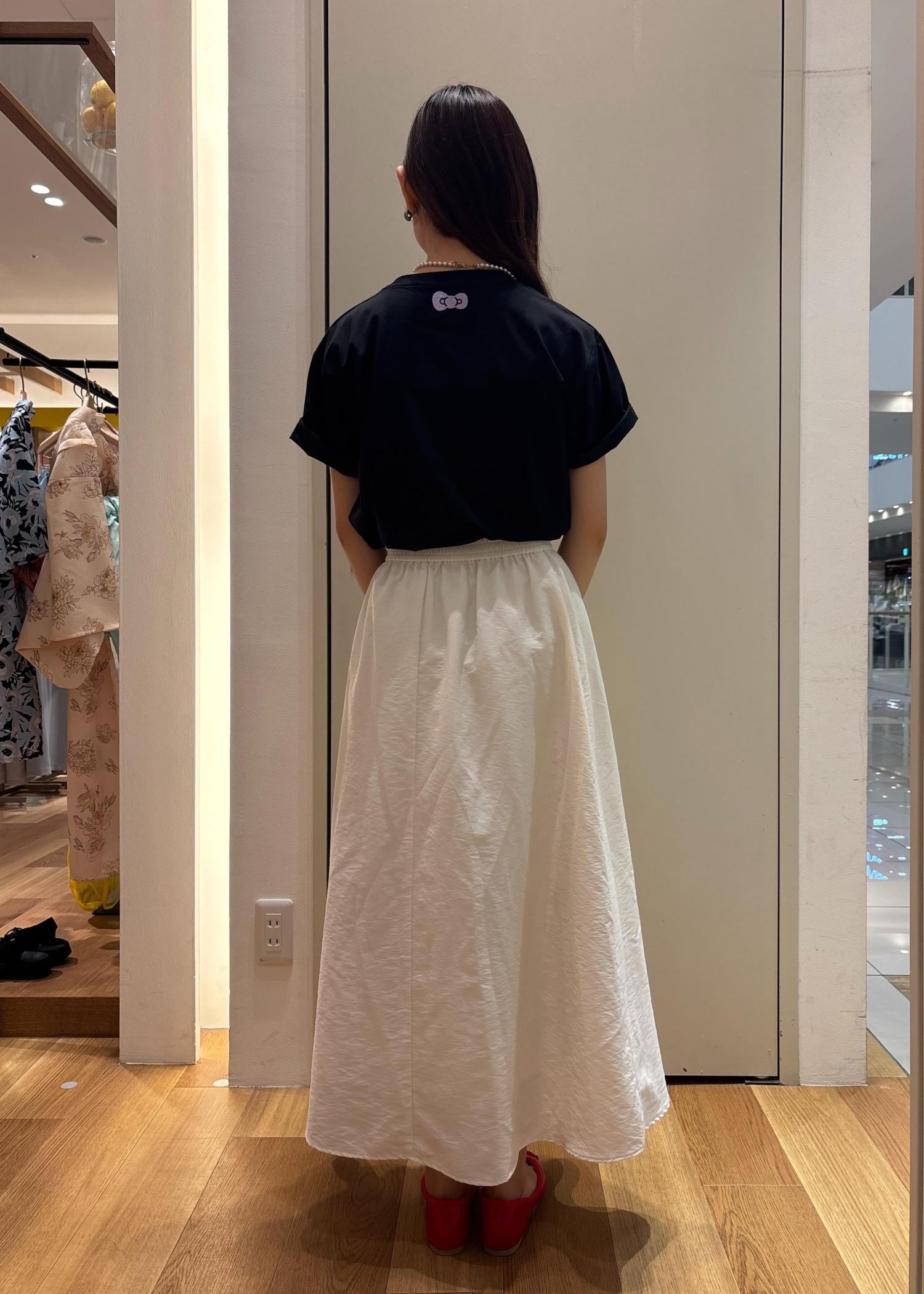 ハローキティの黒Tシャツに女性らしいフレアラインの白のスカートを合わせモノトーンでまとめました。