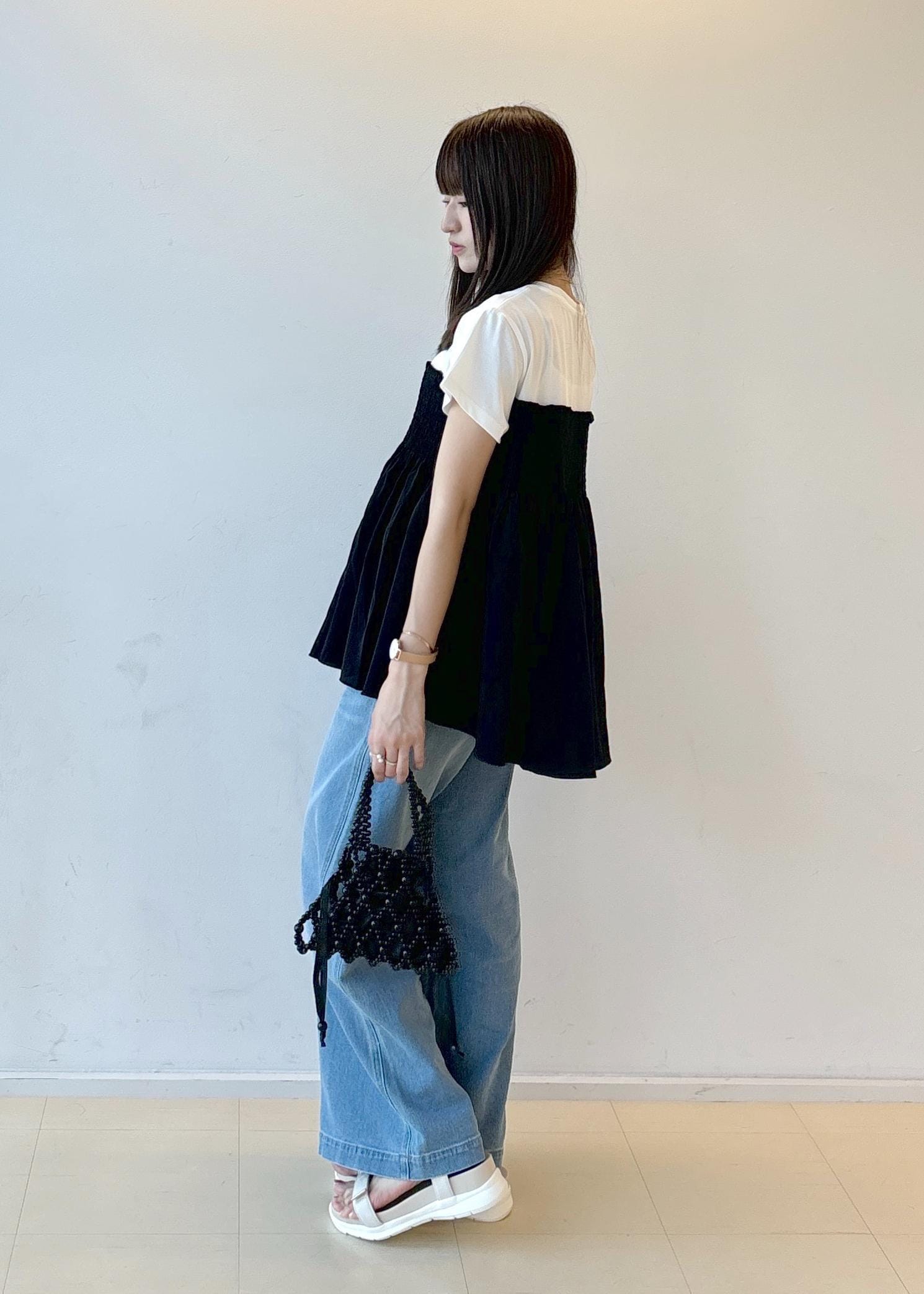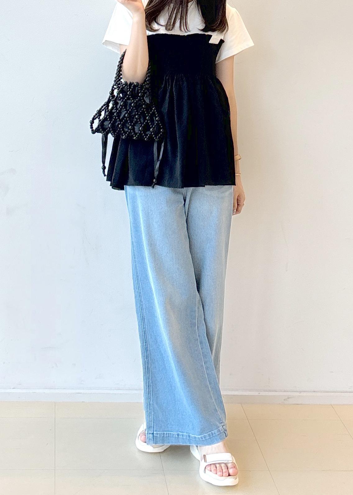 ふんわりとしたシルエットのトップスが夏らしさを感じさせてくれて、またビーズのついたバッグや人気サンダルを合わせて夏らしく涼し気なコーディネートにしてみました。