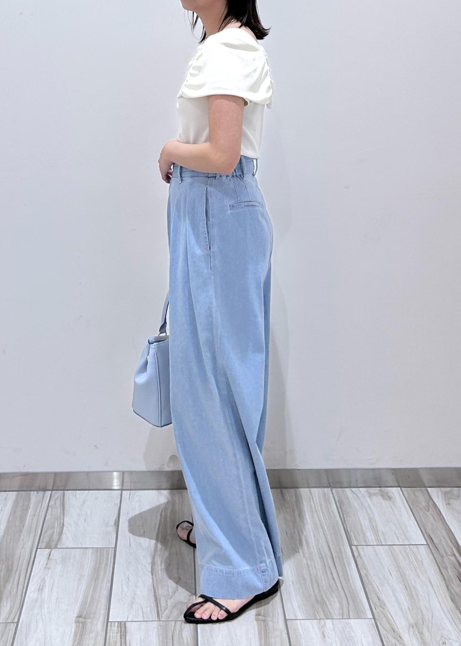 前の腰回りにタックがあることで体型カバーができるデニムです! -